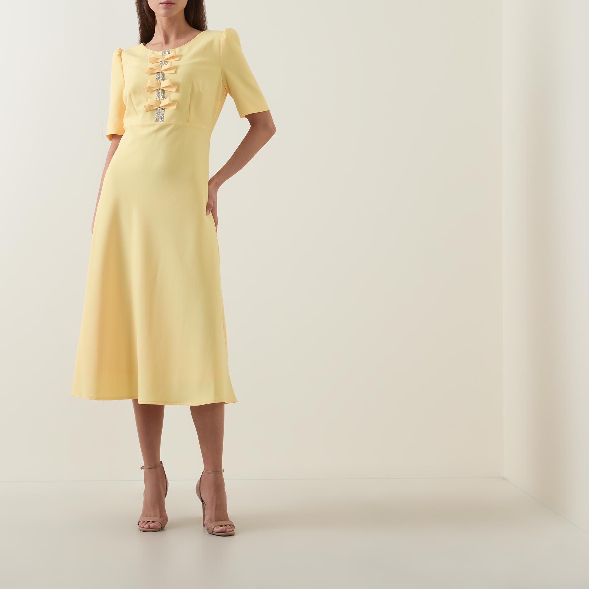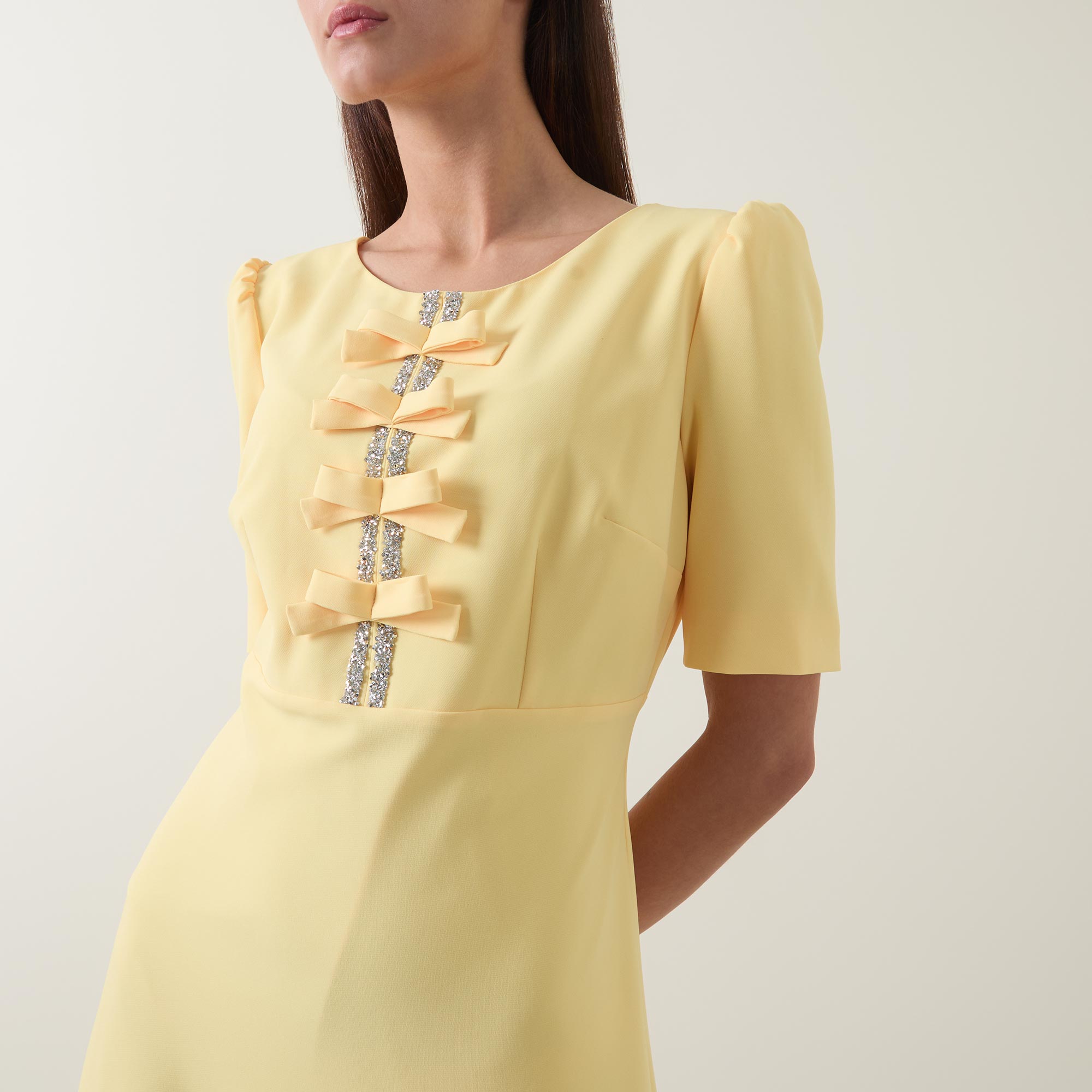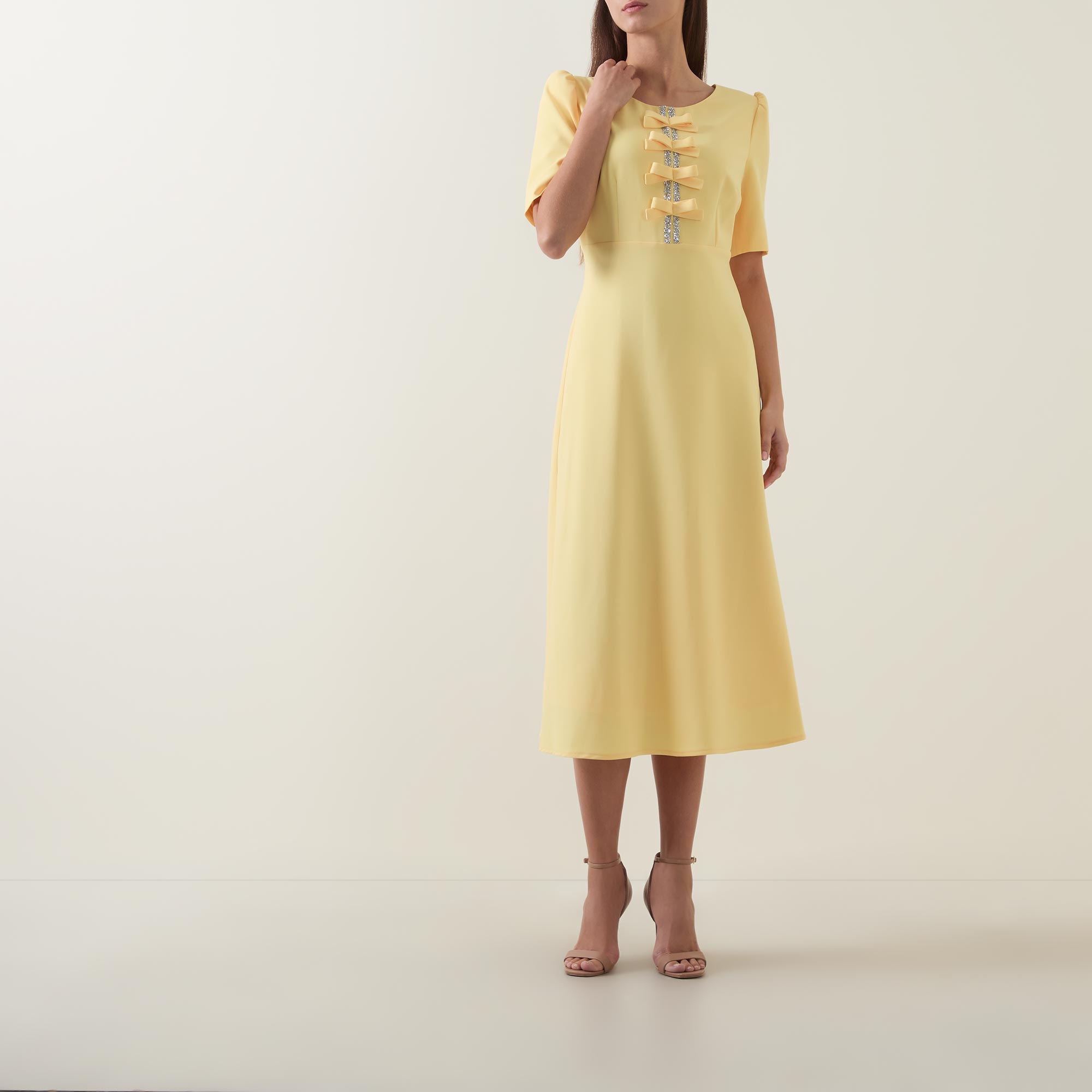 - Crew neck, puff shoulders, short sleeves, concealed rear zip fastening, bow detailing along the front, fitted through the waist, flared skirt, straight hem, lined, midi length