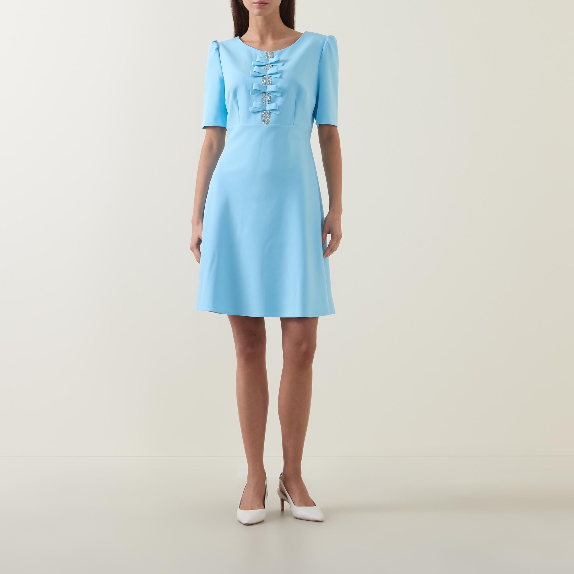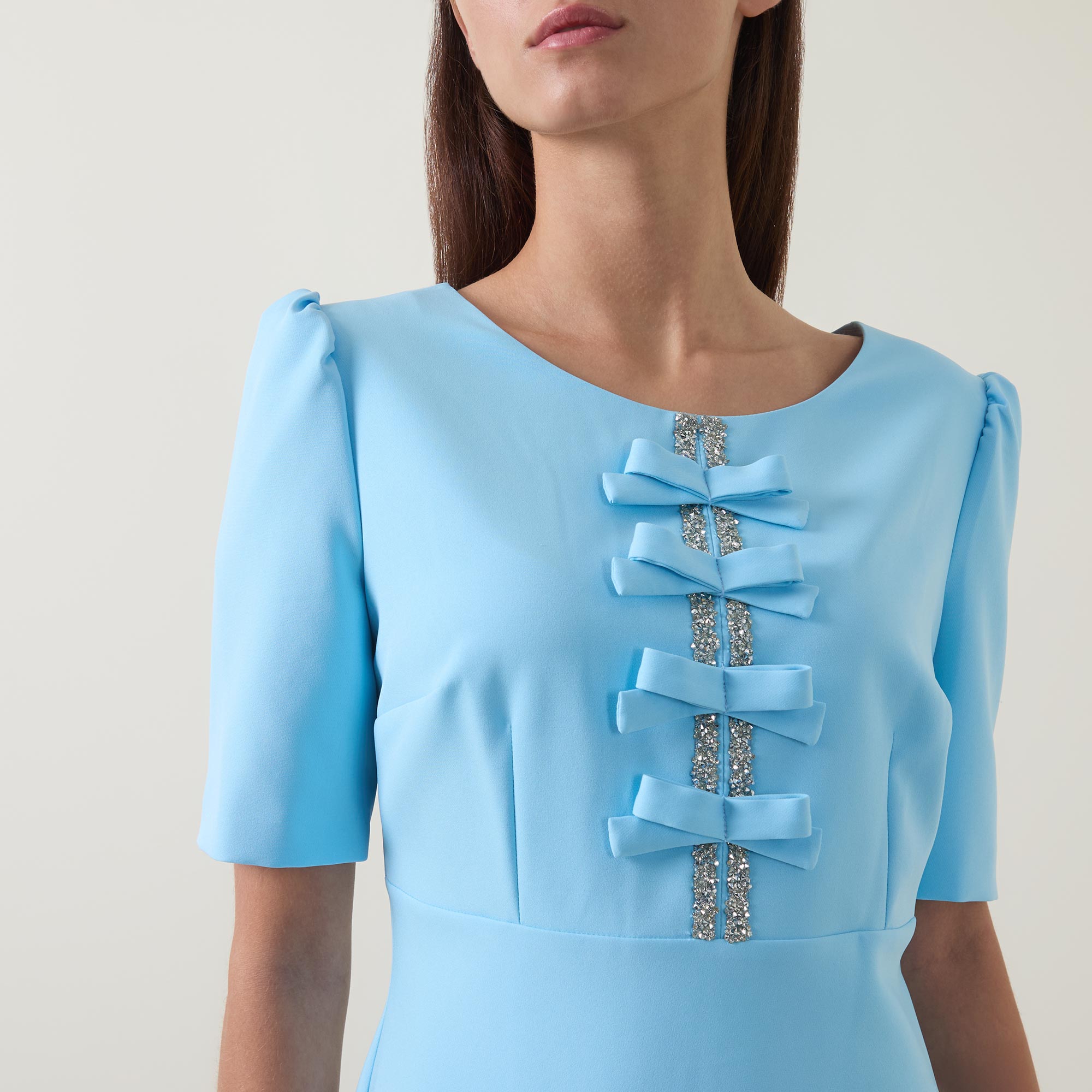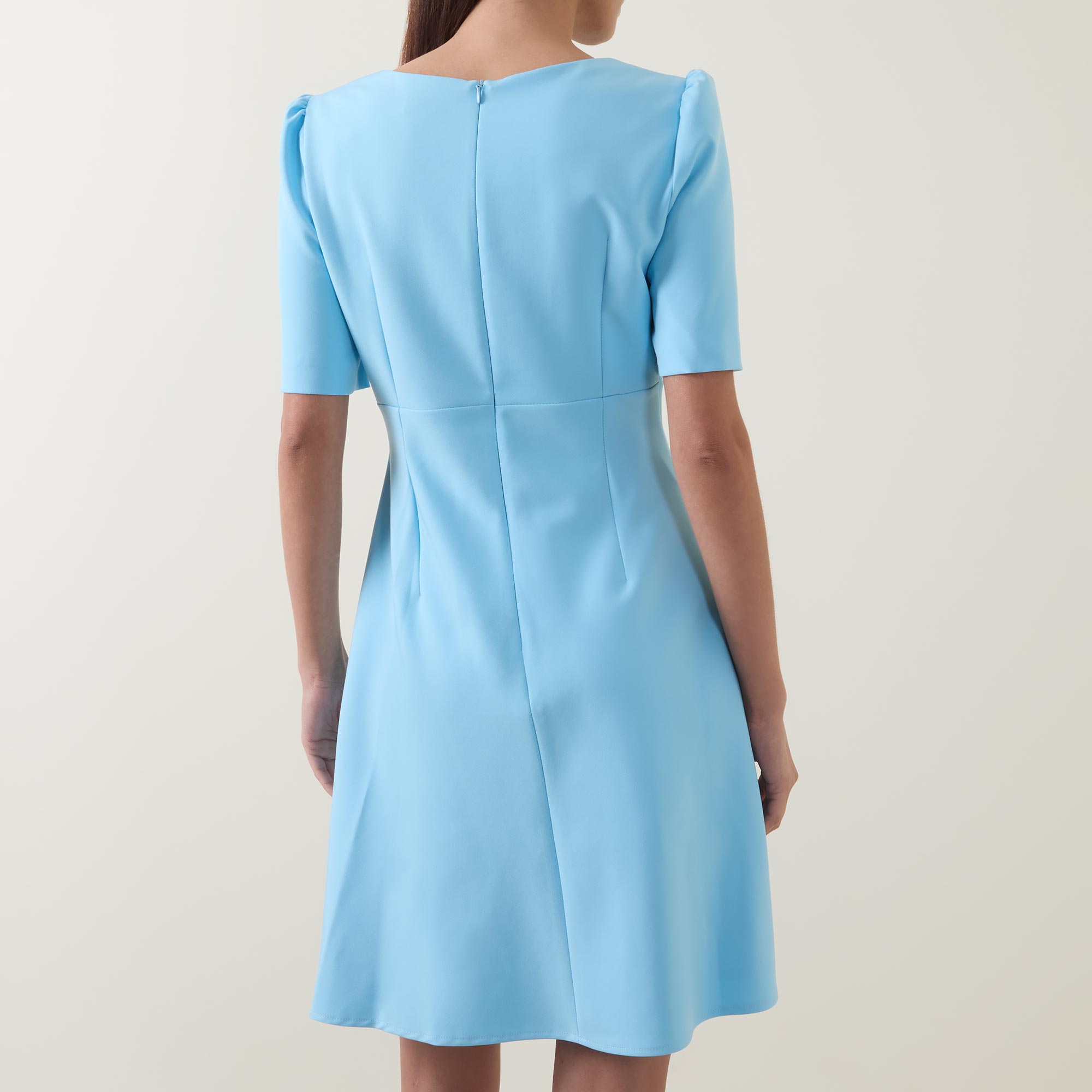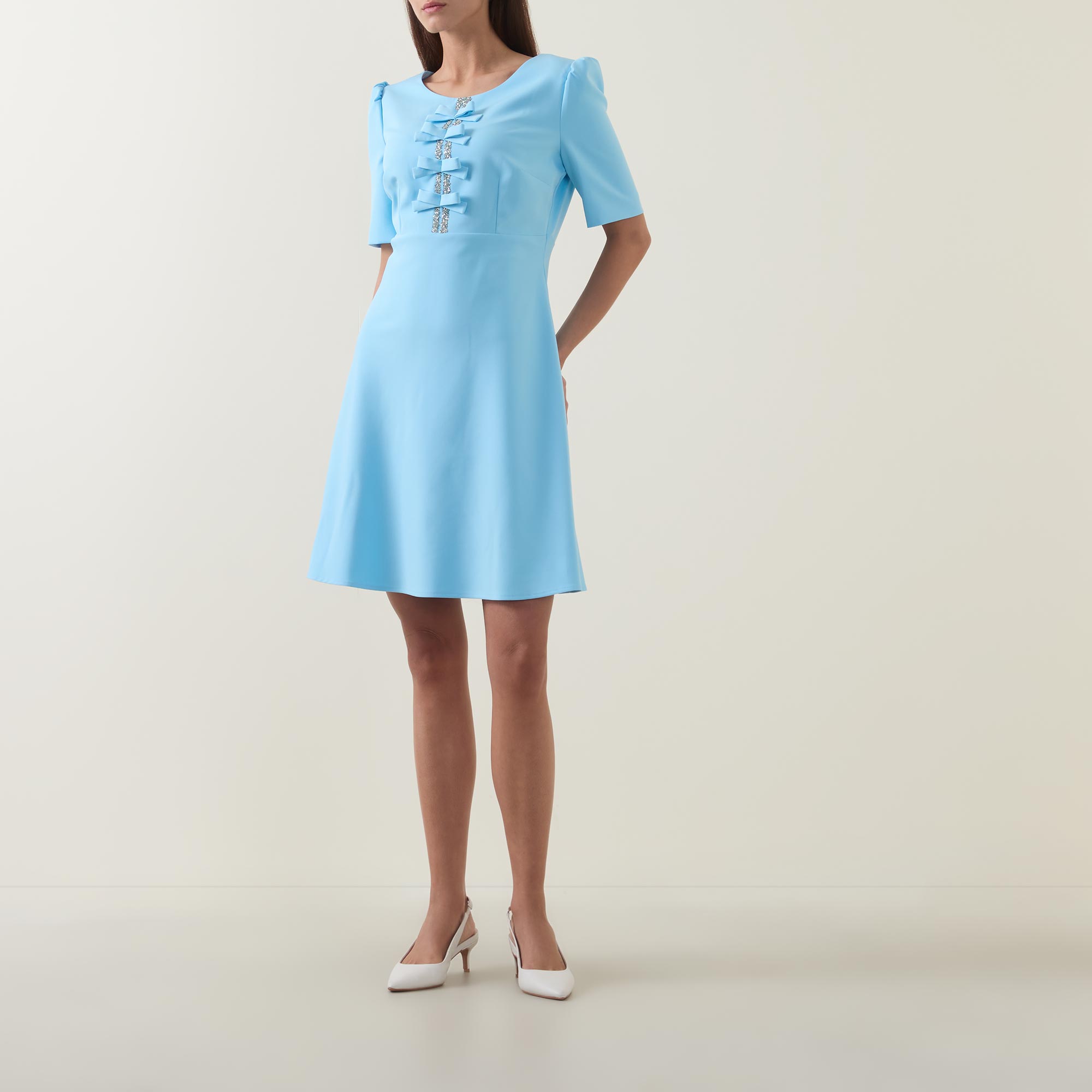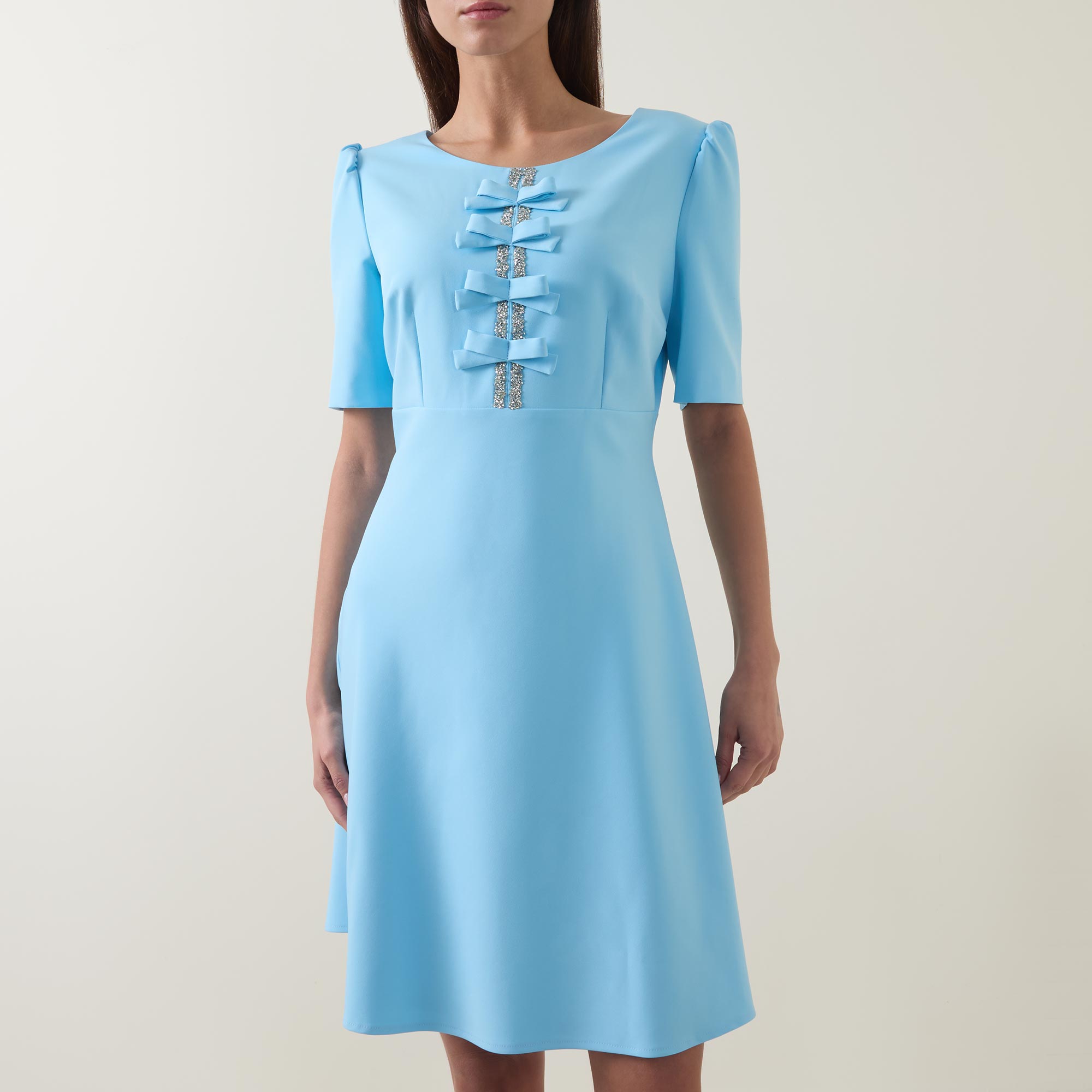 - Crew neck, puff shoulders, short sleeves, concealed rear zip fastening, bow detailing along the front, fitted through the waist, flared skirt, straight hem, lined, mini length
