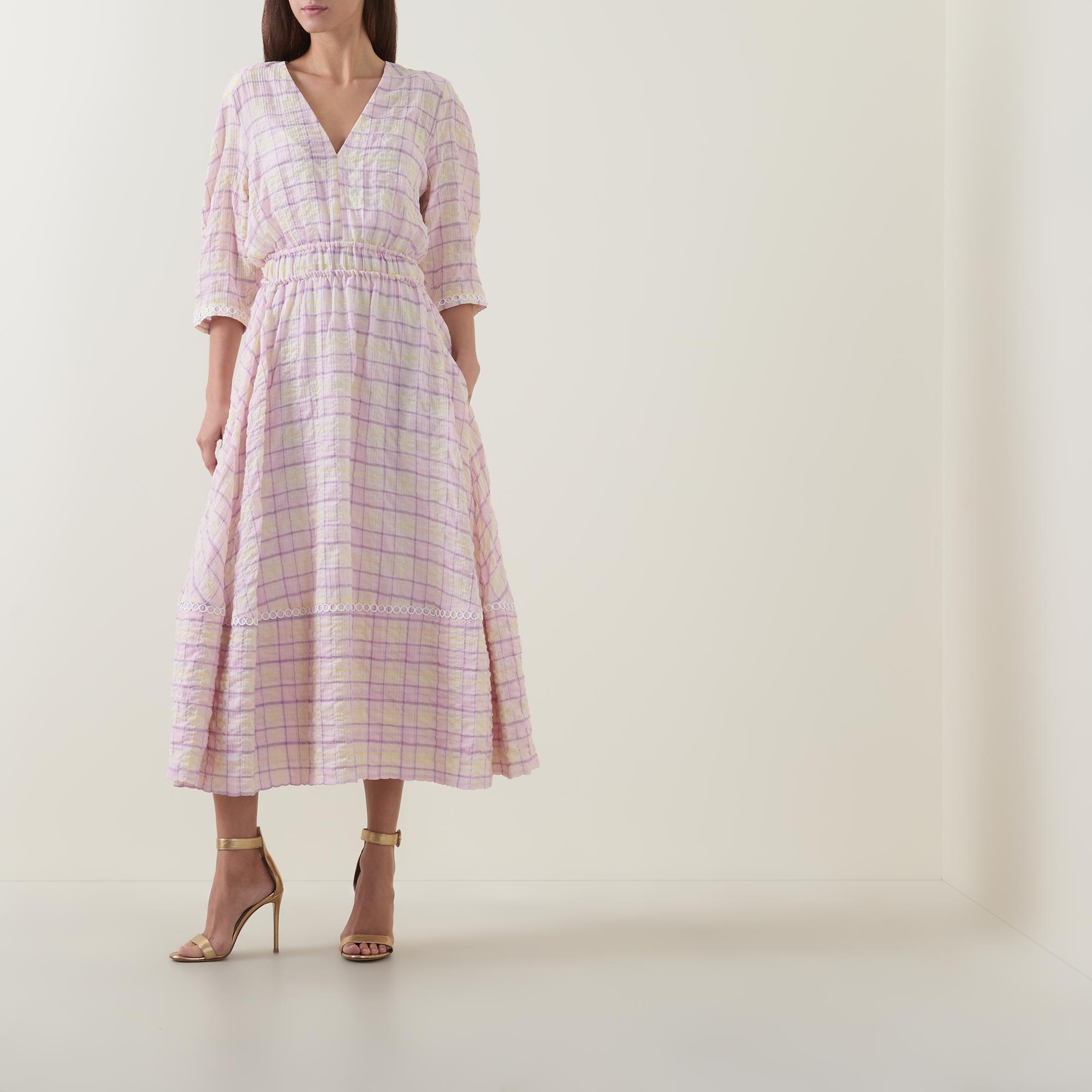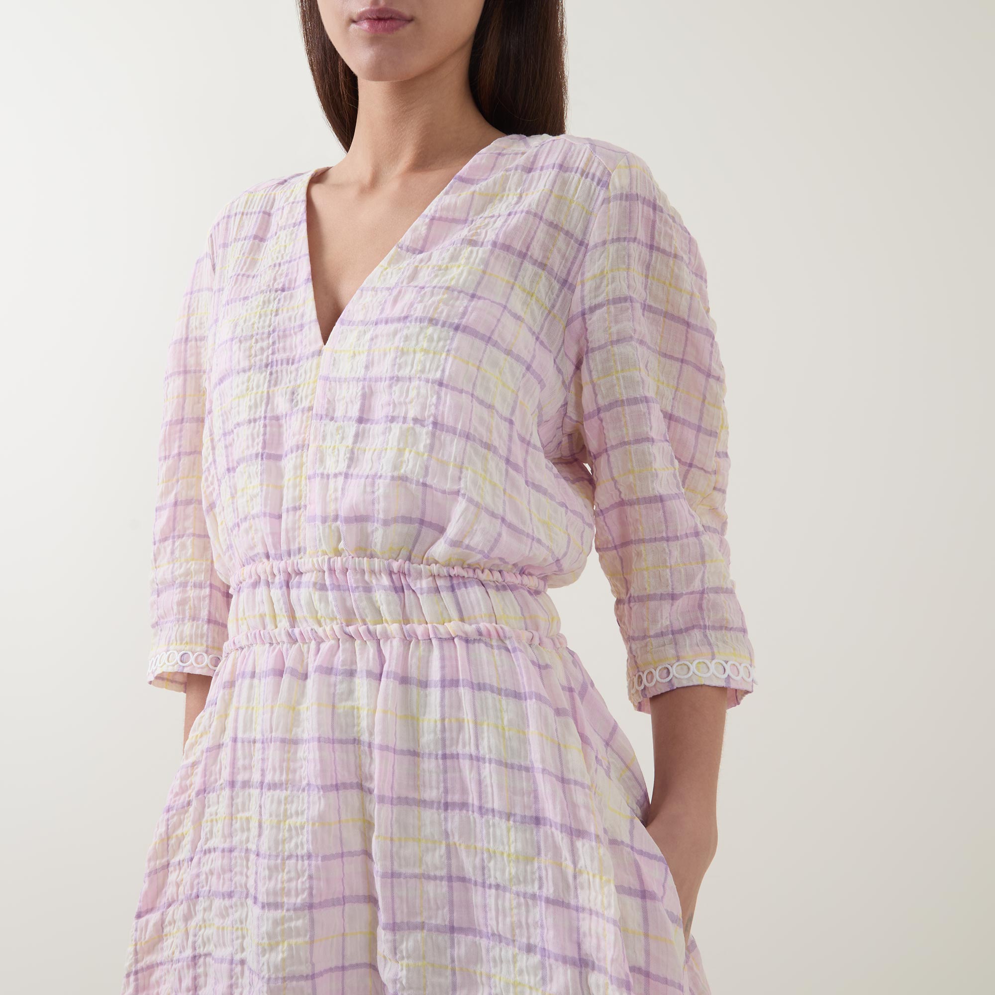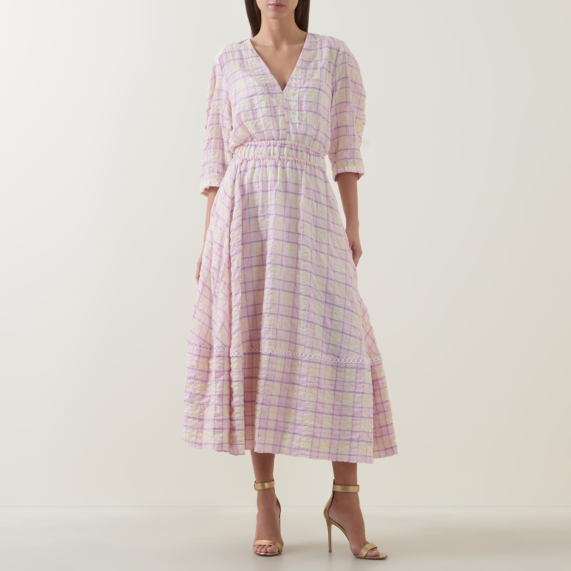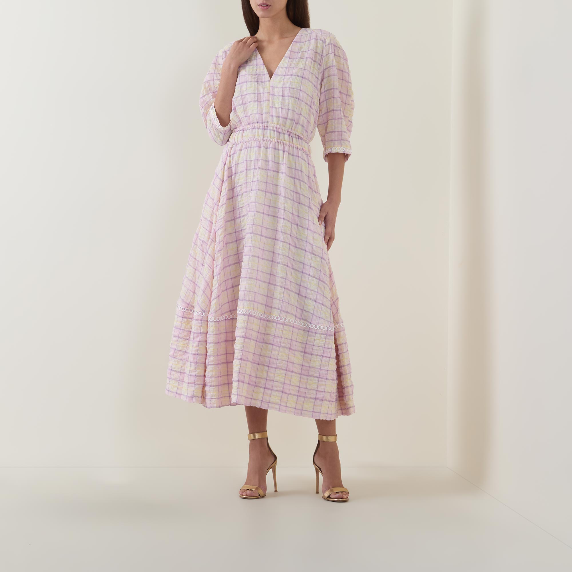 • V-neckline, three-quarter length sleeves, embroidered cuffs, fitted elasticated waistband, two side in seam pockets, full flared skirt, embroidered detailing on the skirt, check print, midi length