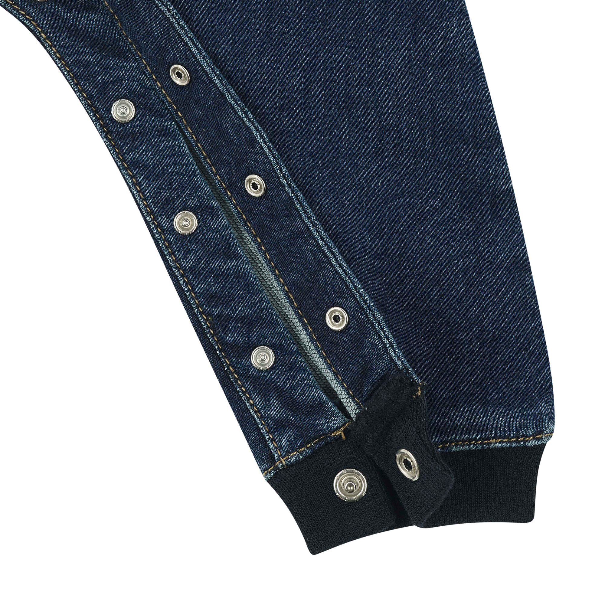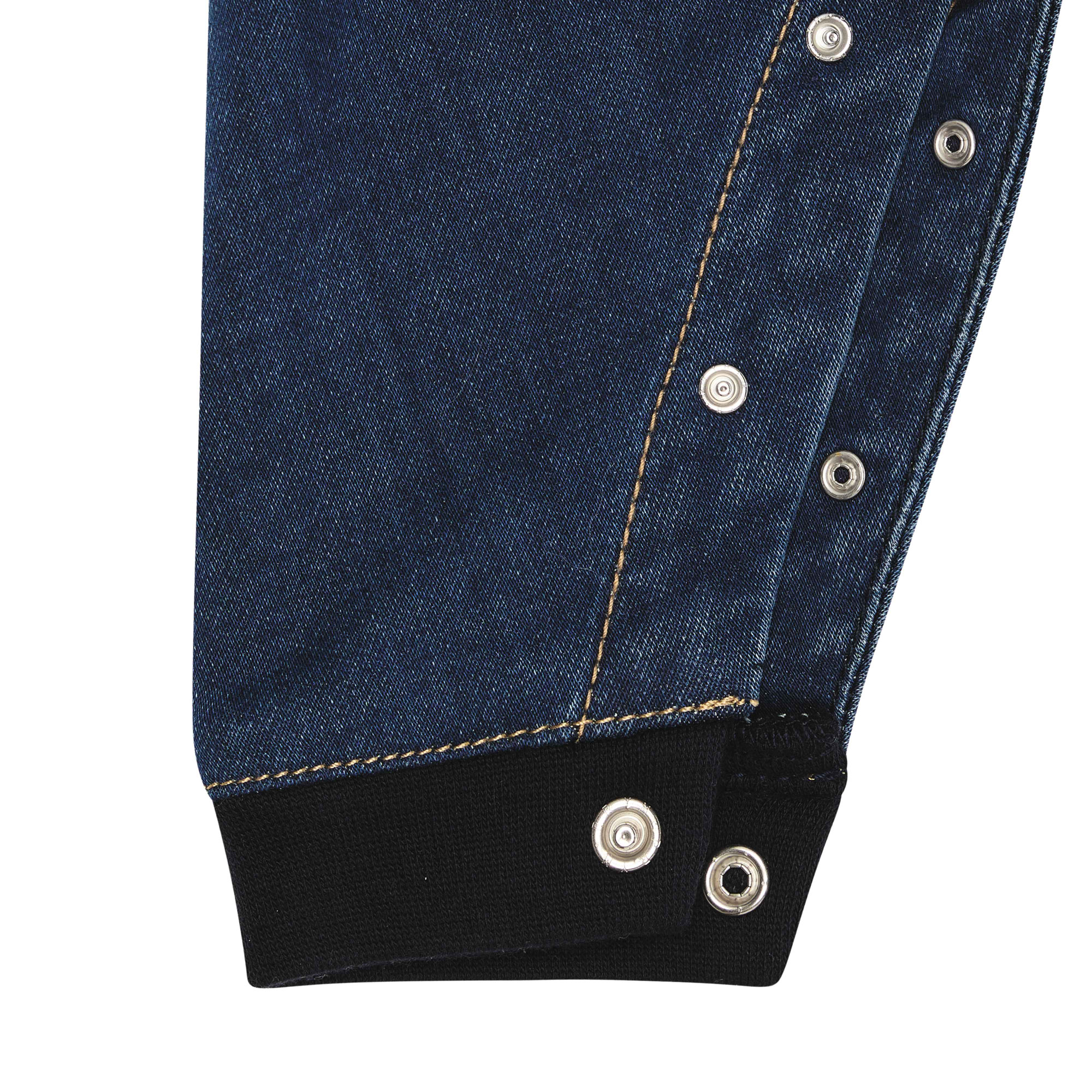 - Comfortable fit, large fluffy teddy bear head with press studs, hideaway front pocket, denim wash back, adaptable stretch, ribbed cuffs