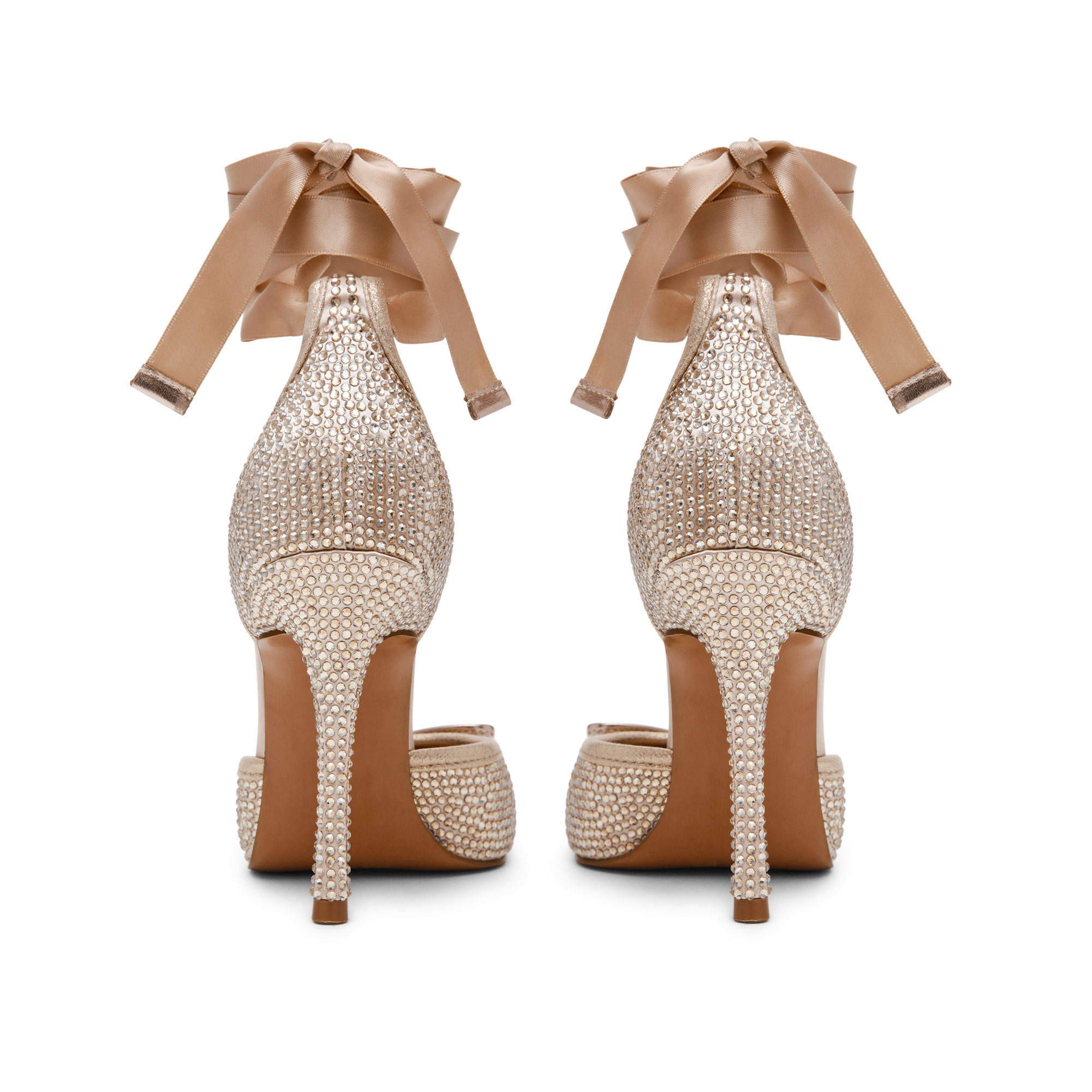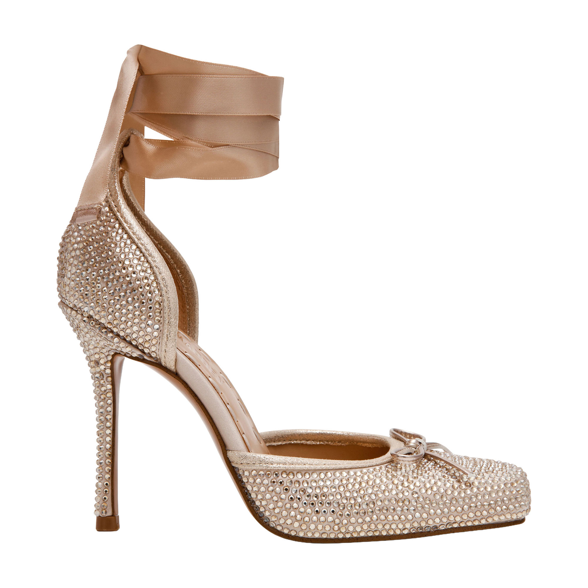 • Satin fabric, crystal embellishment, box toe topped with a small bow, fabric strap around the ankle