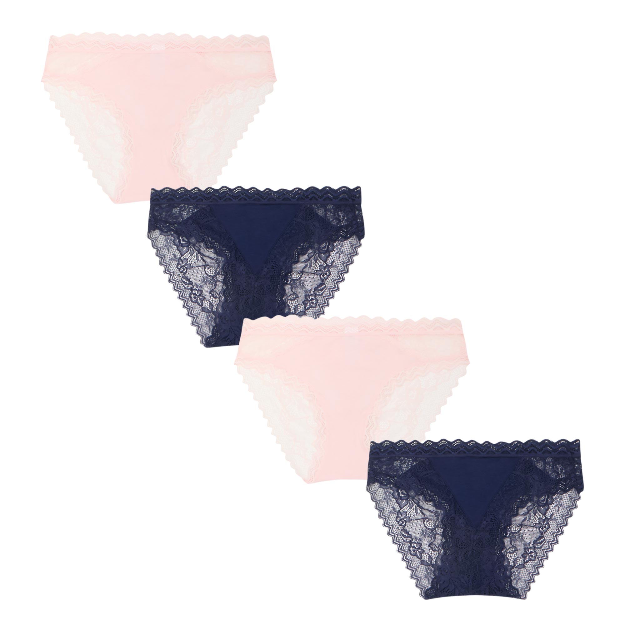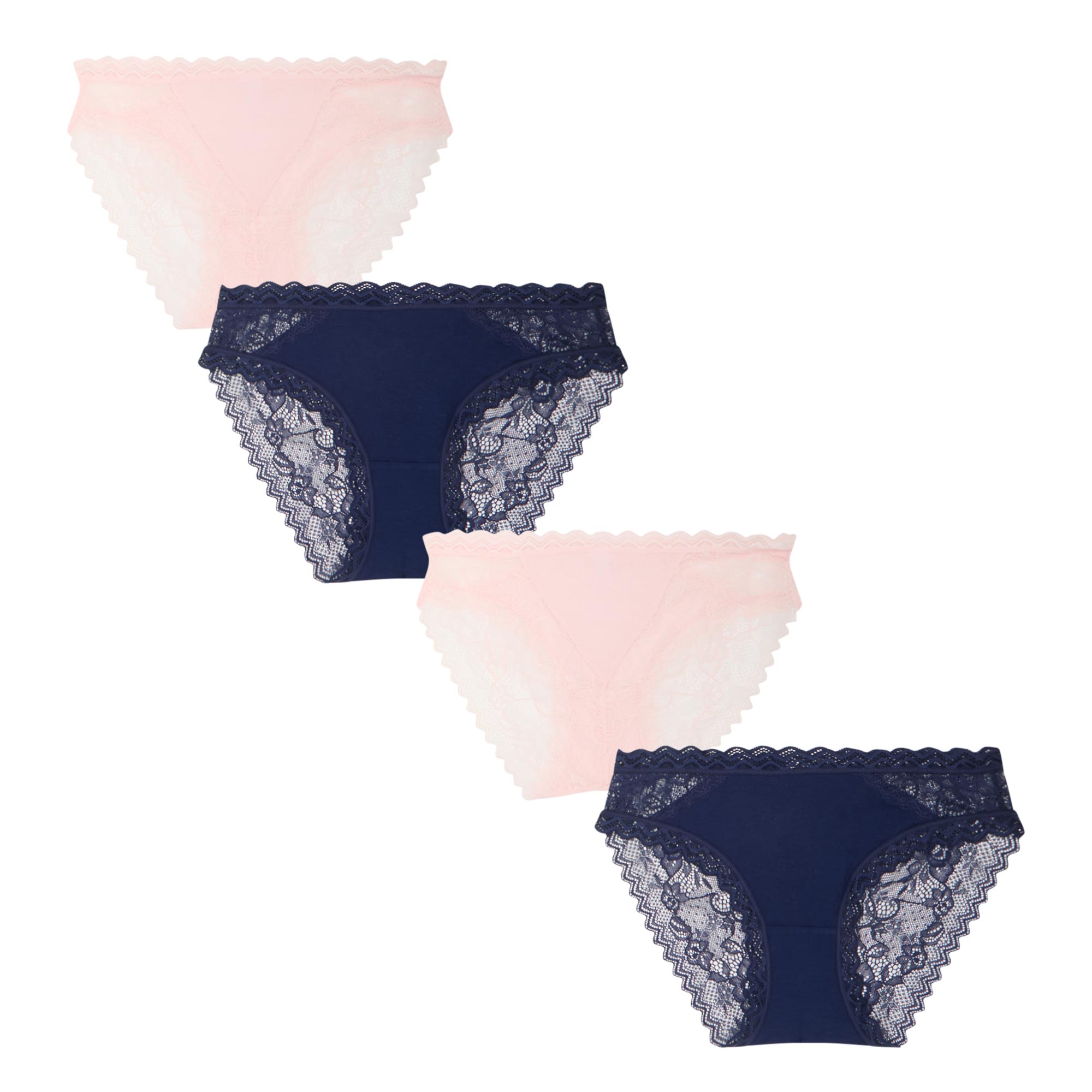 - Four-pack set, brief-style, mid-rise, elasticated waistbands, lace trim embellishment, assorted colours, super soft fabric