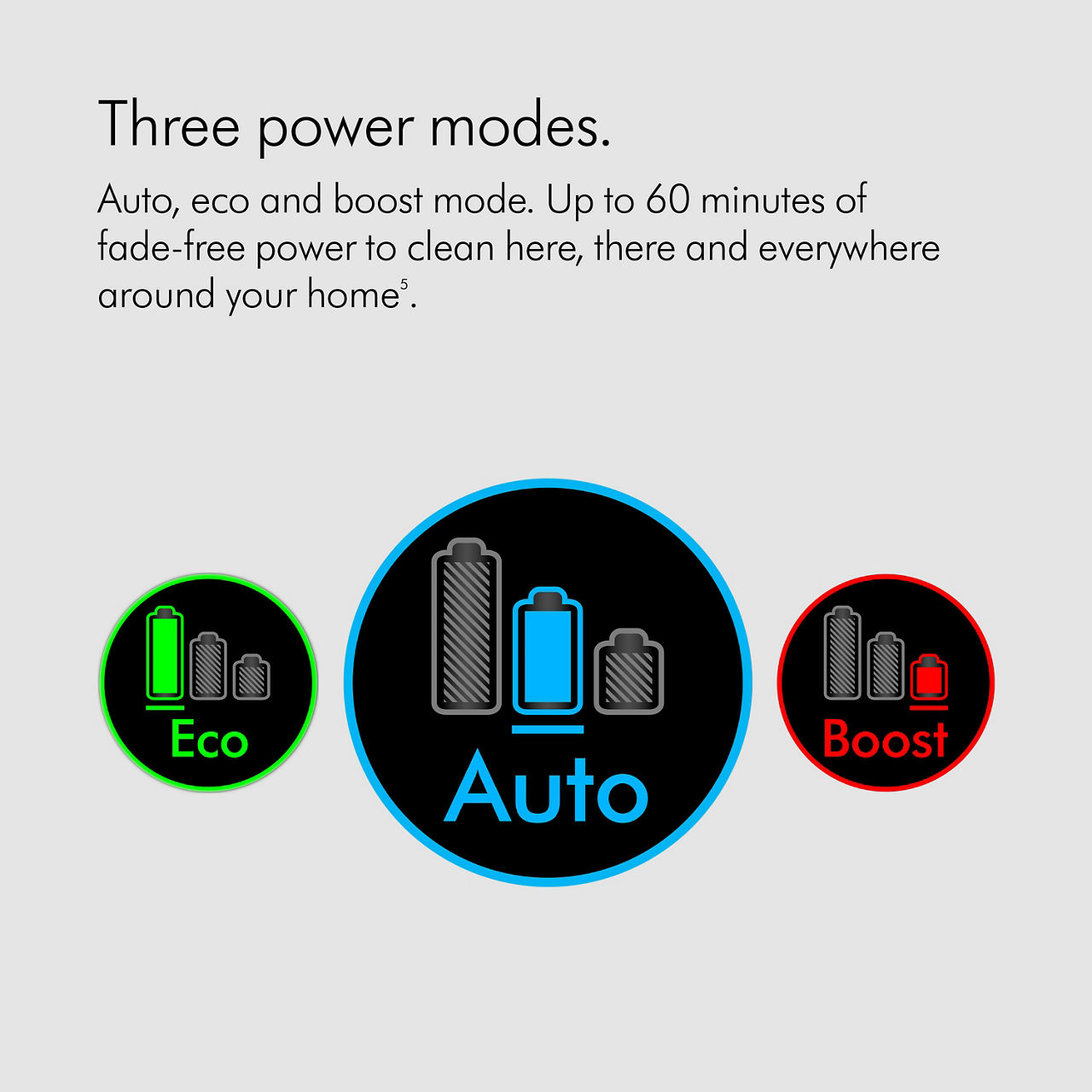 - Three power modes. Auto mode intelligently adapts, with the optimum balance of power and run time. Eco mode provides longer run time for bigger cleans, while Boost mode is engineered for short, intensive cleaning.