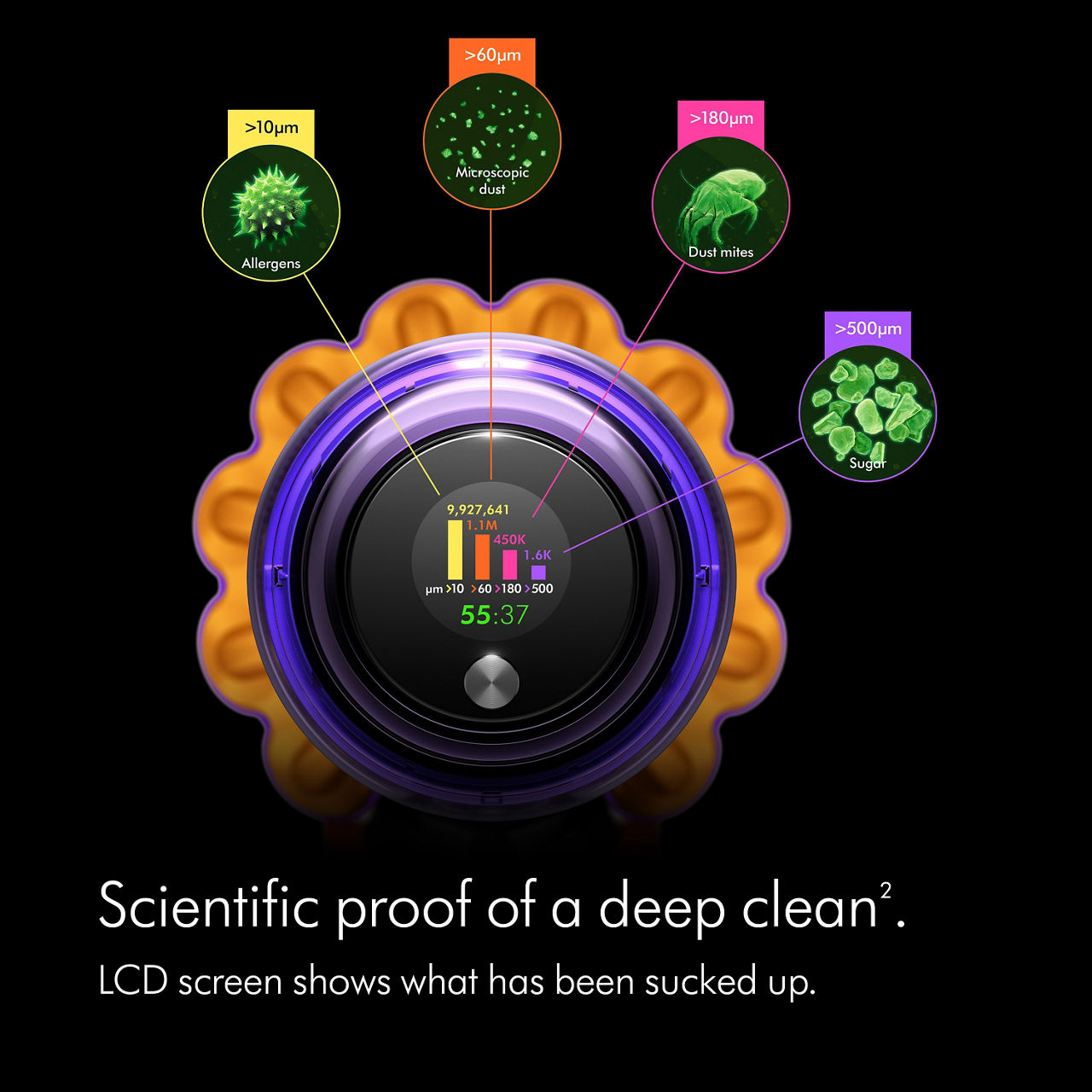The LCD screen shows what’s been sucked up, displaying real-time scientific proof of a deep clean.1
