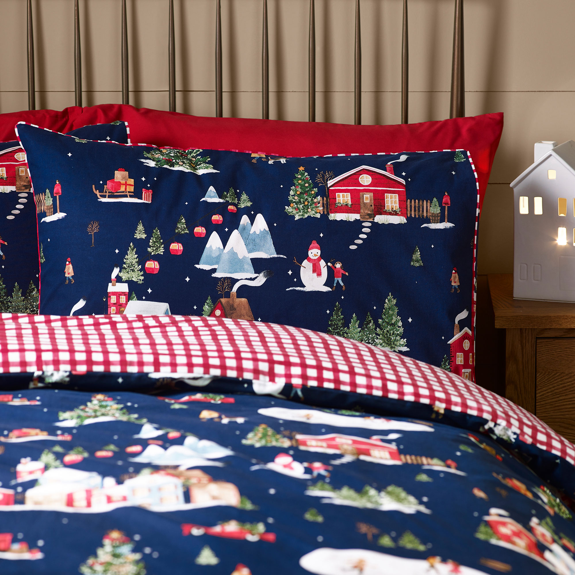 Bring the charm of an Alpine winter to your bedroom with this ski chalet-inspired bedding set. Featuring delightful illustrations of a festive ski village, complete with twinkling Christmas trees and cheerful people, this cosy set captures the magic of the season. The fully reversible design offers two stylish looks in one Created from easy-care recycled polyester and soft cotton, blended for everyday use during the holiday season. Duvet set includes pillowcase(s)