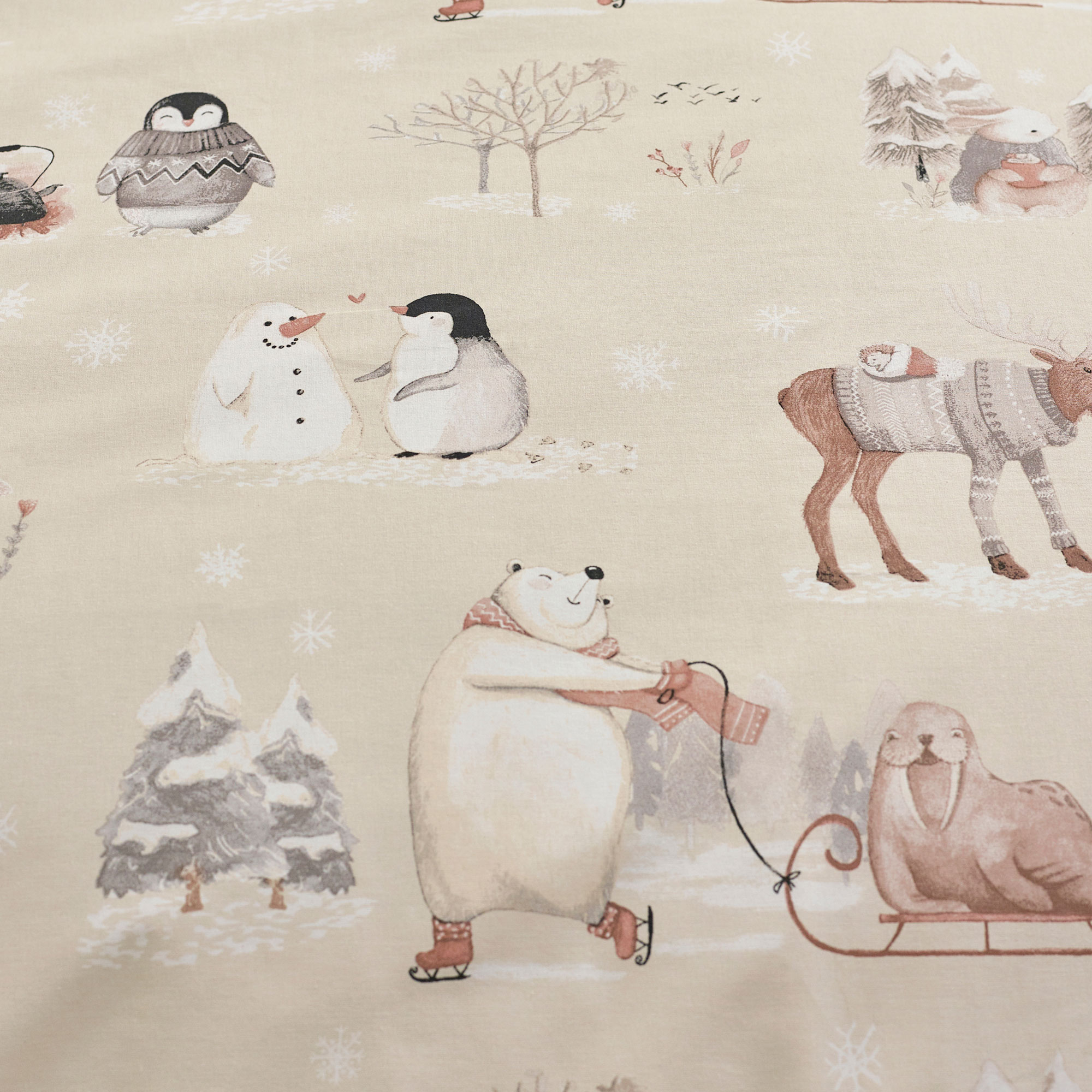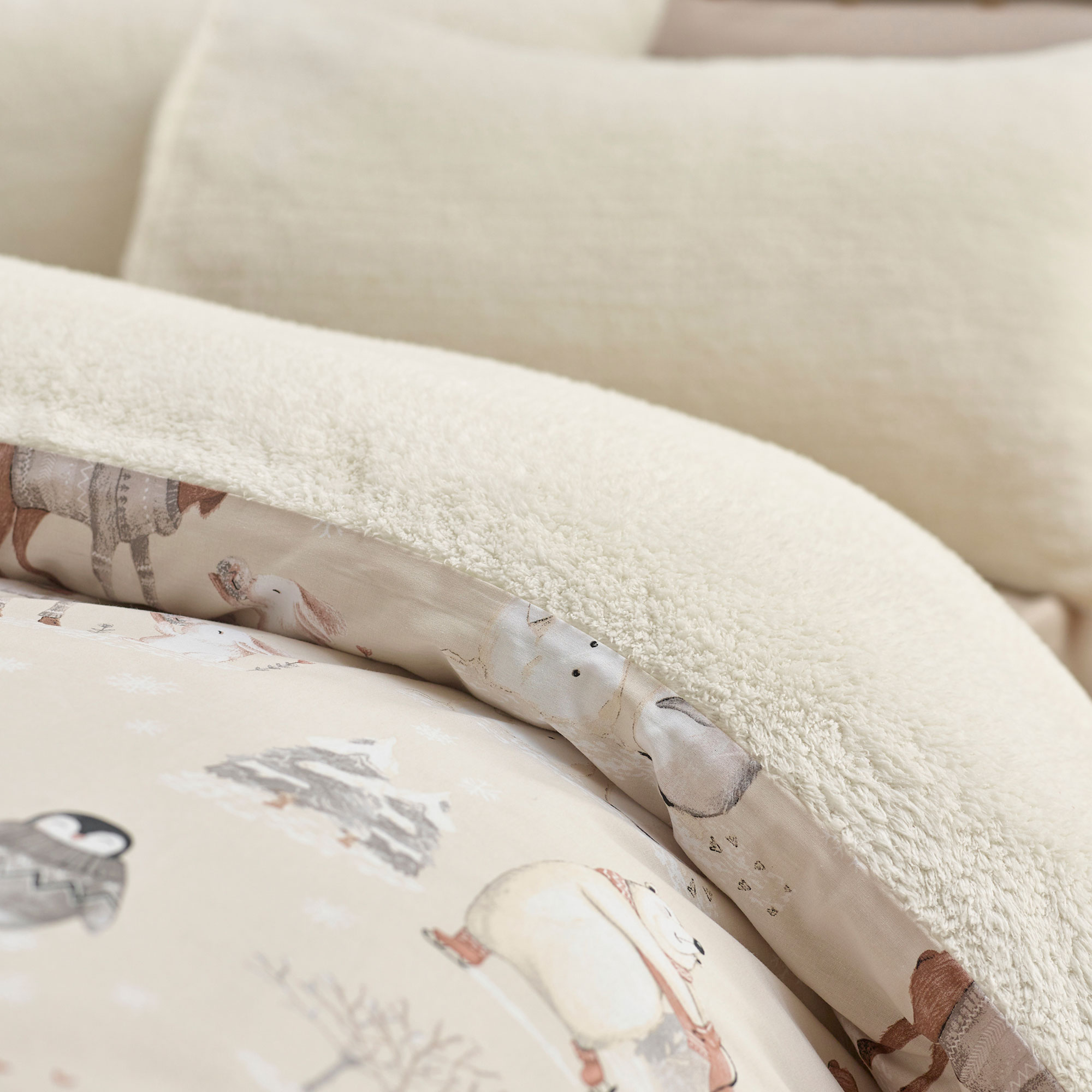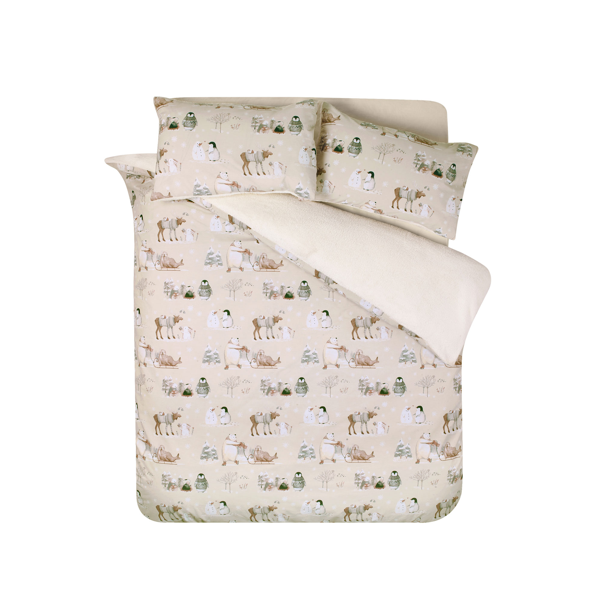 Snuggle up in festive warmth with a delightful seasonal bedding set, featuring adorable winter animals enjoying the season on a neutral background, this charming design brings a cosy touch of holiday magic to your bedroom. Created from easy-care recycled polyester and soft cotton, with a plush Sherpa reverse, offering extra warmth and comfort for chilly winter nights. Duvet set includes pillowcase(s)