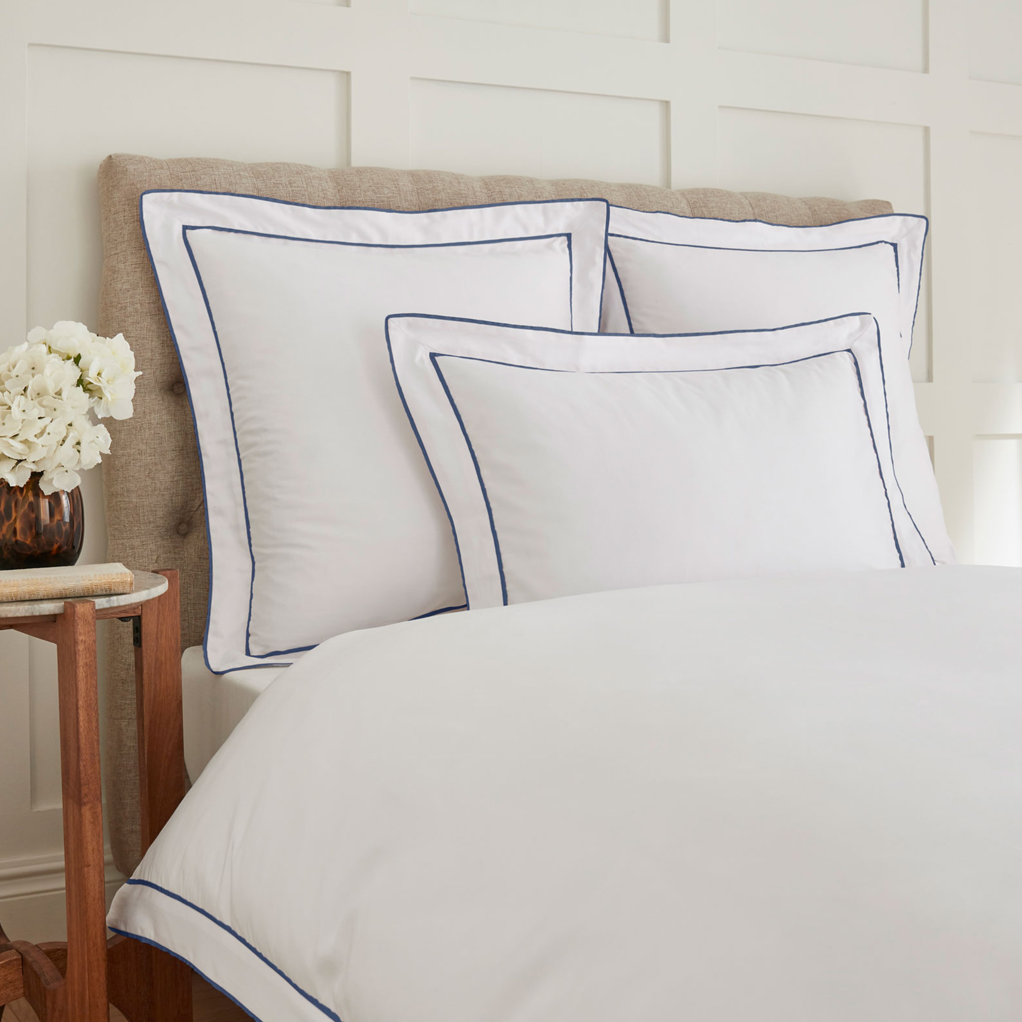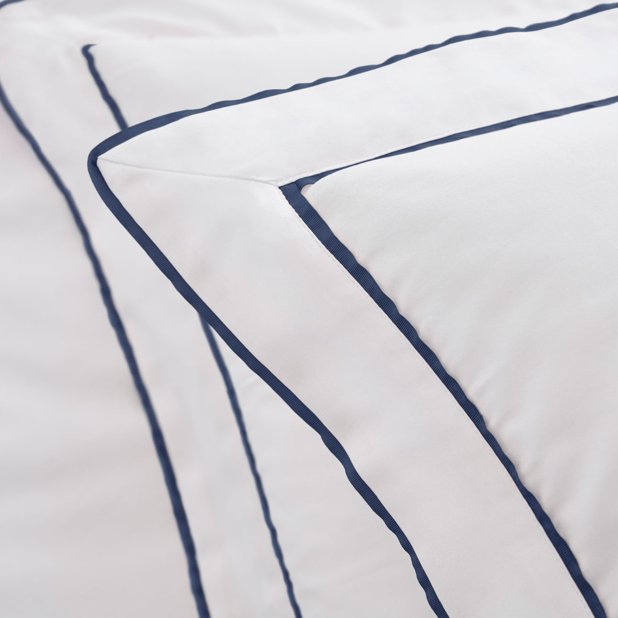 Beautifully created with contemporary styling and classic design in soft yet densely woven 400 Thread Count cotton. White with embellished oxford edges with two rows of tape in on trend Navy colour. Available in a selection of Colourways.