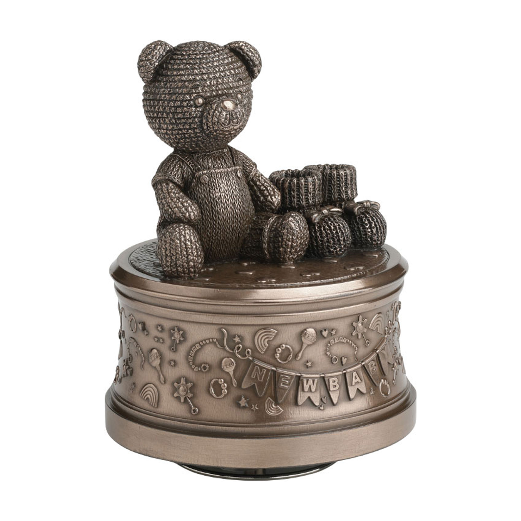 Celebrate a new arrival with this charming music box, adorned with a cuddly teddy bear, tiny booties, and playful baby motif. A thoughtful gift for baby showers or new parents.