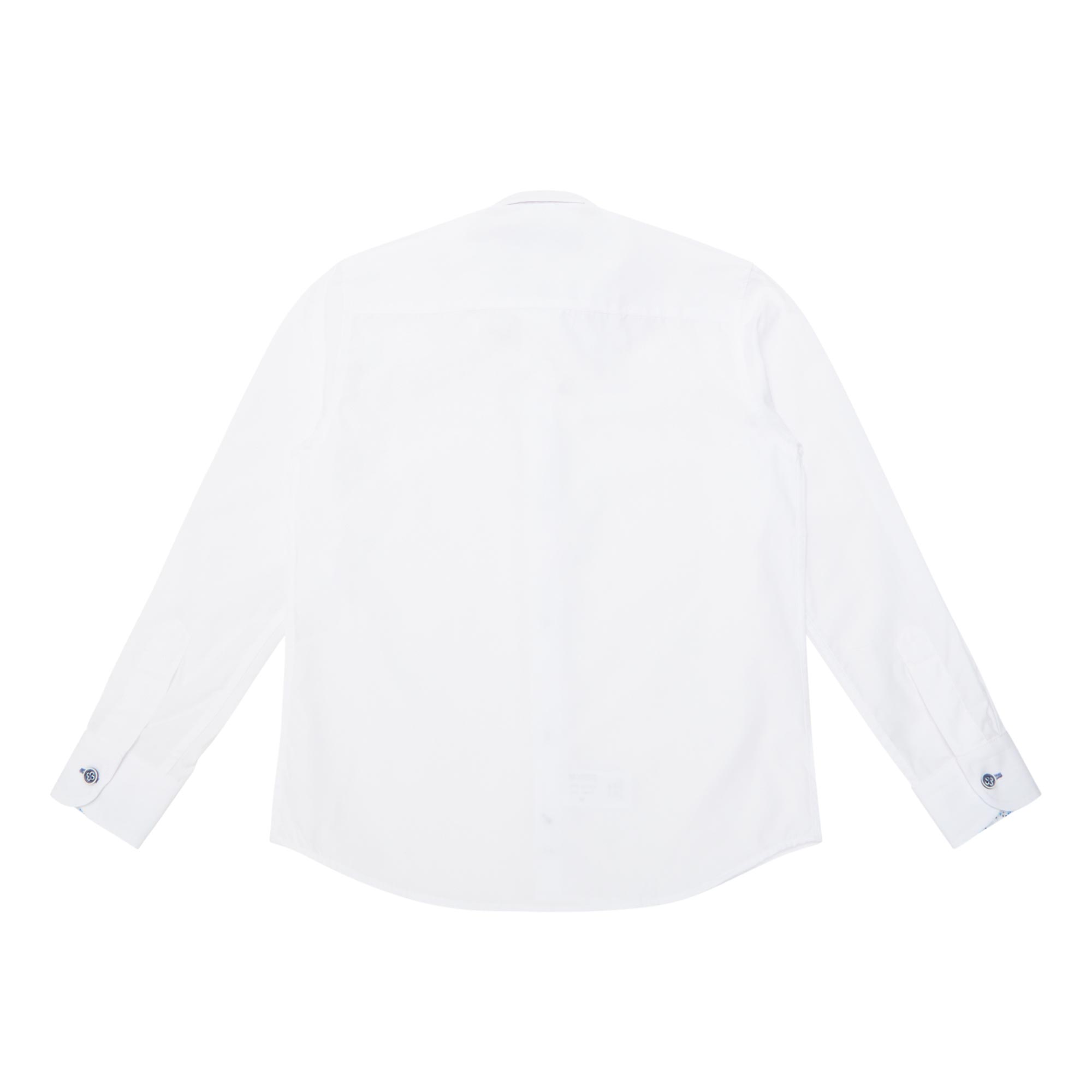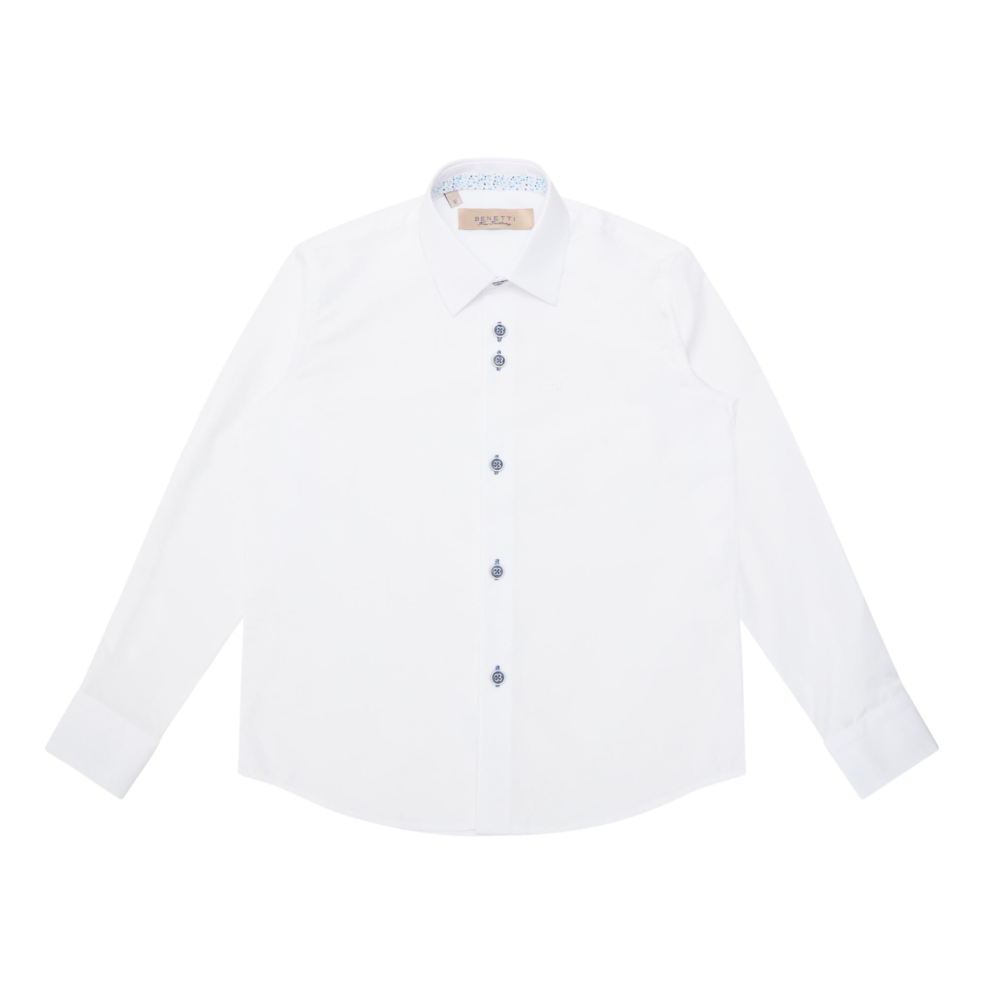• Point collar, long sleeves, buttoned cuffs, front button fastening, curved hem, tonal stitching, smooth finish