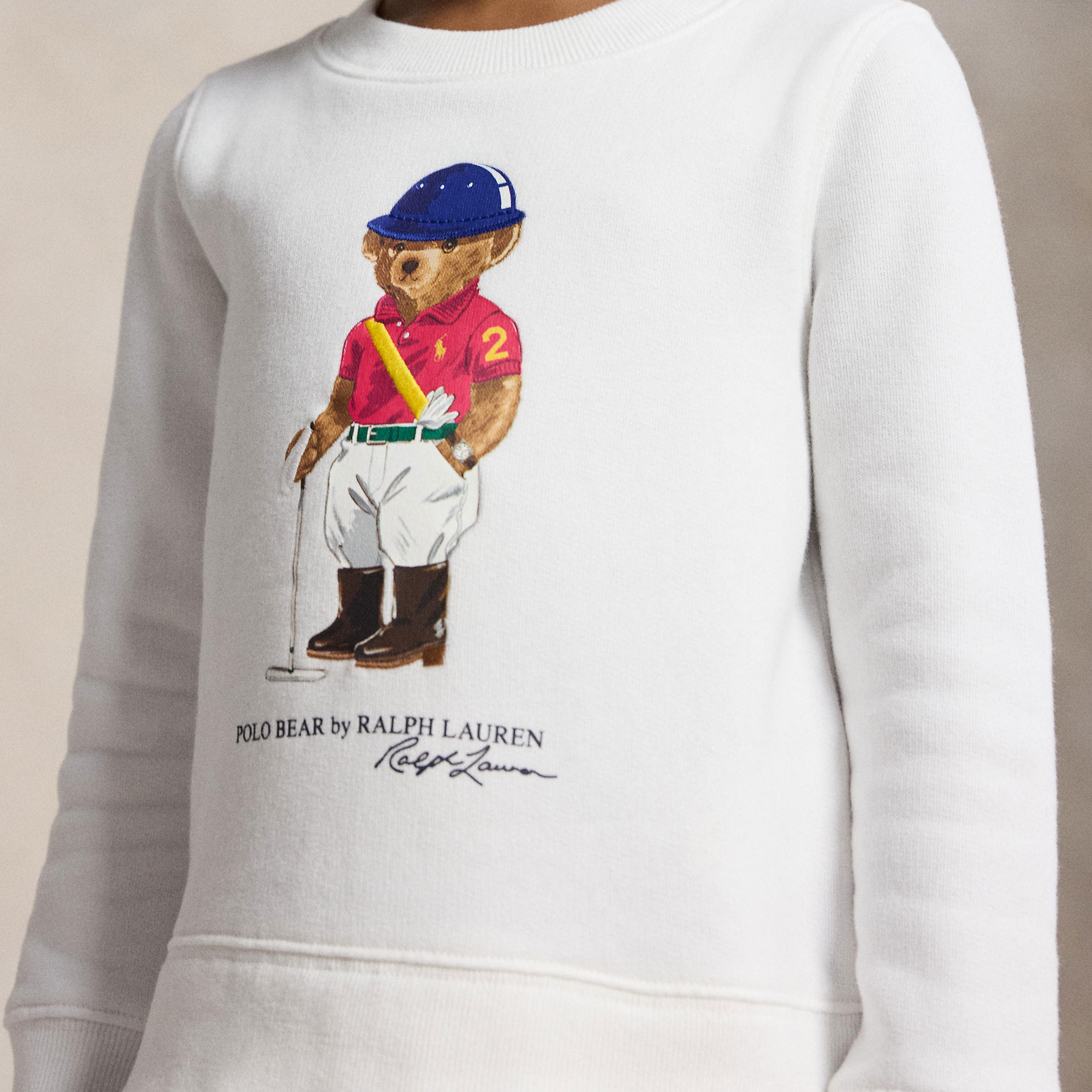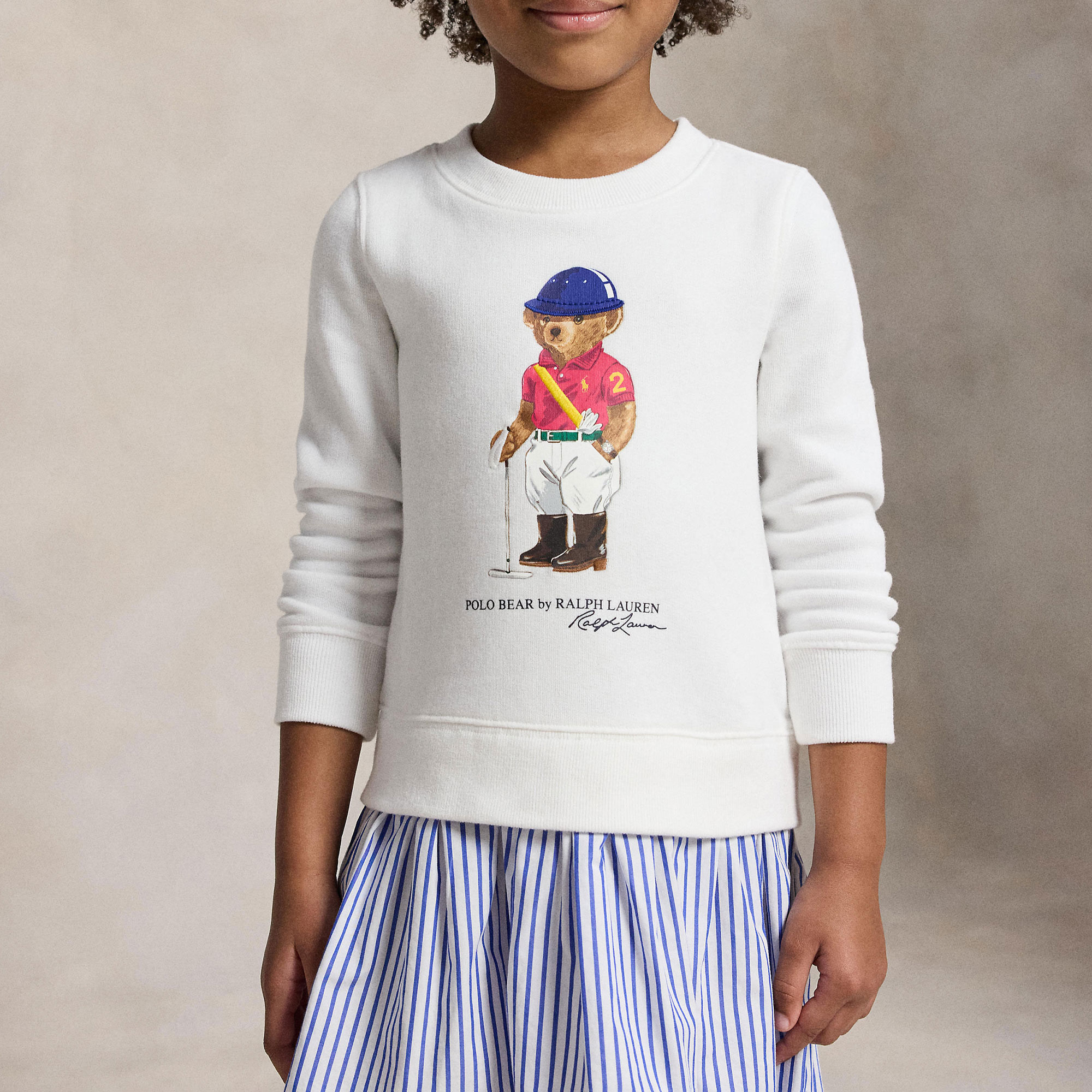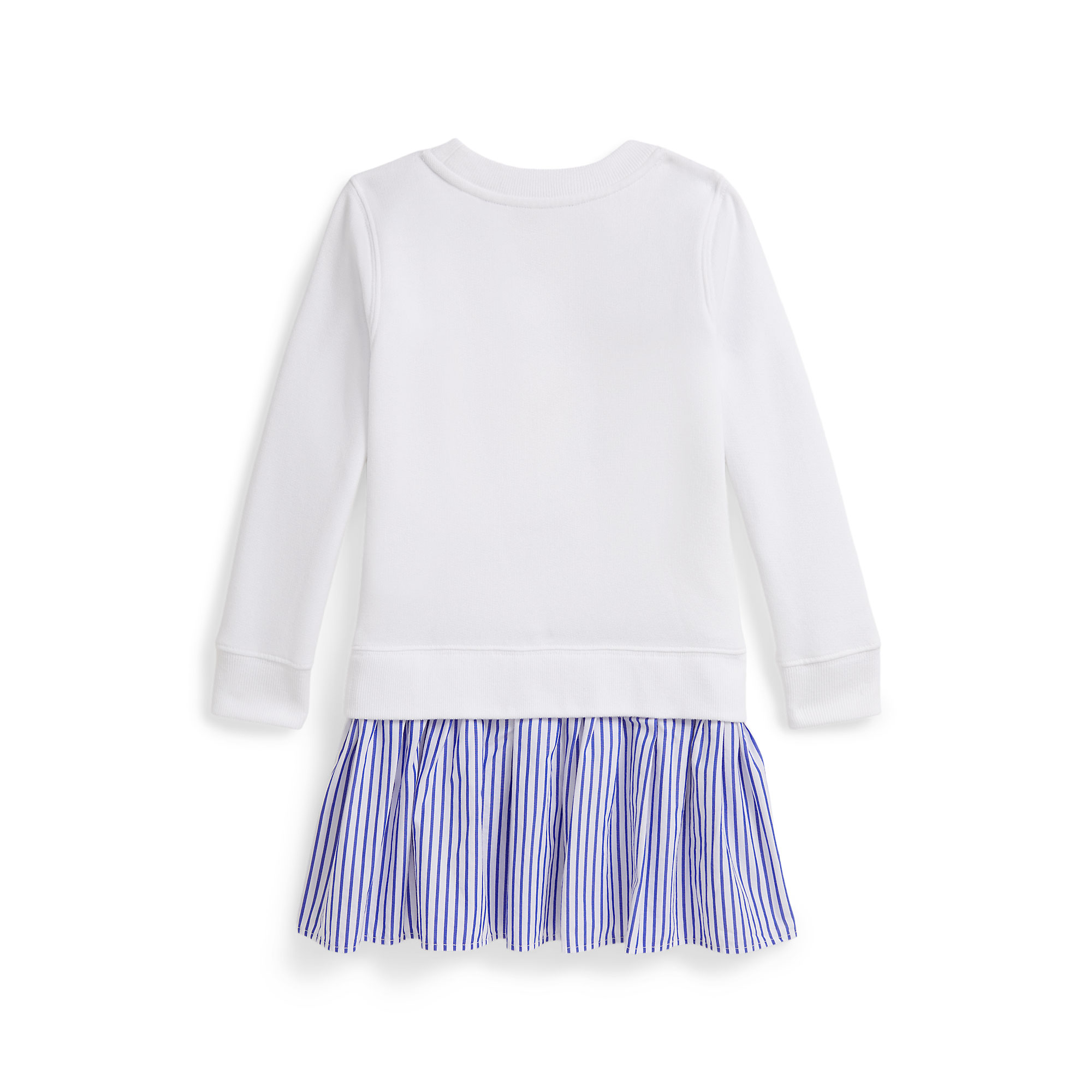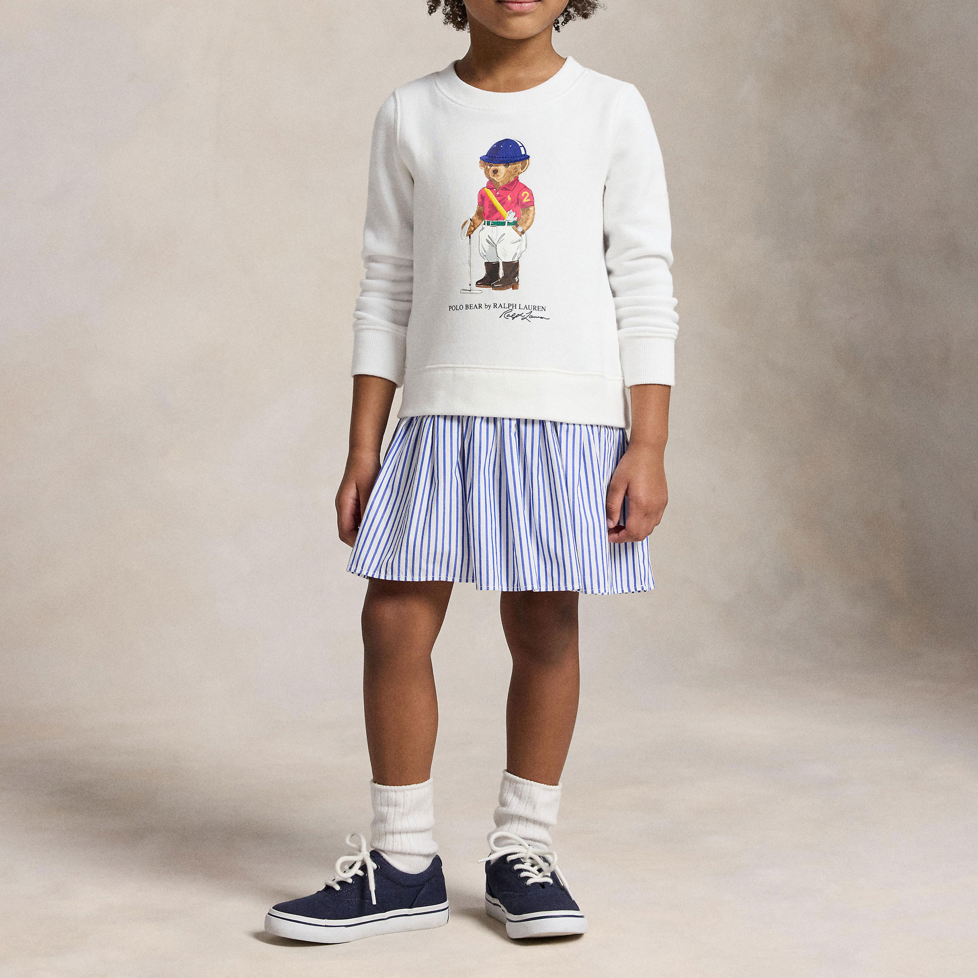 - Drop-waist silhouette, crewneck, long sleeves with ribbed cuffs, polo bear, script logo details printed at front, ribbed hem at the bodice, woven poplin skirt