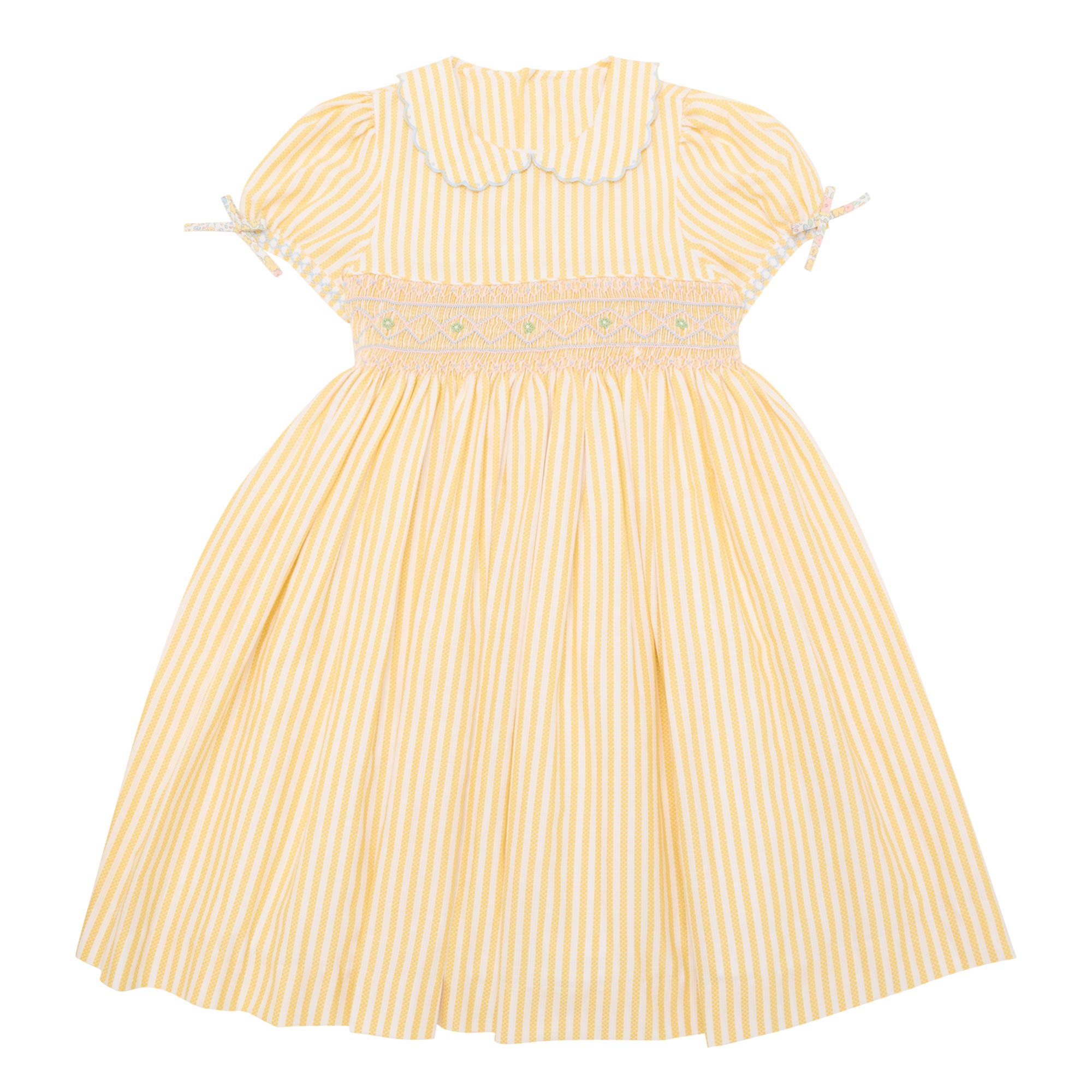 - Peter Pan collar with scalloped trims, short sleeves, button fastening to the back, self-tie belt, smocked waist, pleated skirt, stripe print