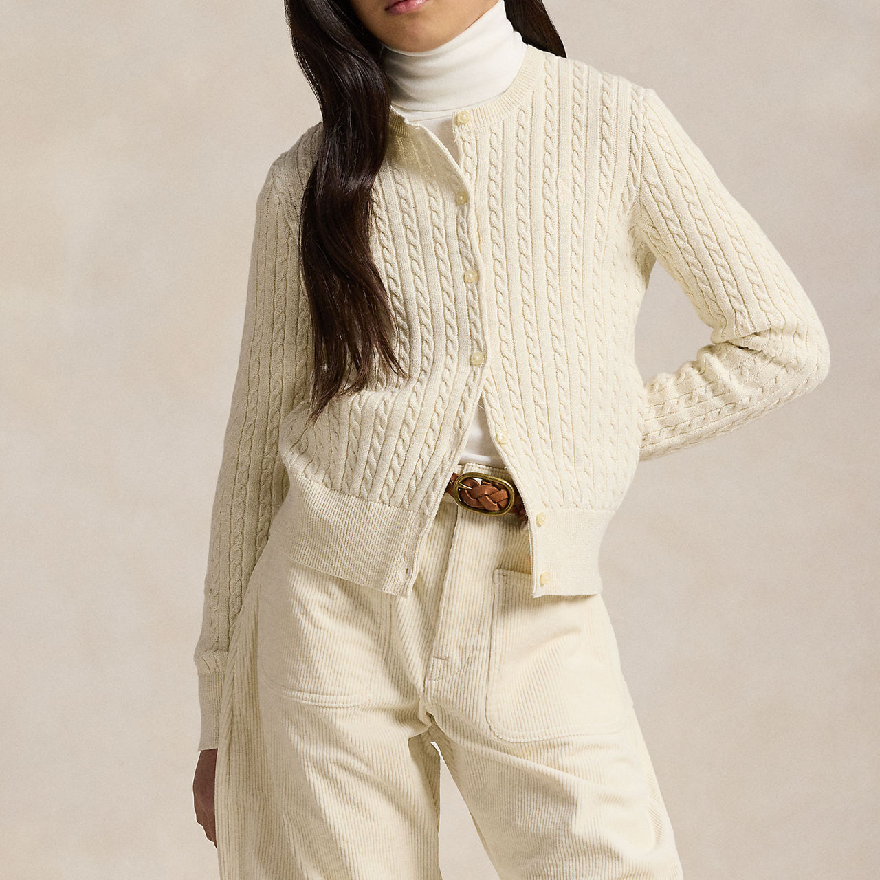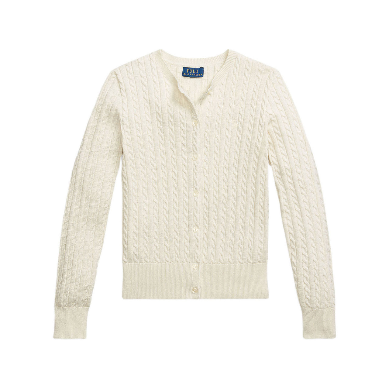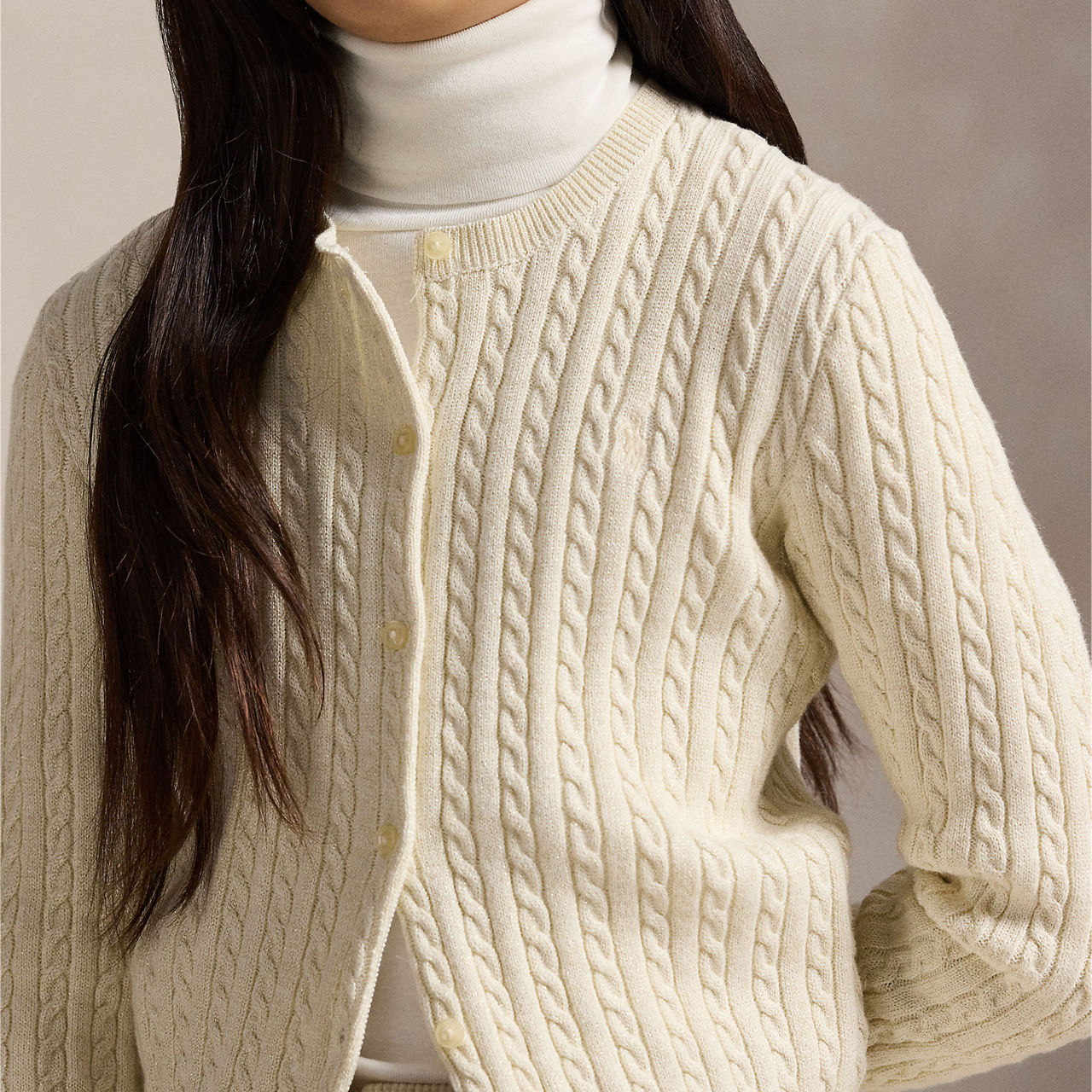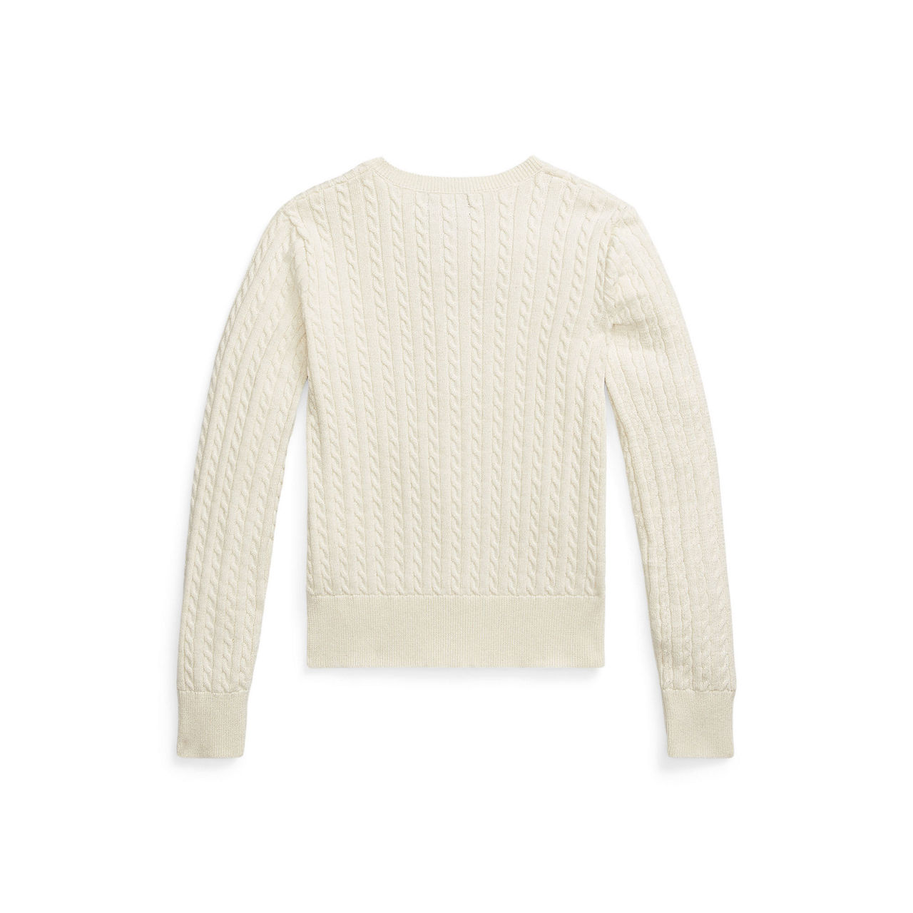 - Mini cable pattern, metallic yarns, crewneck, buttoned placket, grosgrain trim along the underplacket, long sleeves with rib-knit cuffs, rib-knit hem, signature embroidered pony at the left chest
