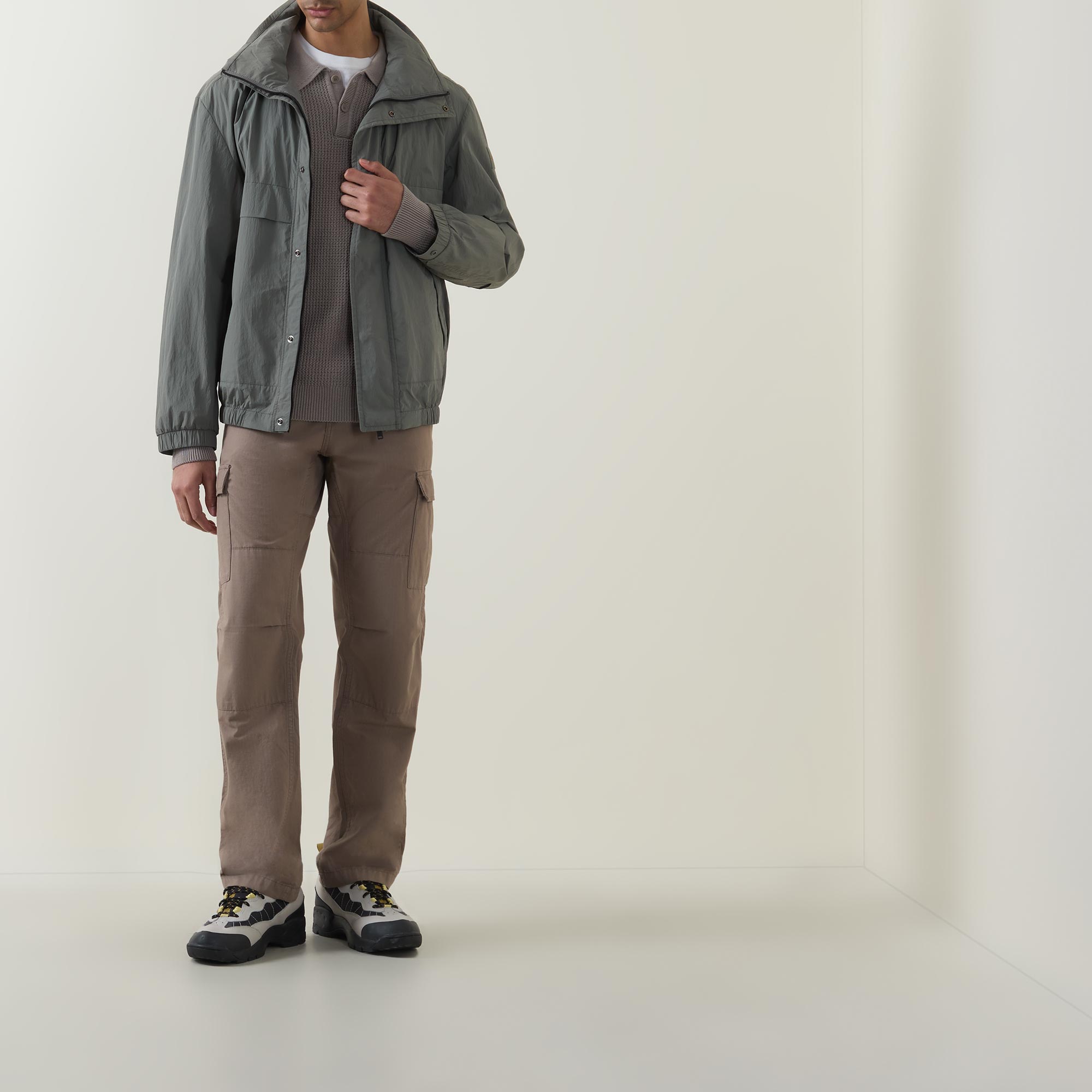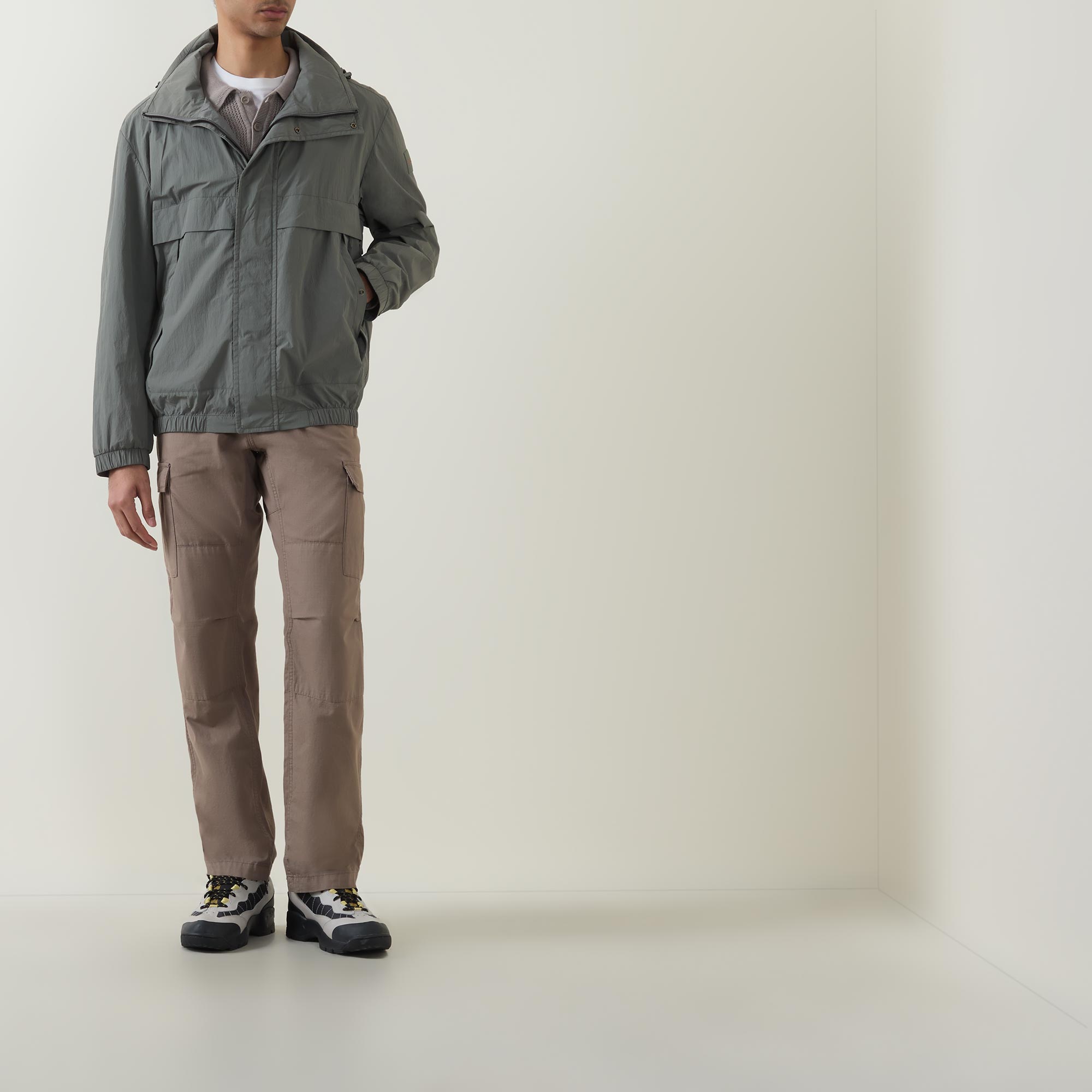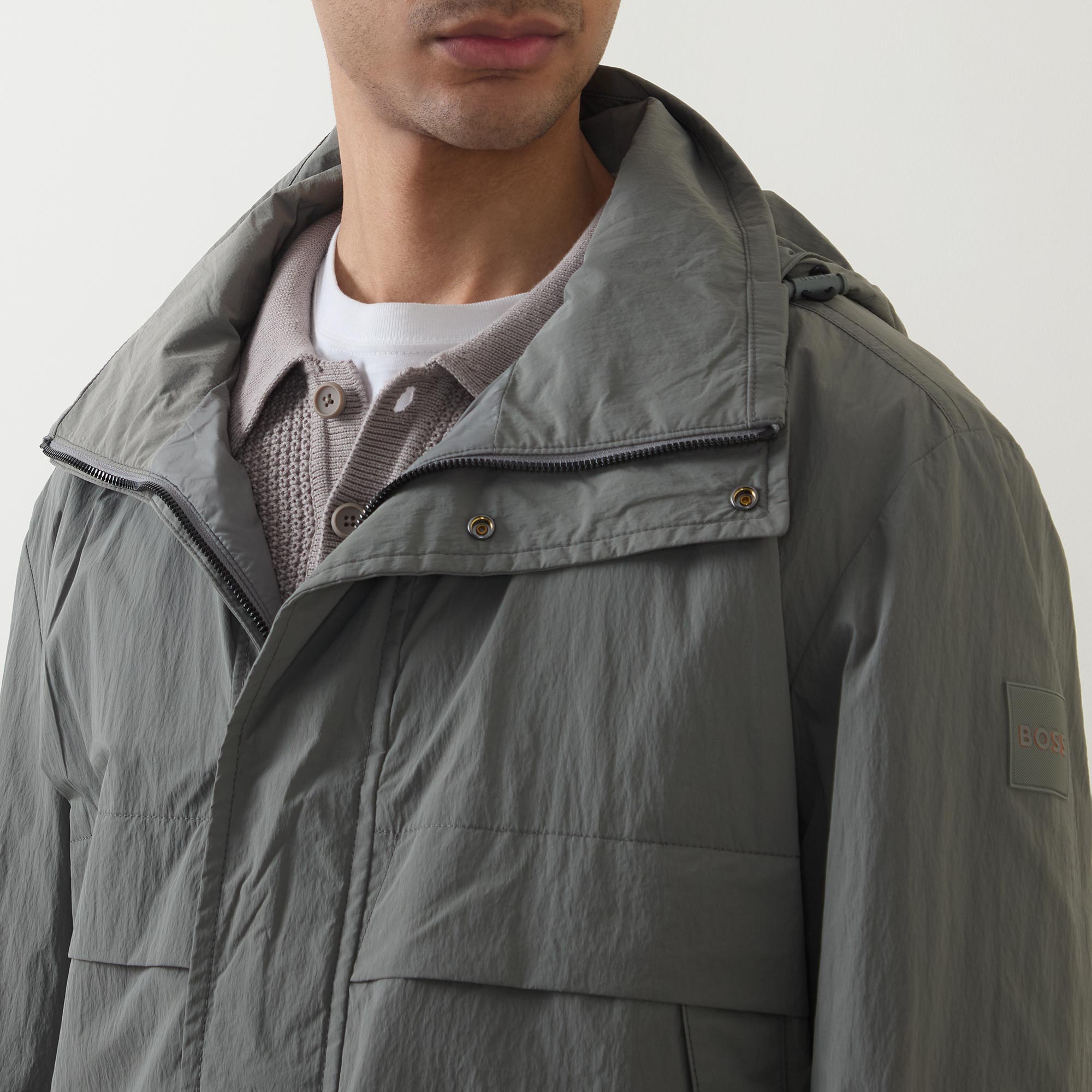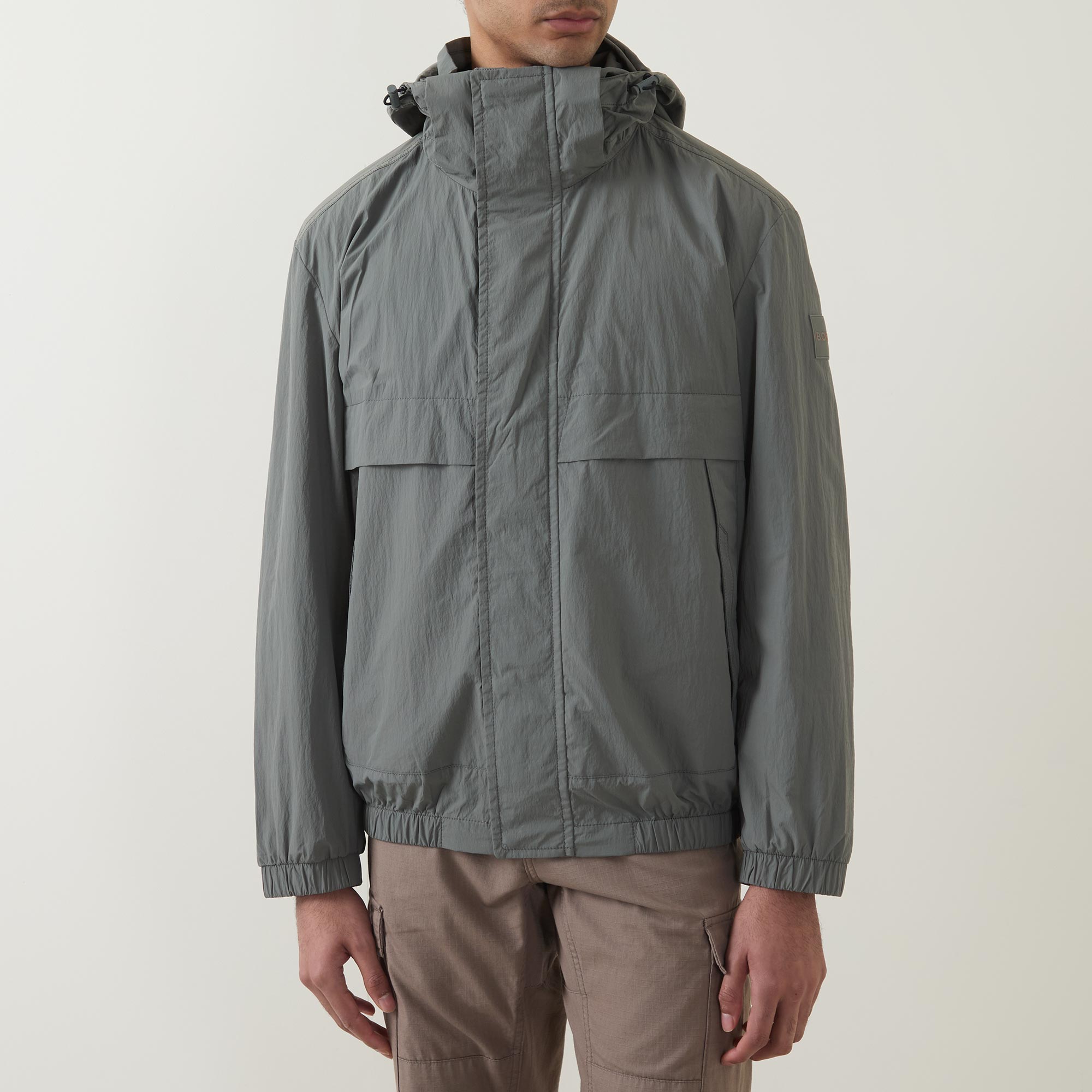 - Hood with toggle adjustable fit, snap button and zip fastening, elasticated trims, side entry pockets, logo badge at sleeve
