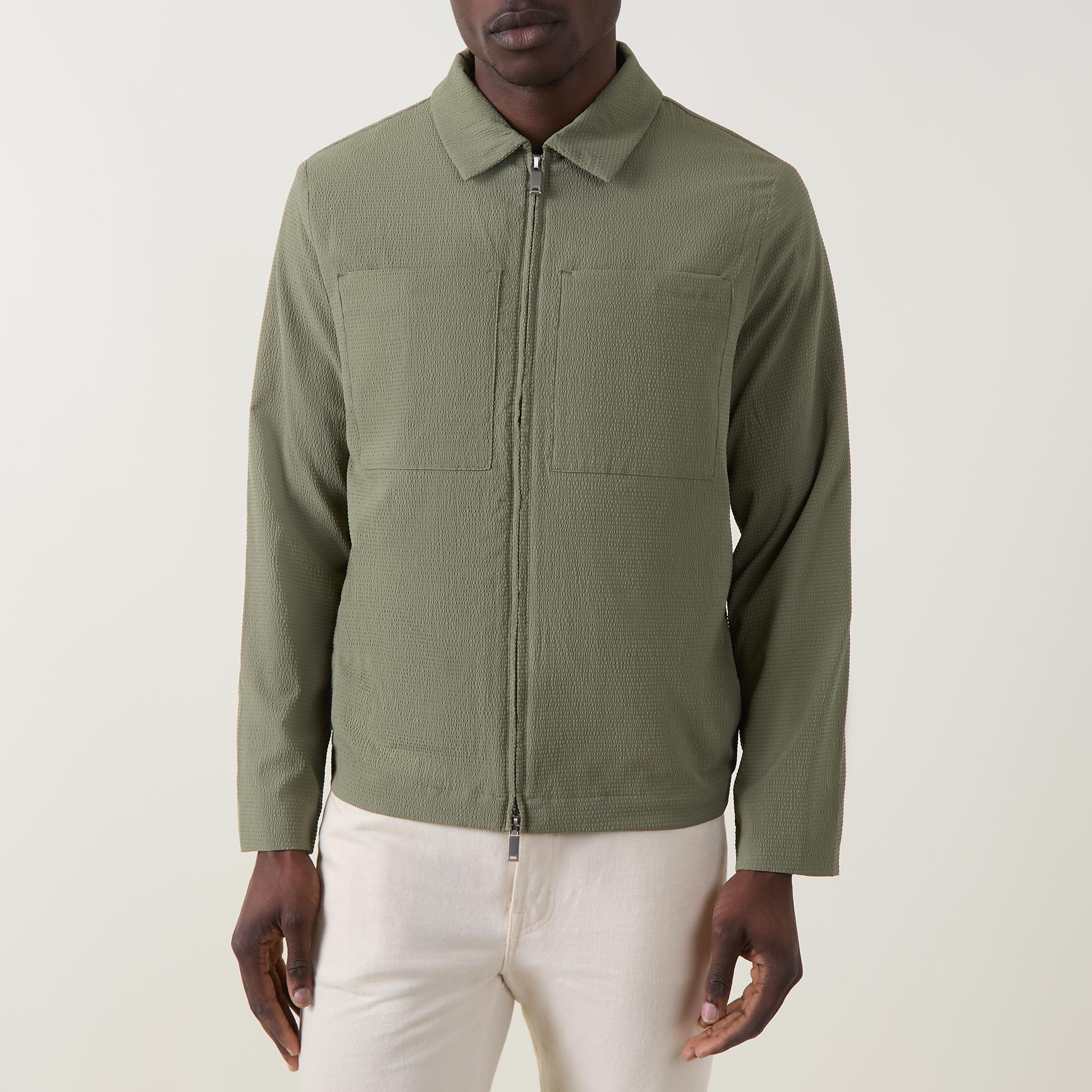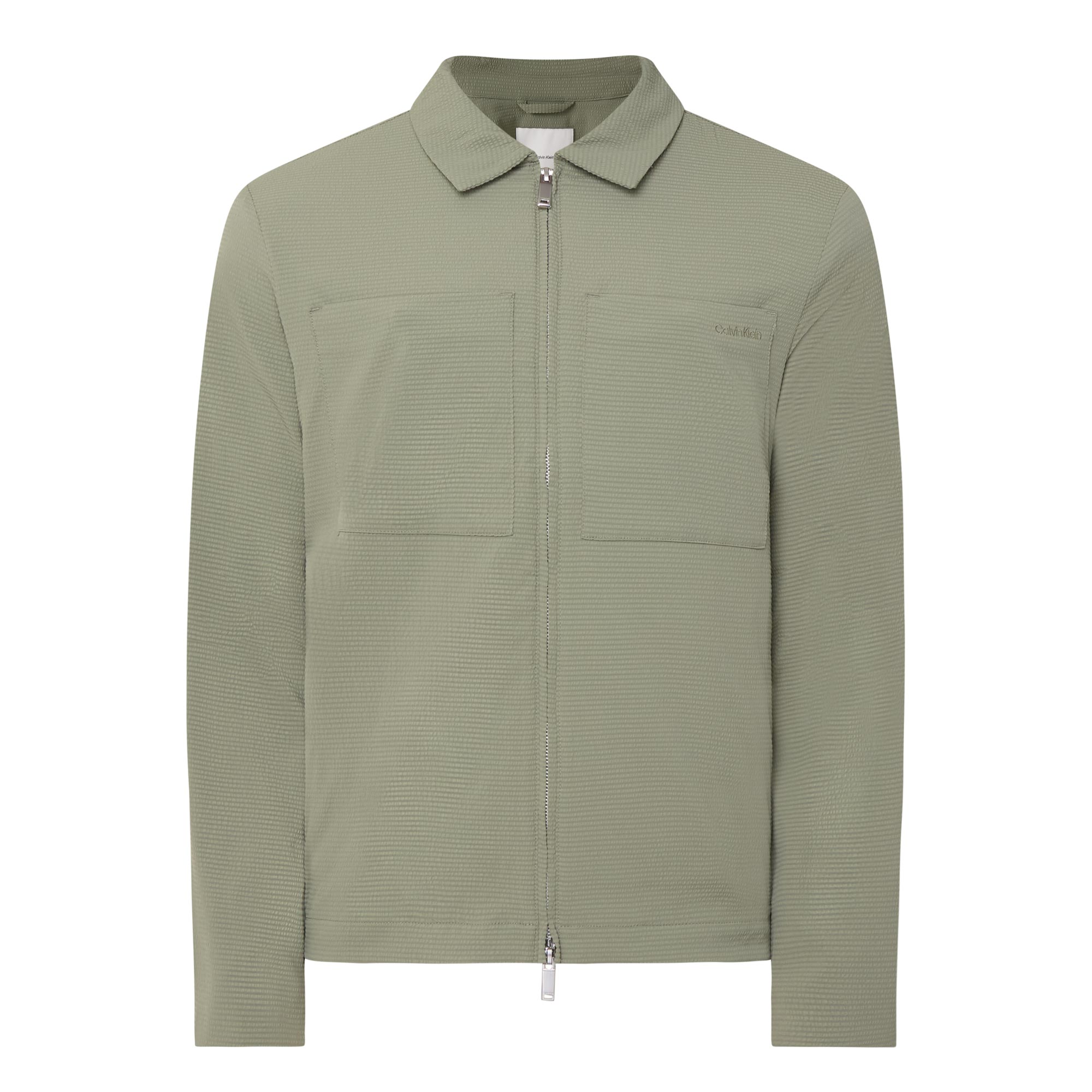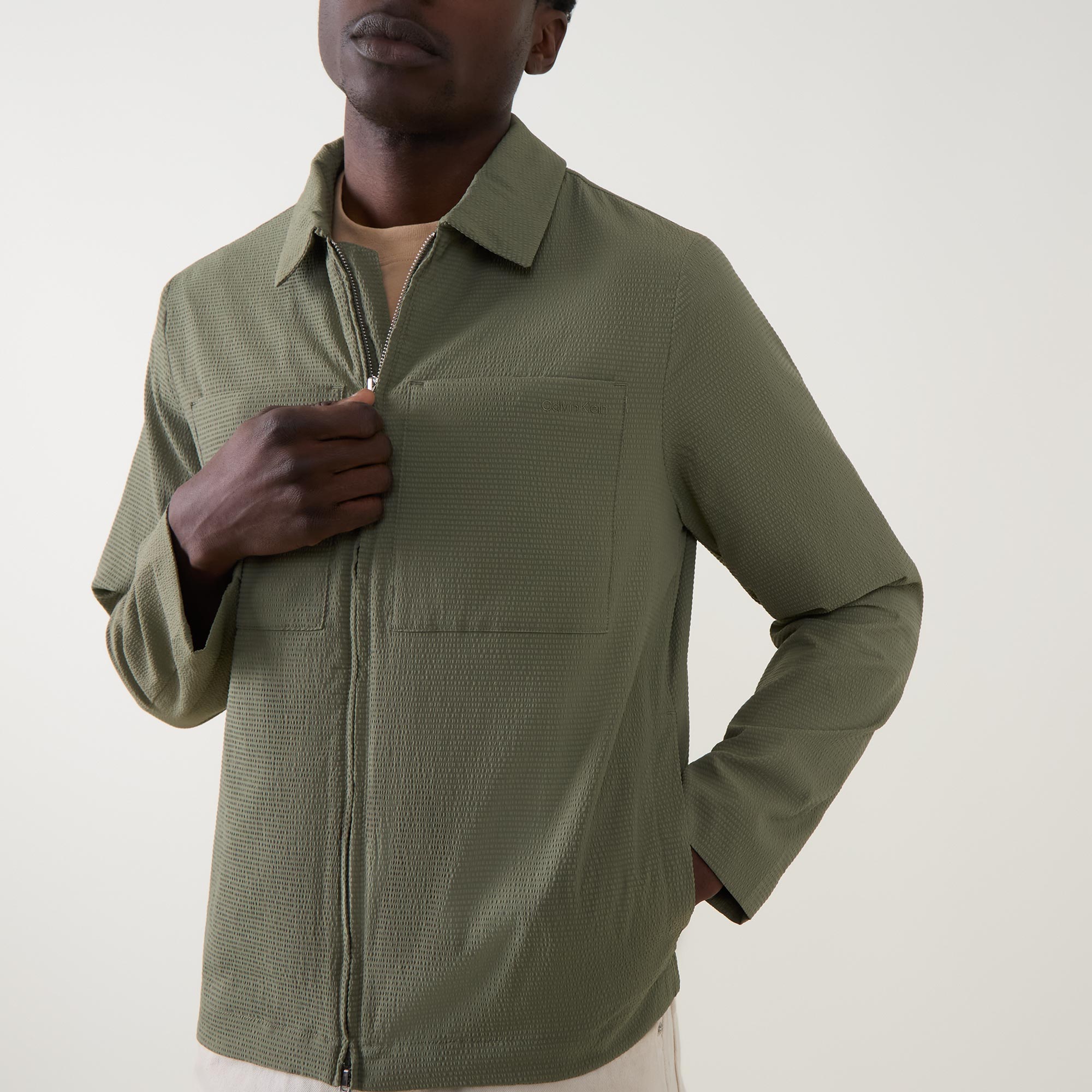 - Seersucker texture, two chest patch pockets, zip-up placket, long sleeves, shirt collar