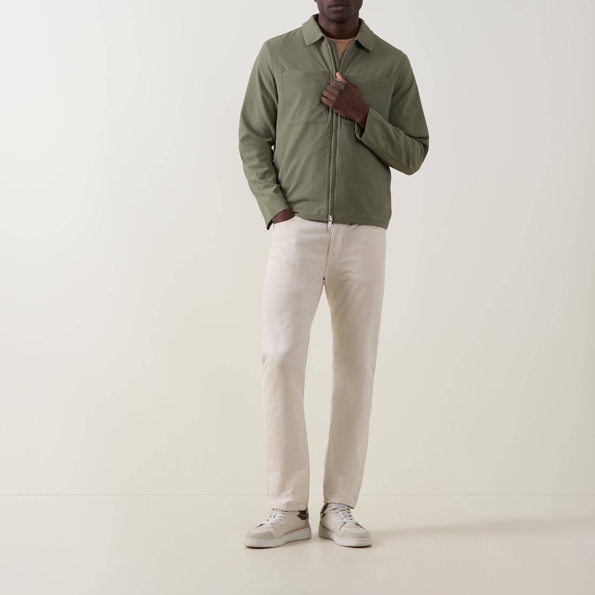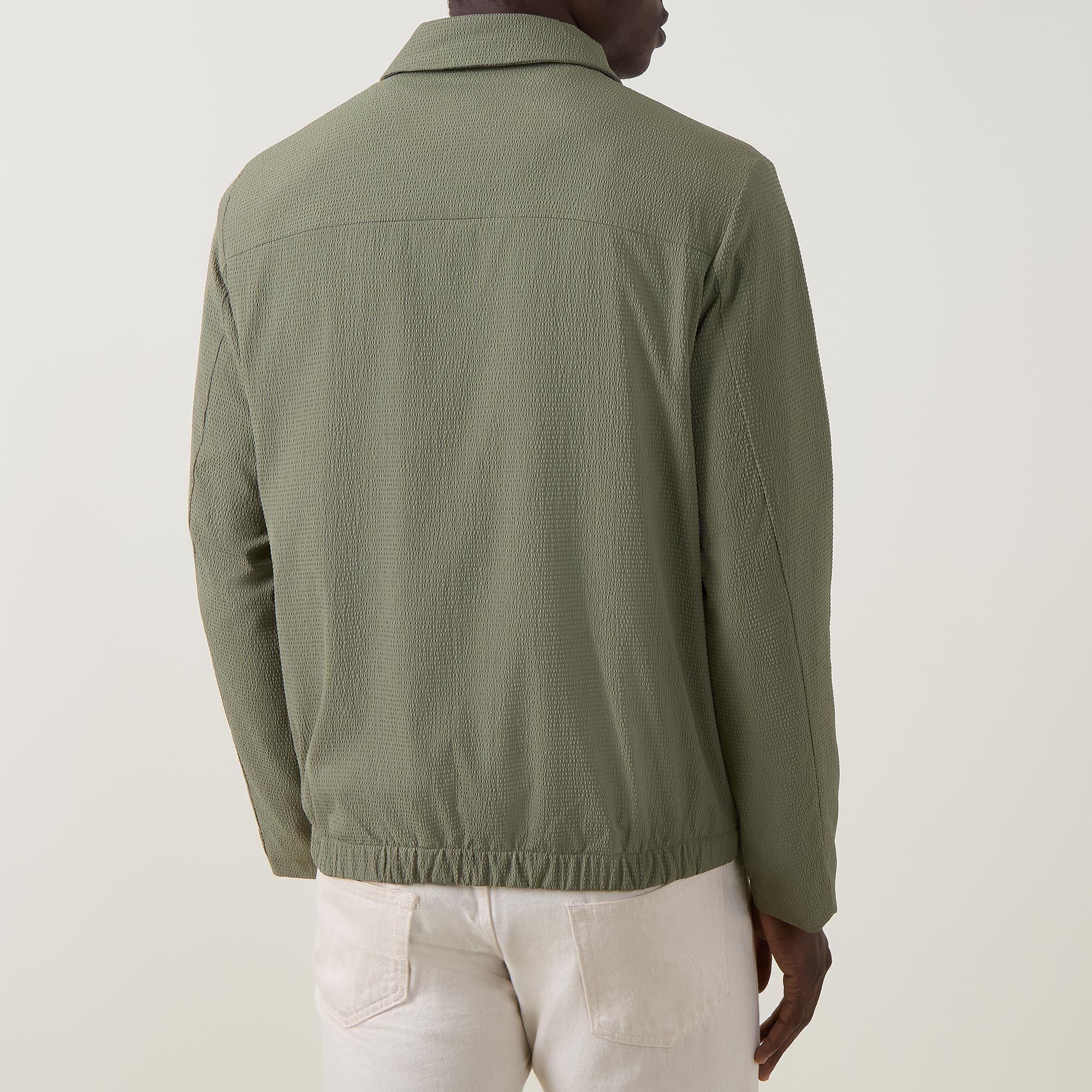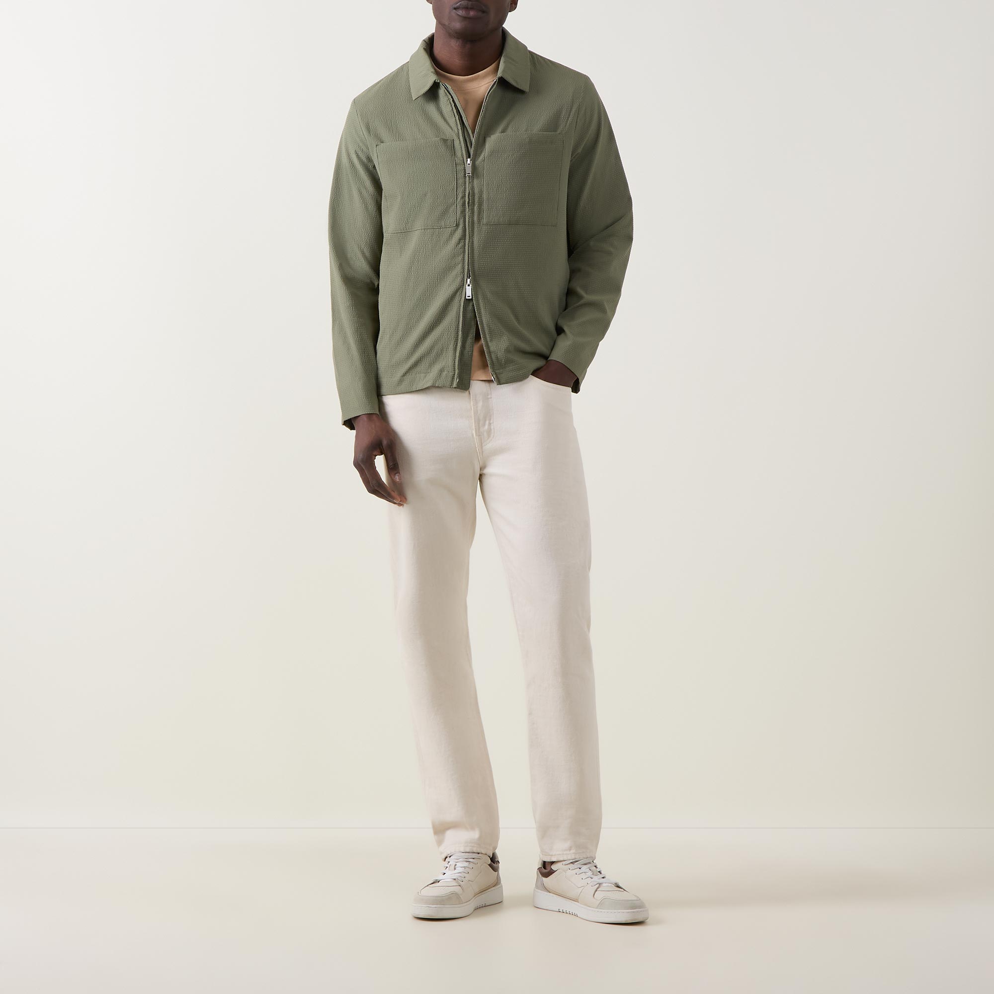 - Seersucker texture, two chest patch pockets, zip-up placket, long sleeves, shirt collar