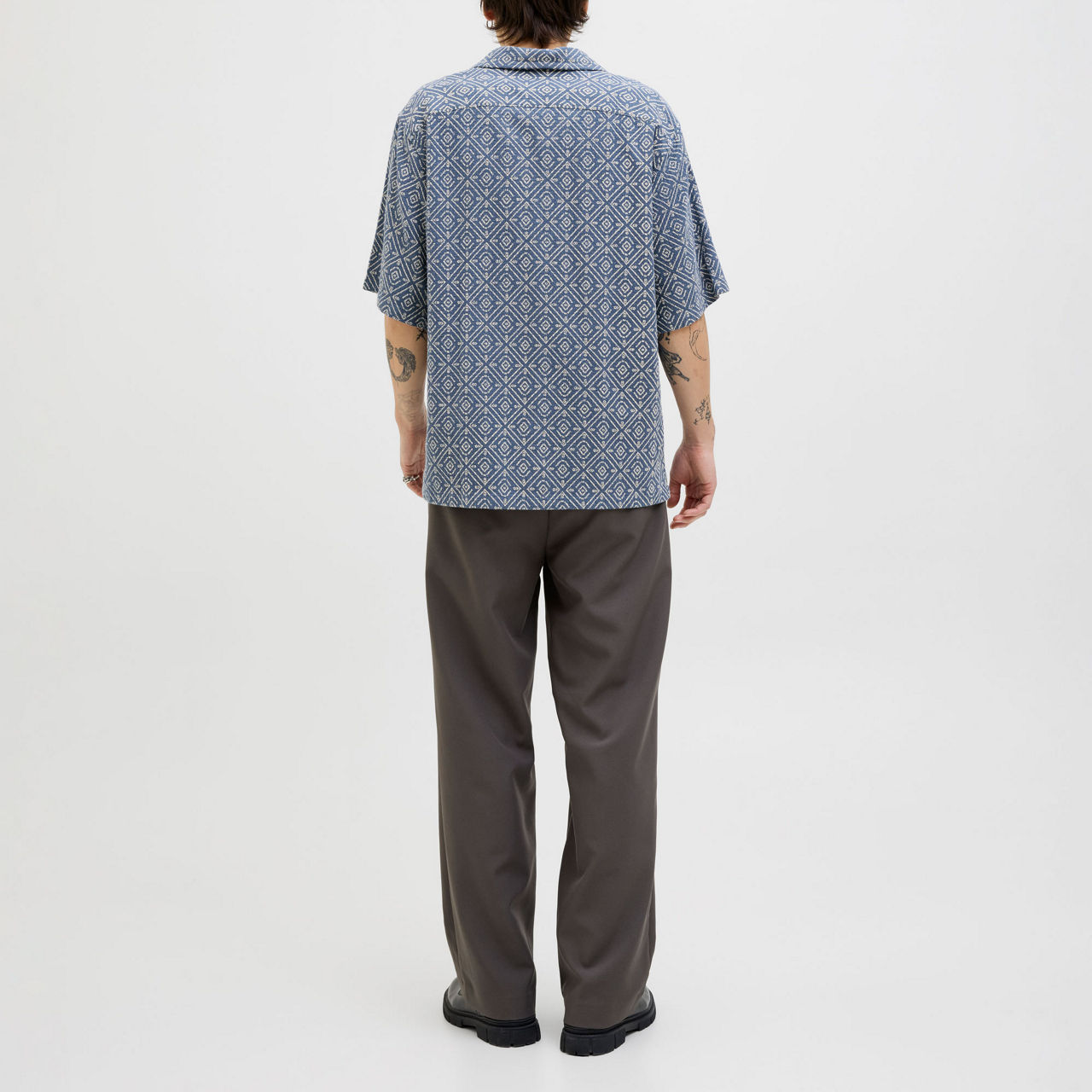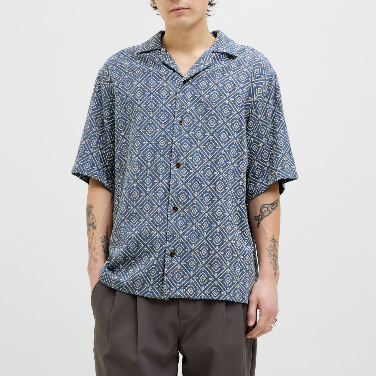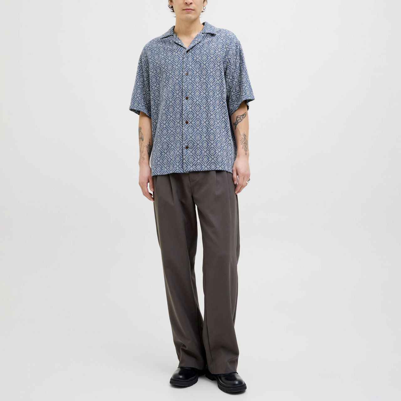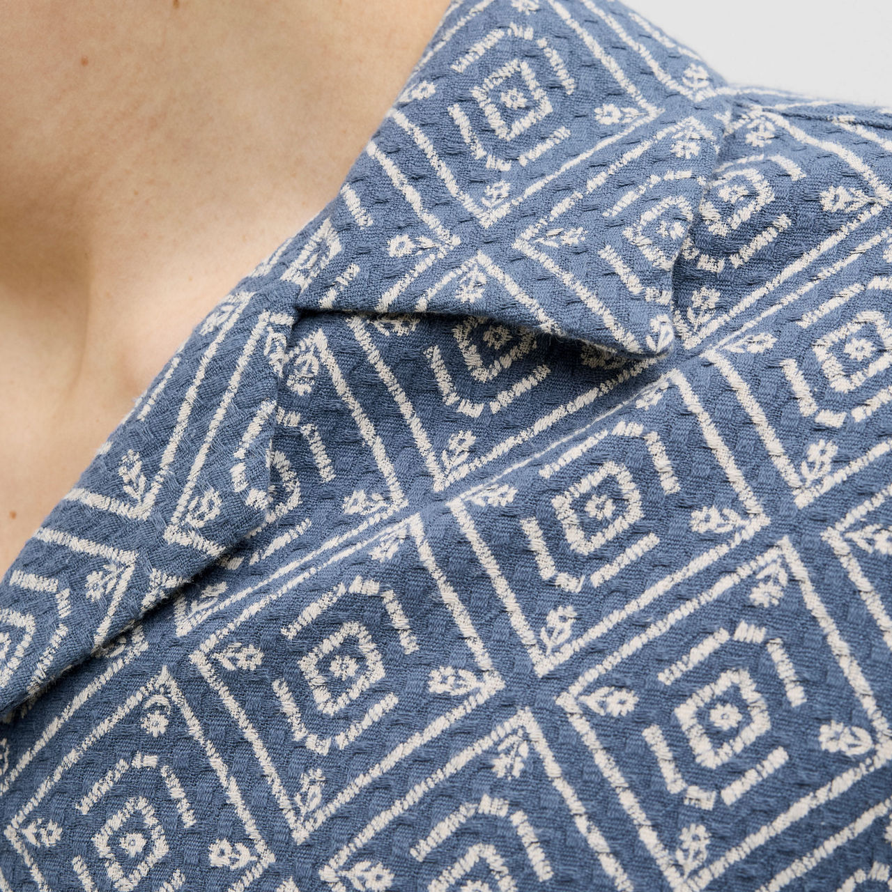 - Dobby fabric, geometric pattern, textured finish, resort collar, short sleeves, button fastening