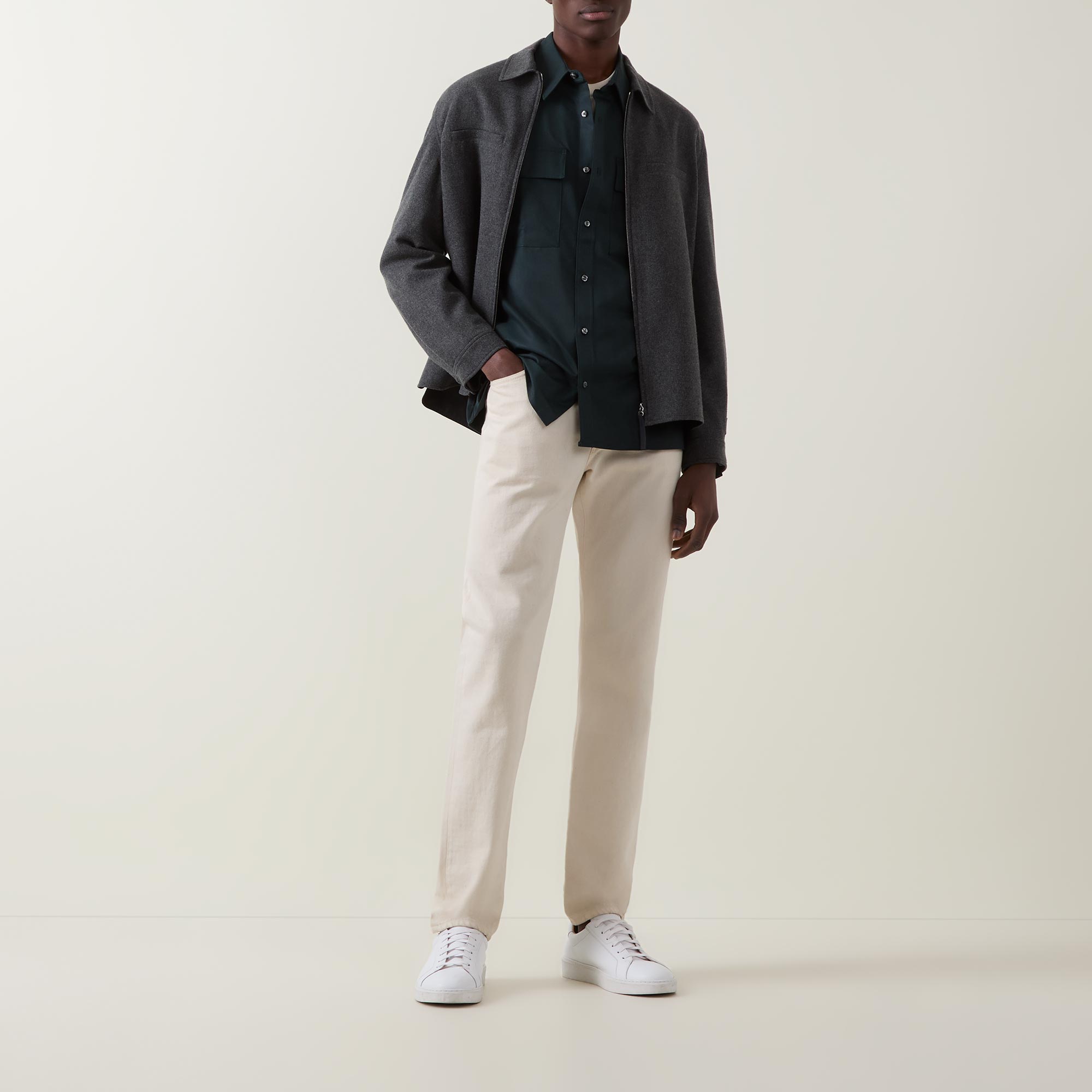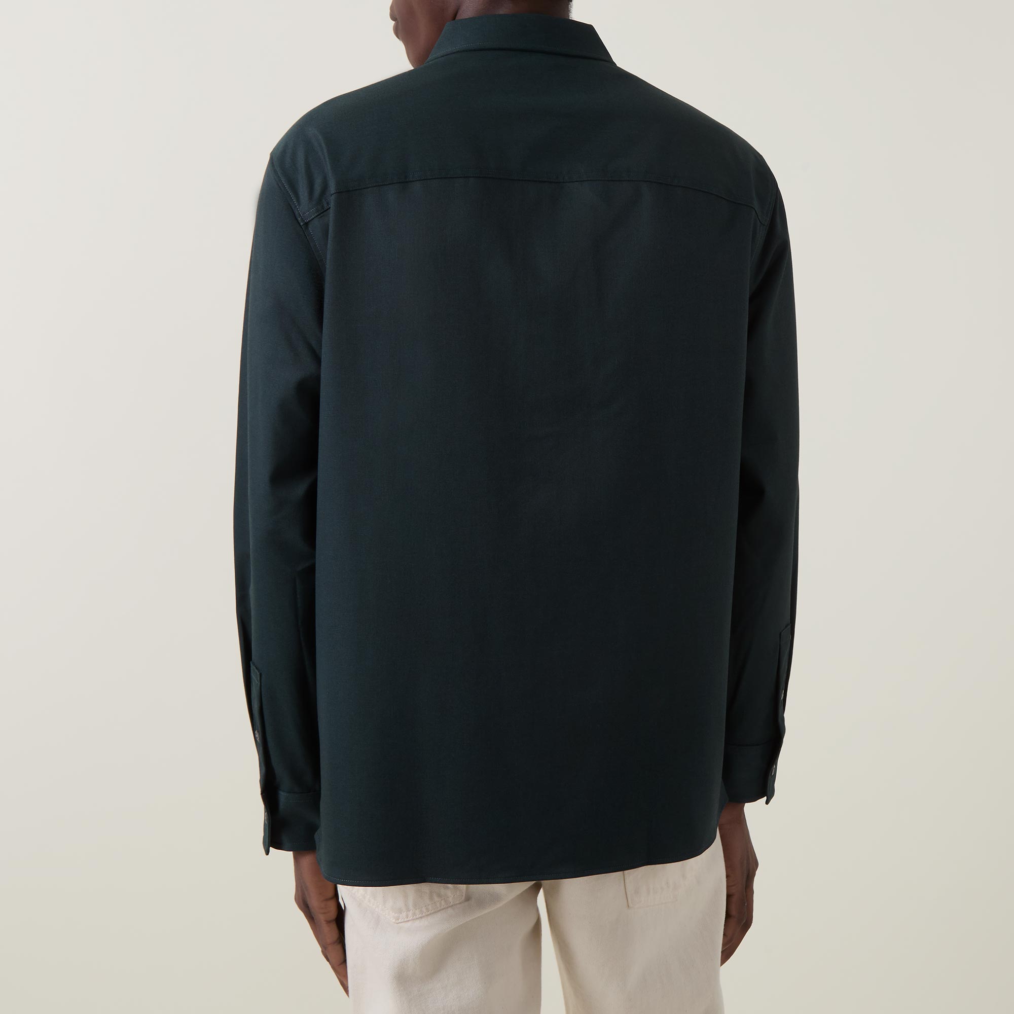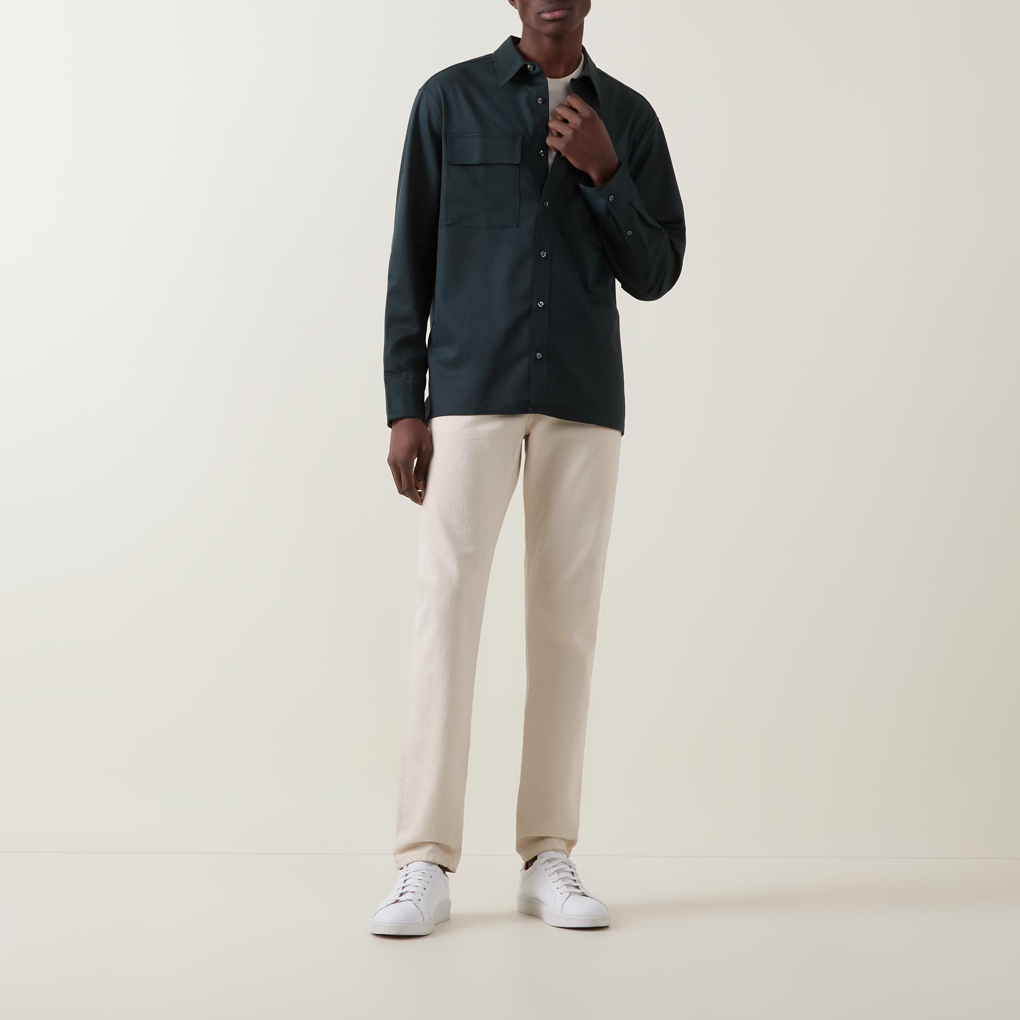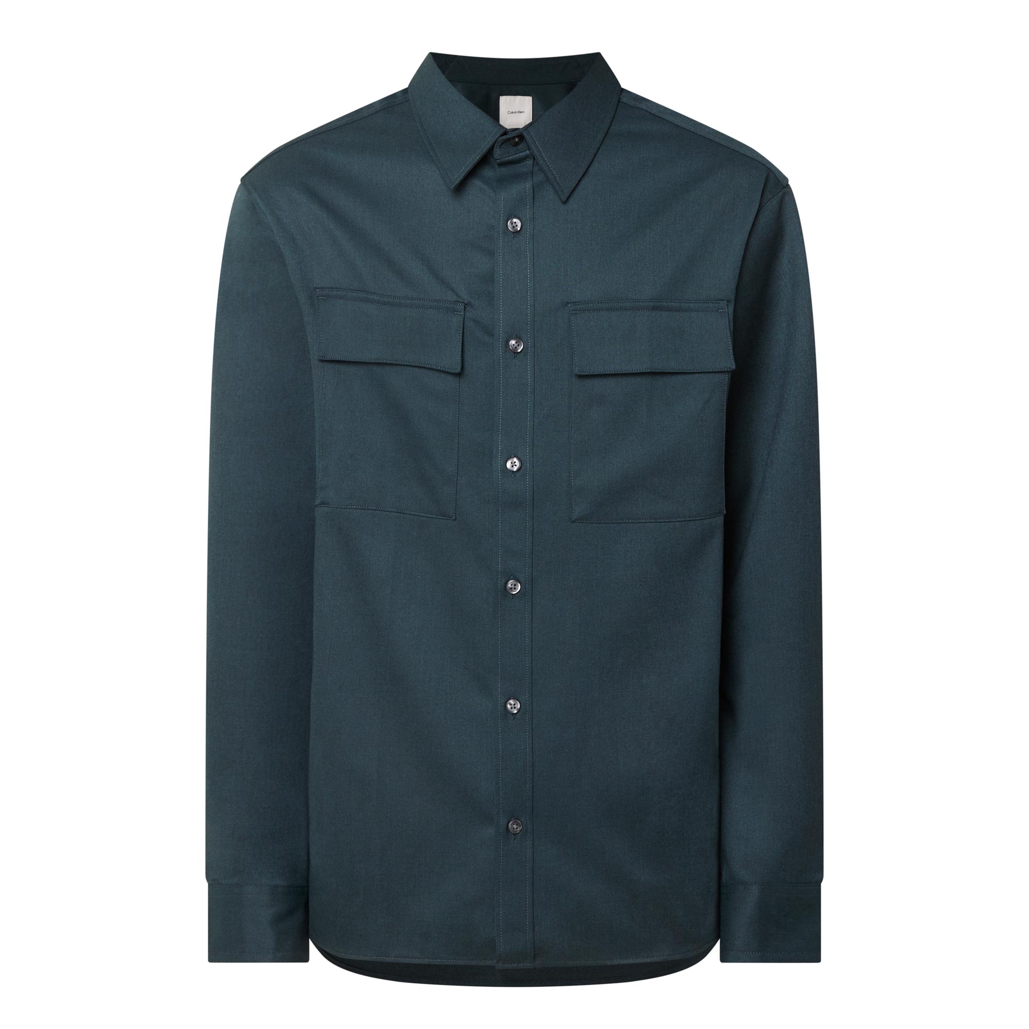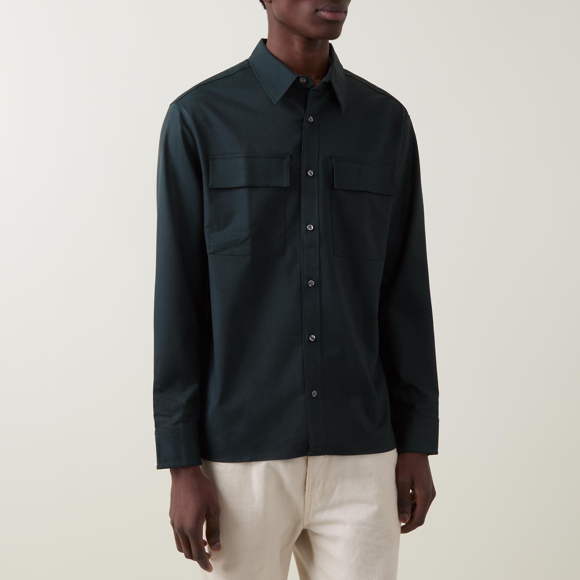 - Pointed collar, button fastening, long sleeves, single-cuff, chest patch pockets, straight hemline, embroidered logo detail