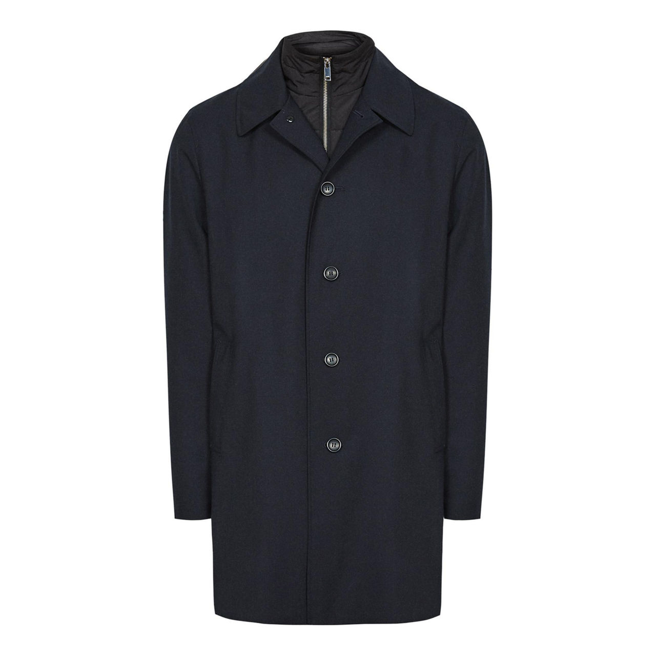- Longline silhouette, removable zip-neck insert, notch lapels, single-breasted, five-button fastening, single vent to reverse, gilet insert, zip fastening, fully lined
