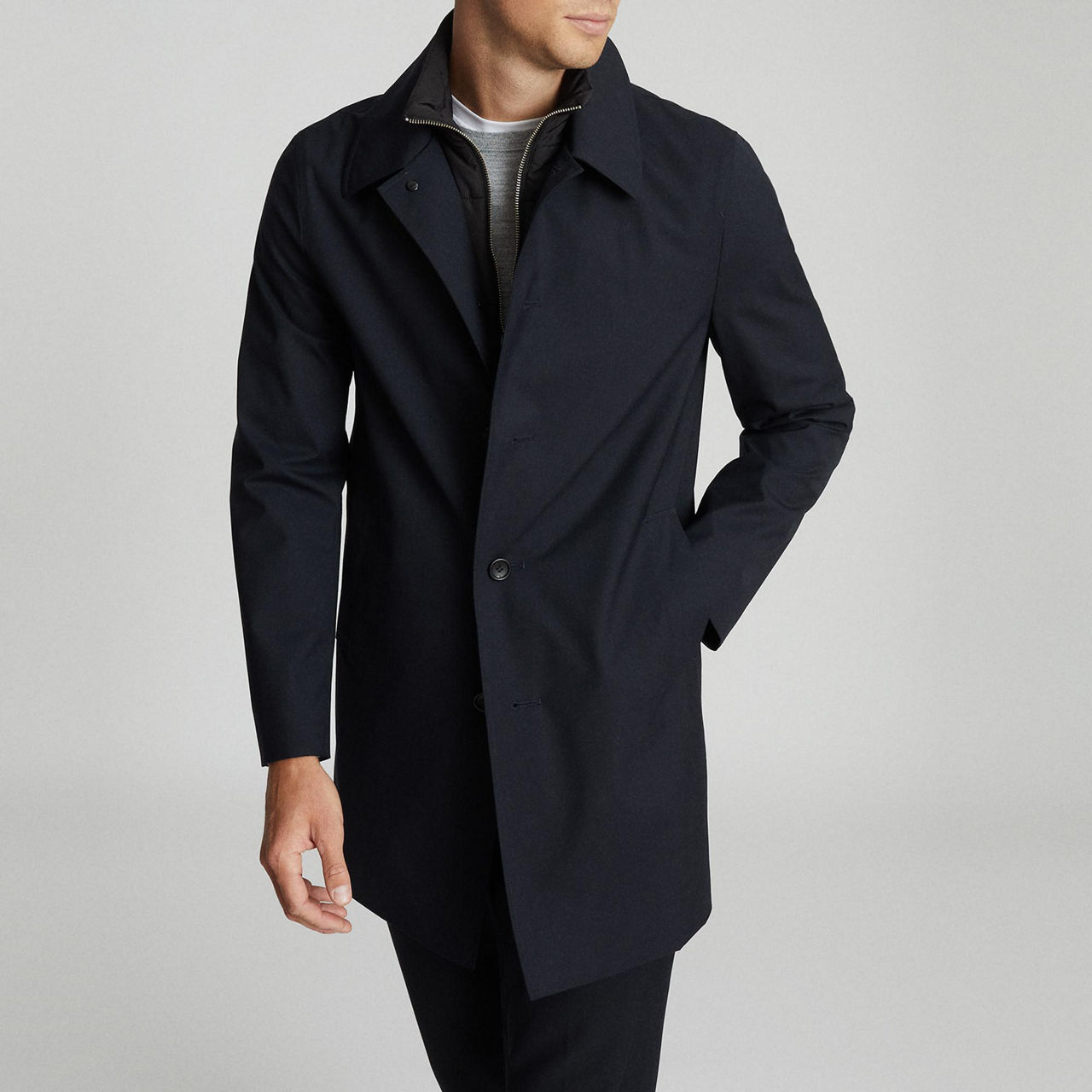 Reiss' stylish Perrin mackintosh makes staying dry a matter of absolute interest, adding a removable zip-neck that lets you navigate the more transitional Spring climate in comfort. Keeping the mackintosh's classic longline silhouette, it's a weather-conscious piece that works with both smart-casual and tailored looks with ease.