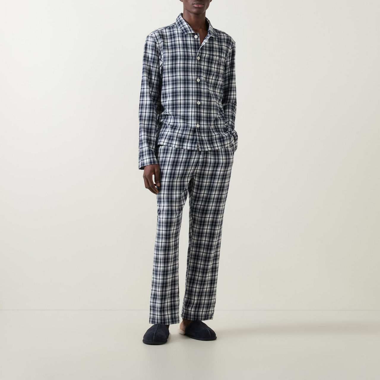 - Check pattern, long sleeves, button fastenings, packaged in gift box, elasticated waist, side pockets on bottoms