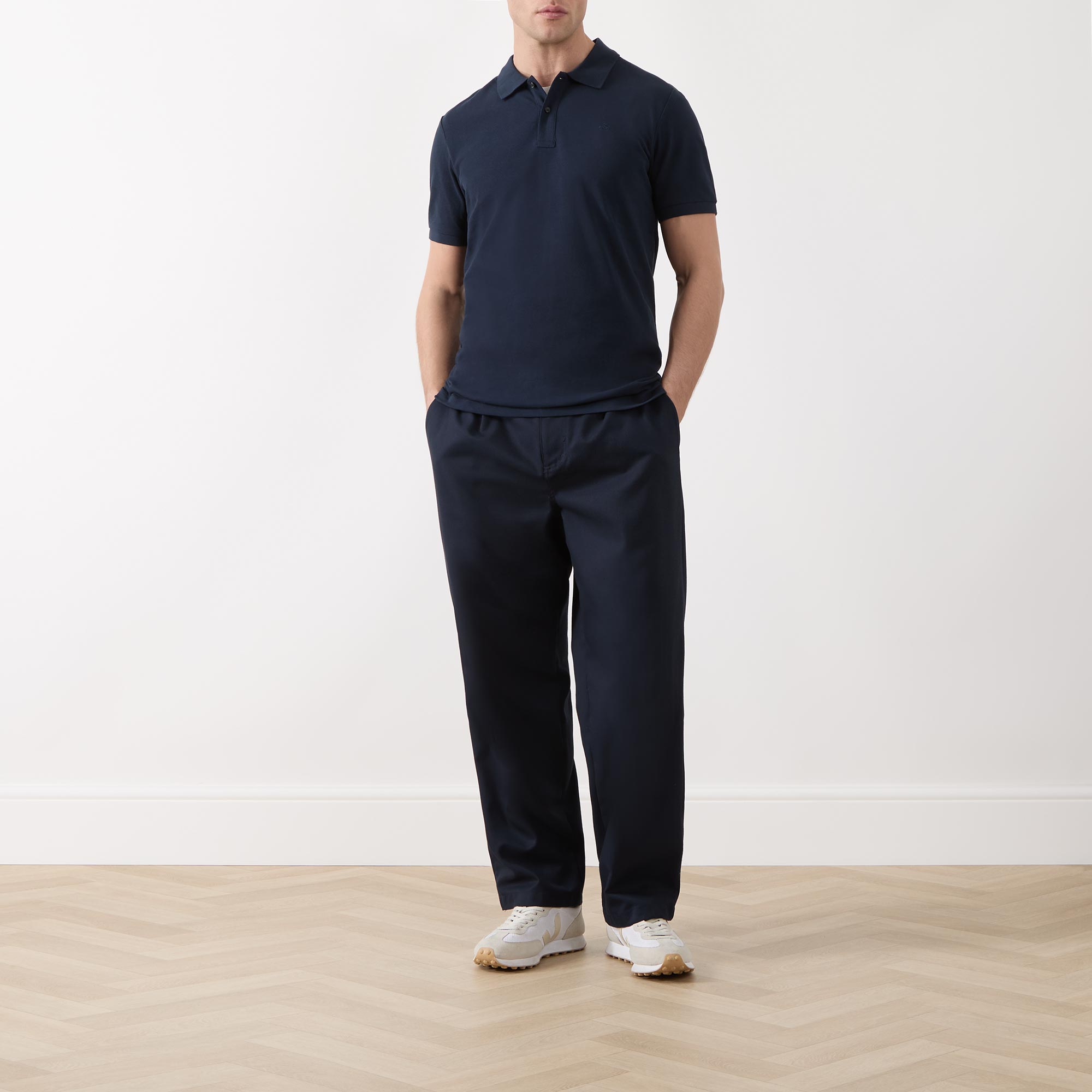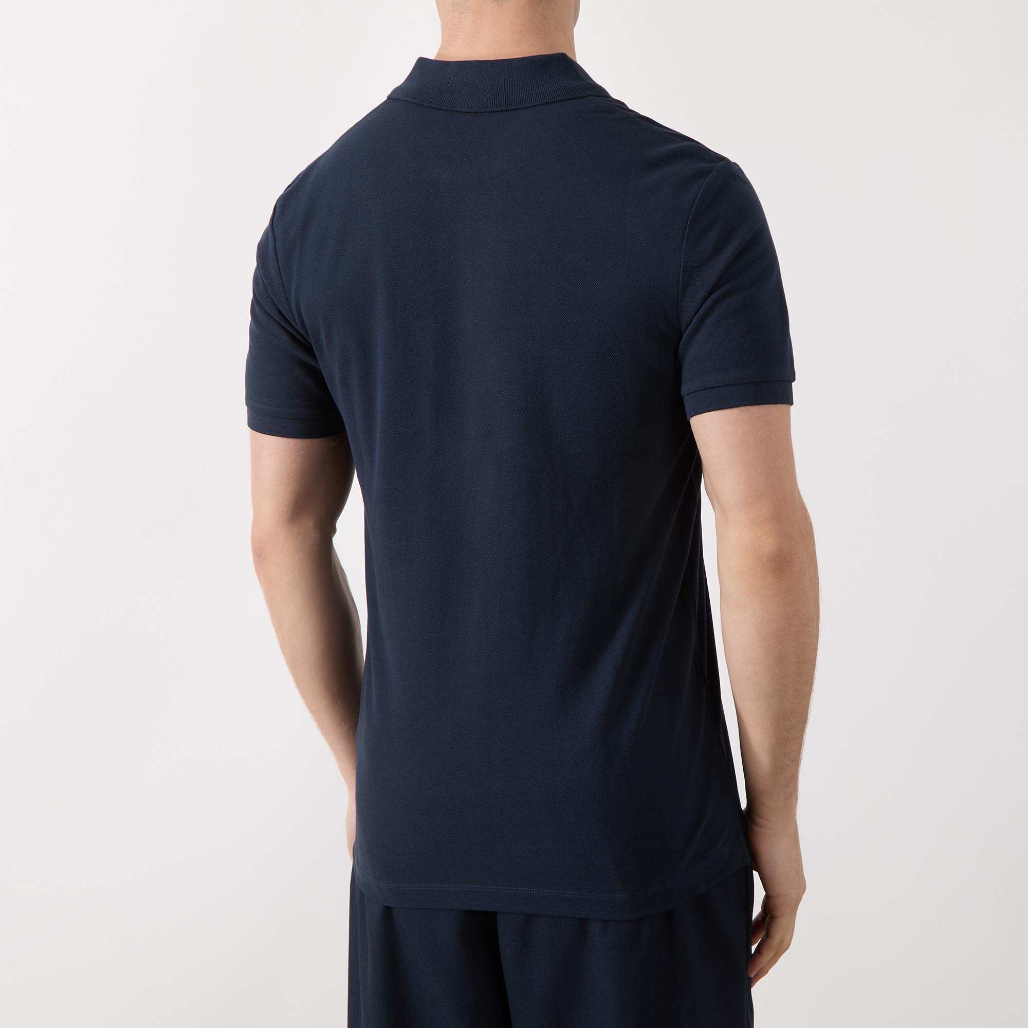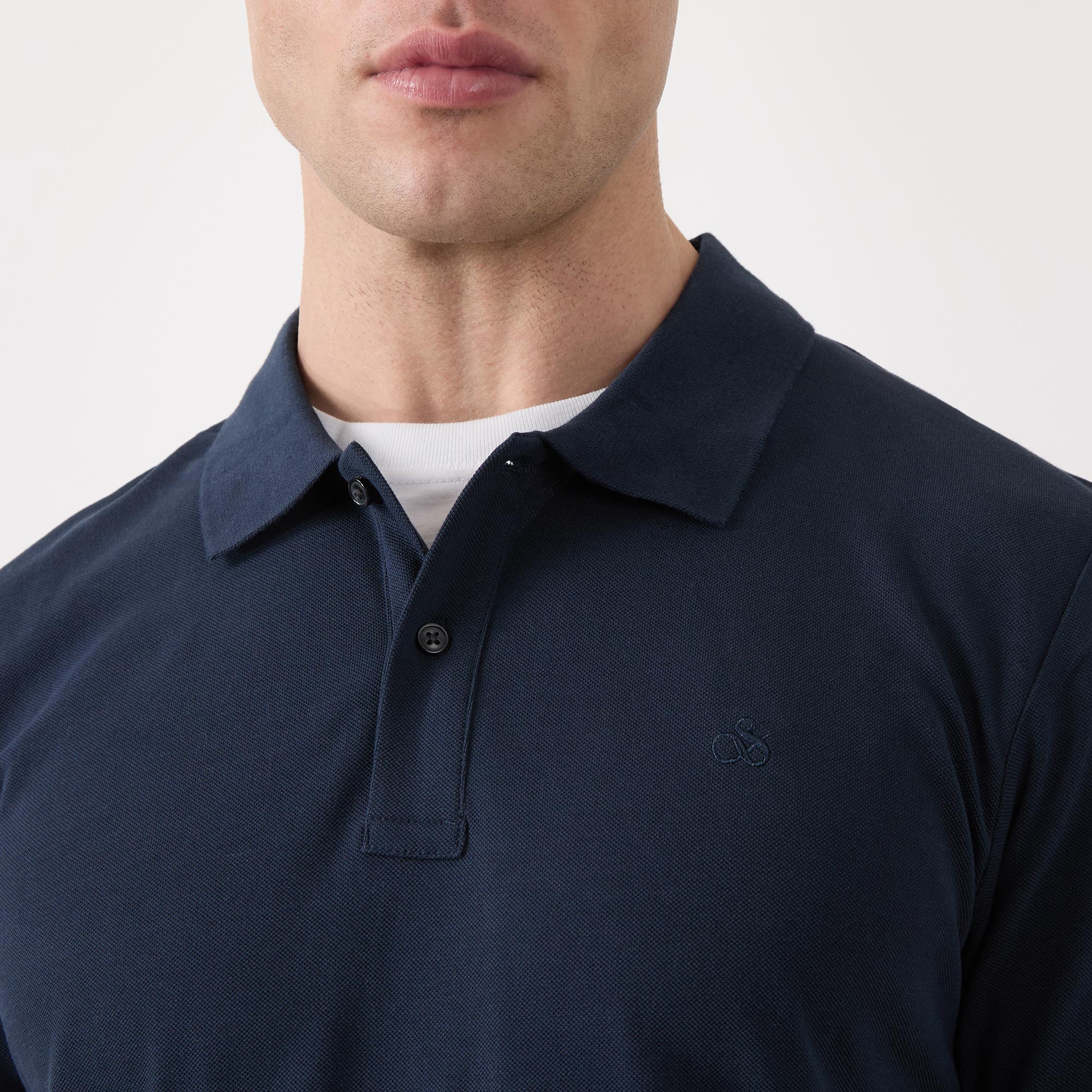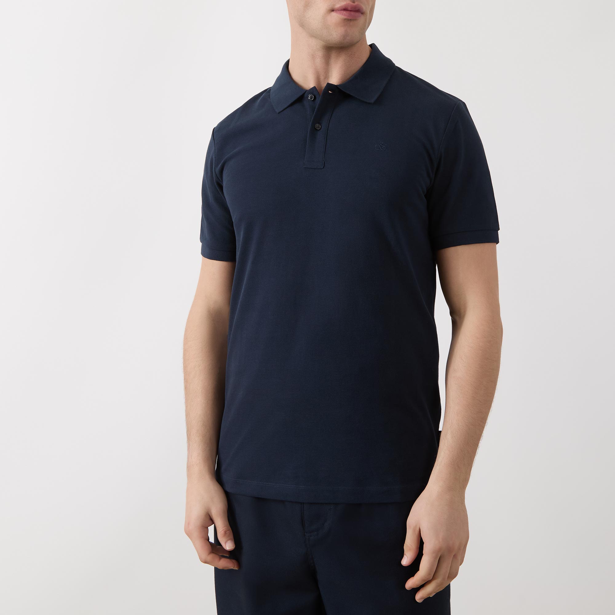 - Short sleeves, flat polo collar, two-button collar, tonal stitching, straight hemline, smooth fabric