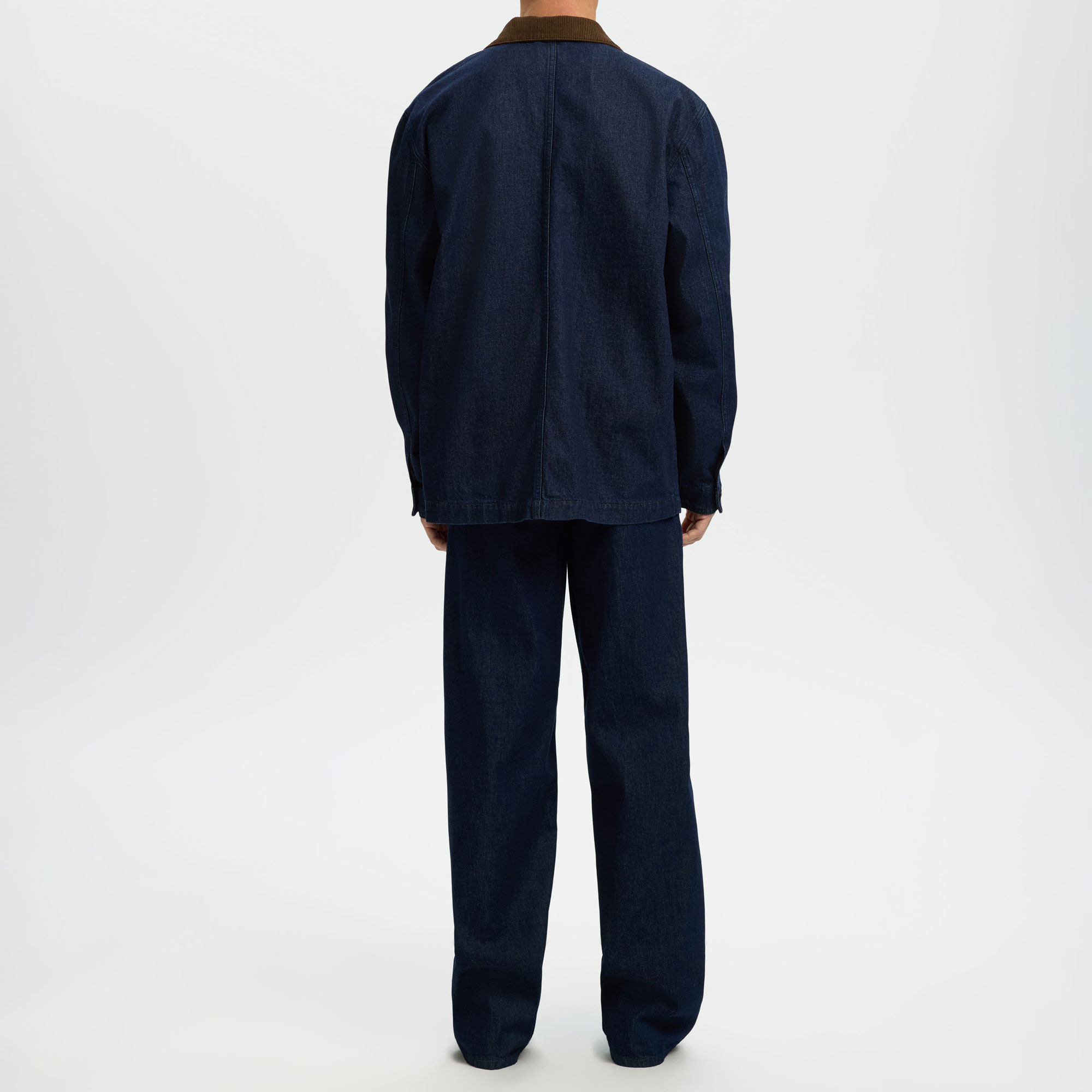 - Denim, high stand-up collar, button fastenings, chest pocket, front pockets