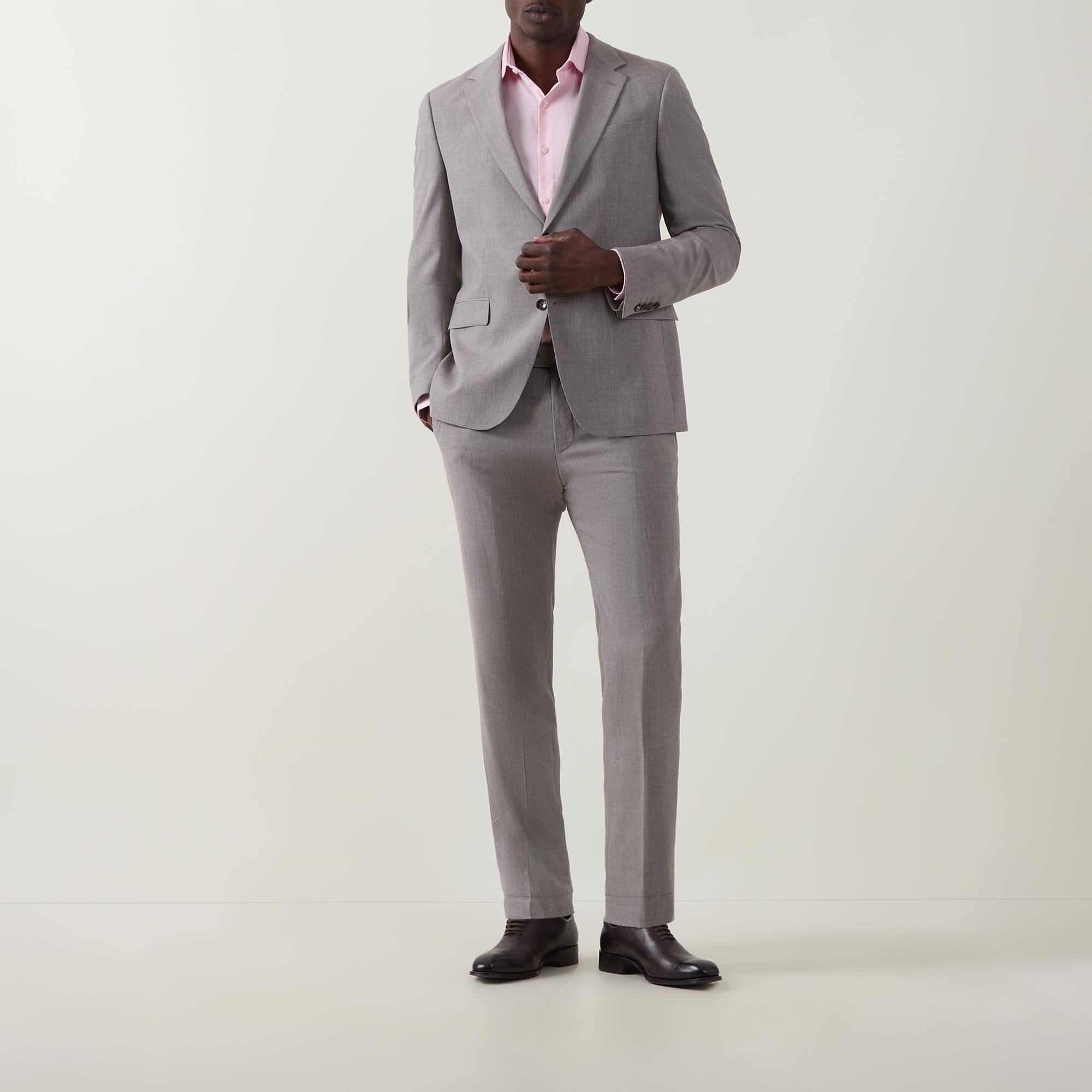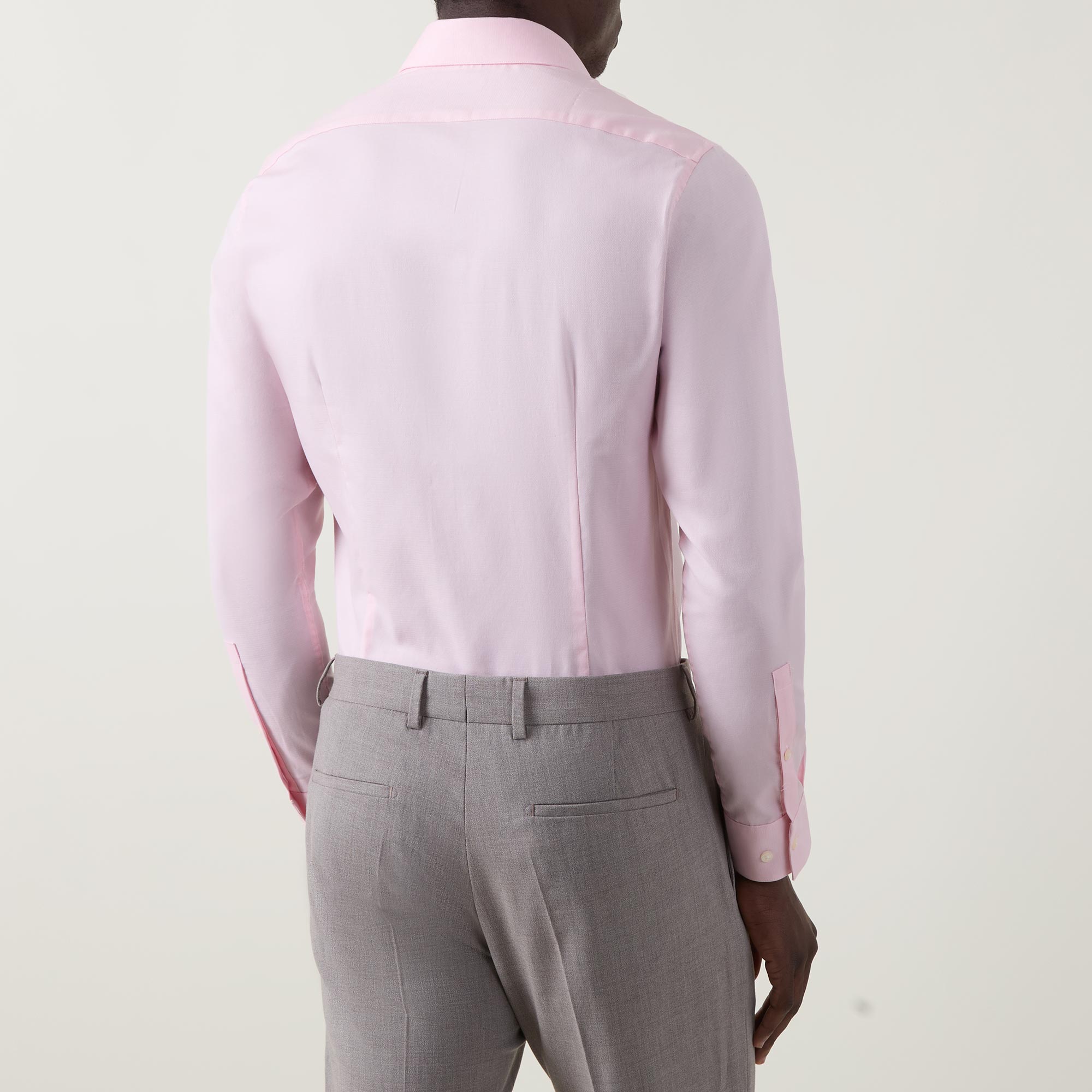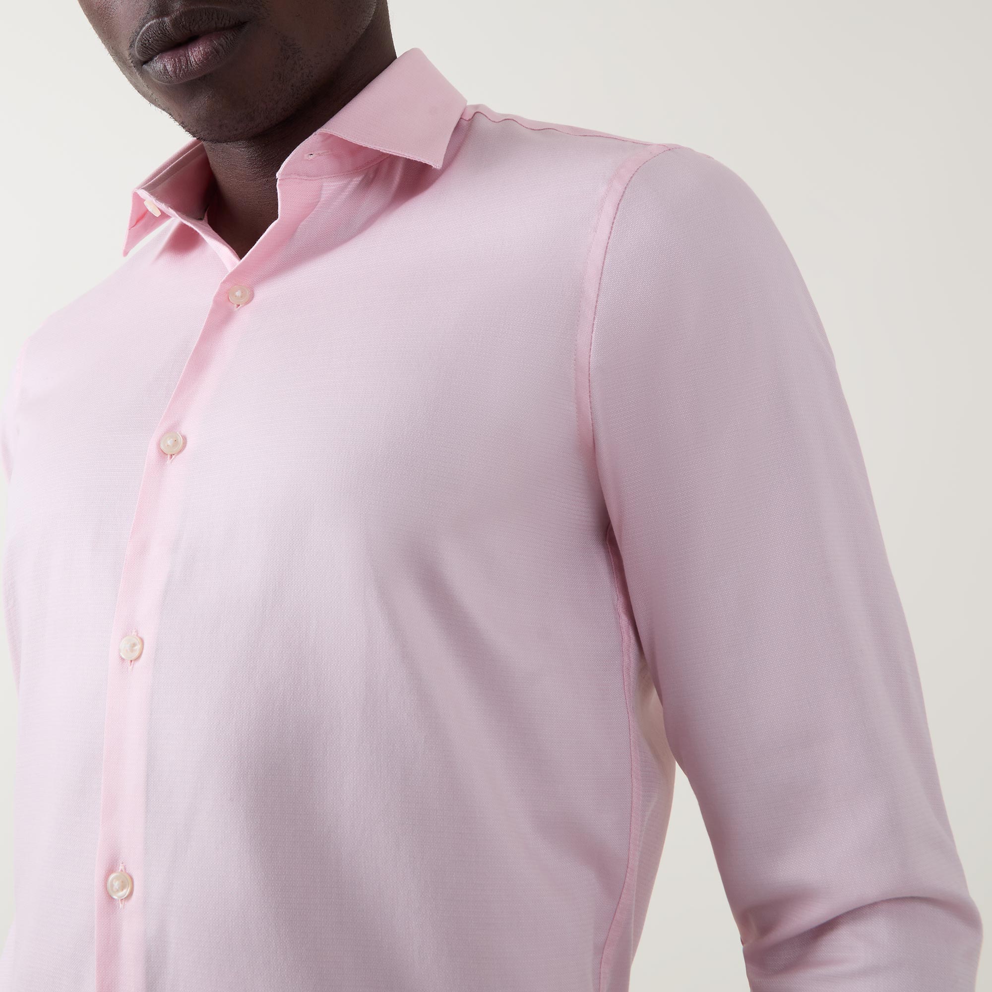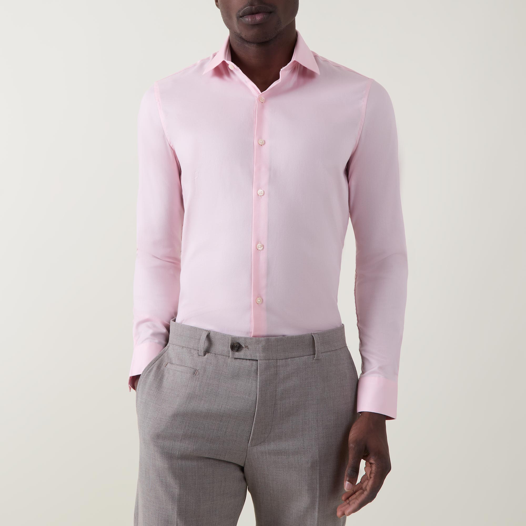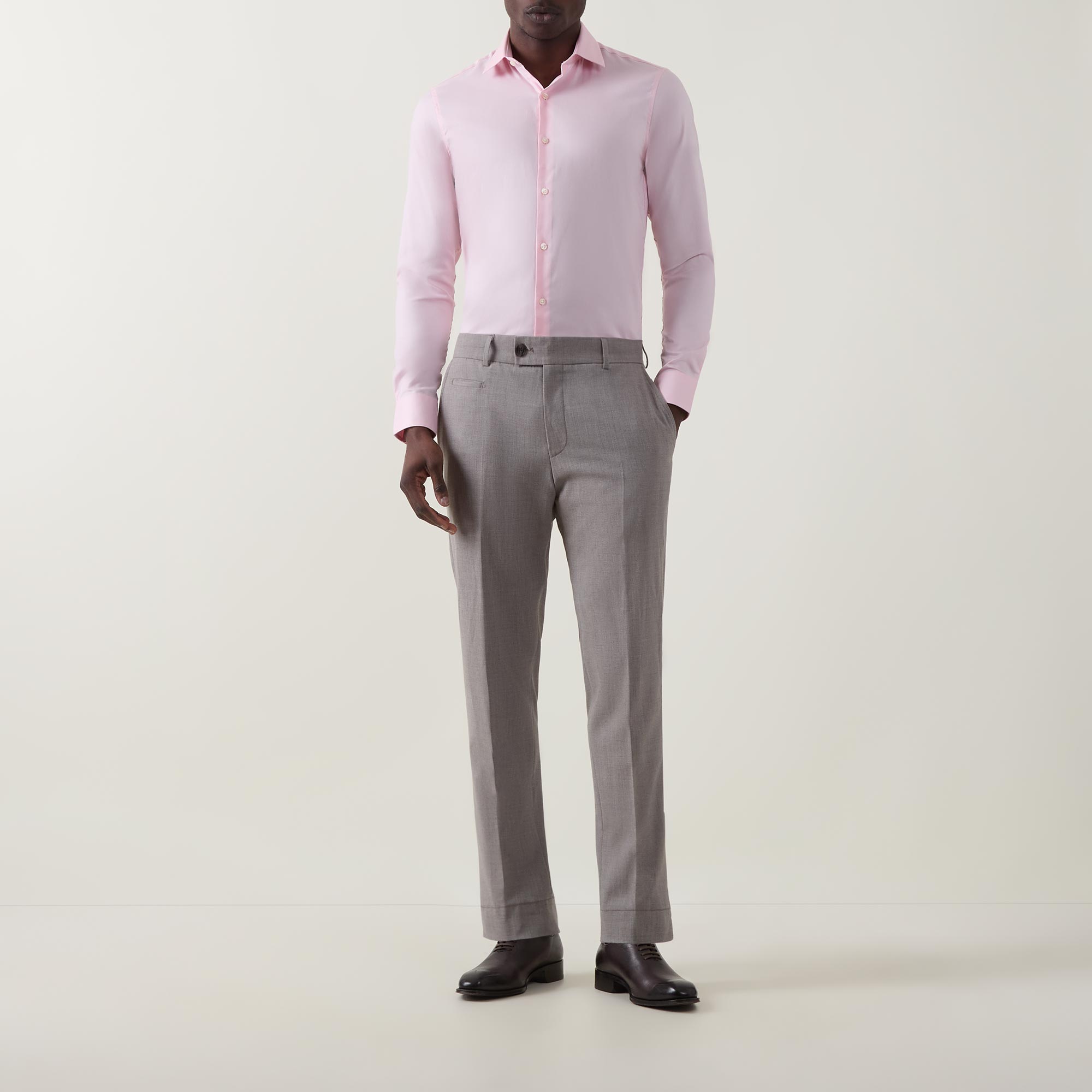 - Classic collar, button fastening, long sleeves, single-cuff, curved hemline, solid poplin fabric