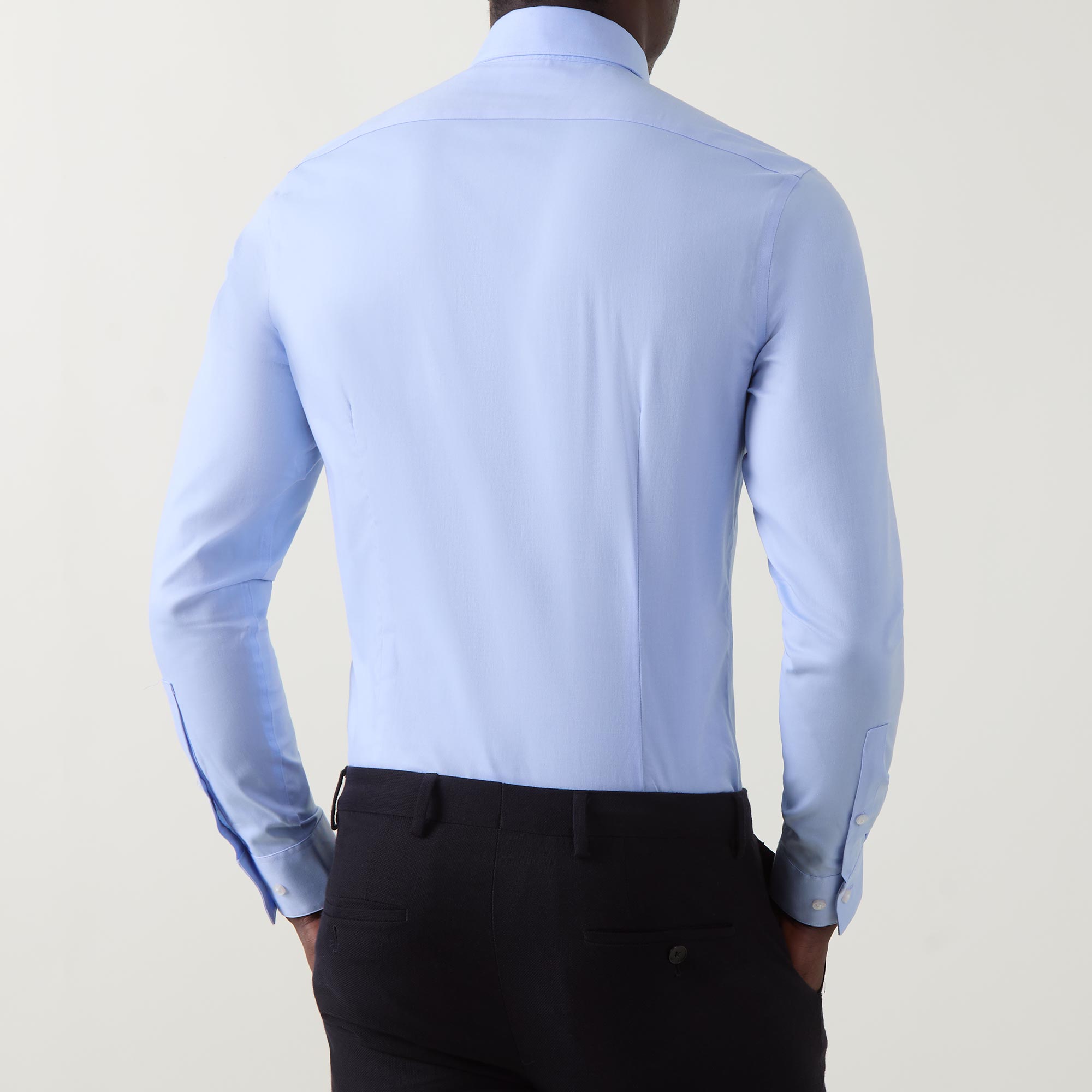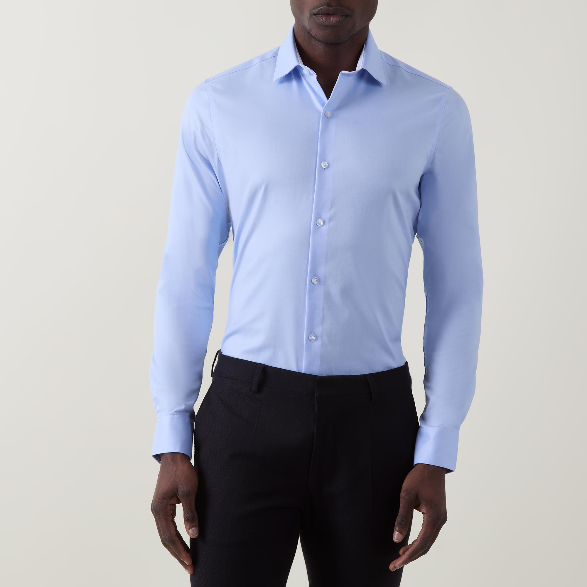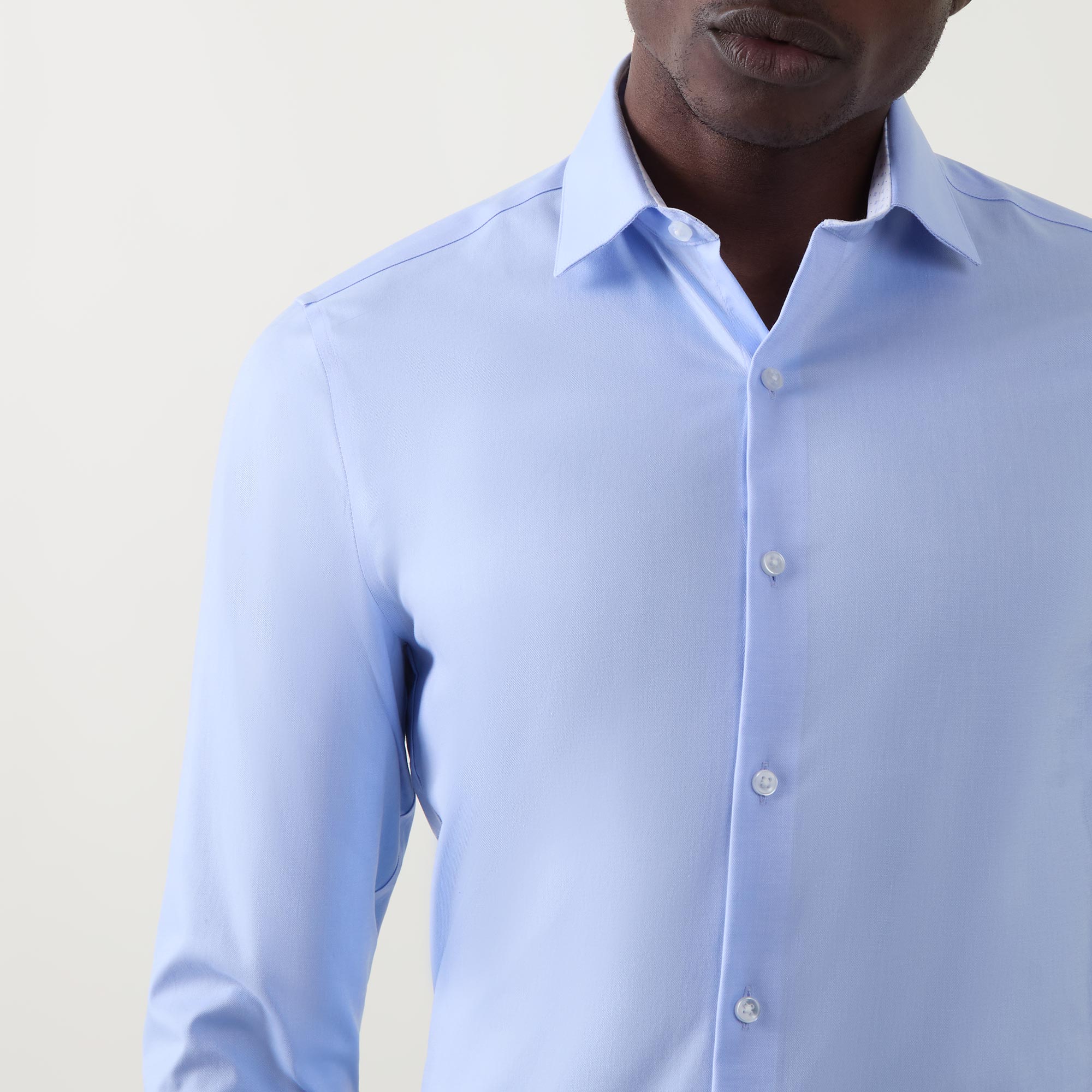 - Classic collar, button fastening, long sleeves, single-cuff, curved hemline, solid twill fabric