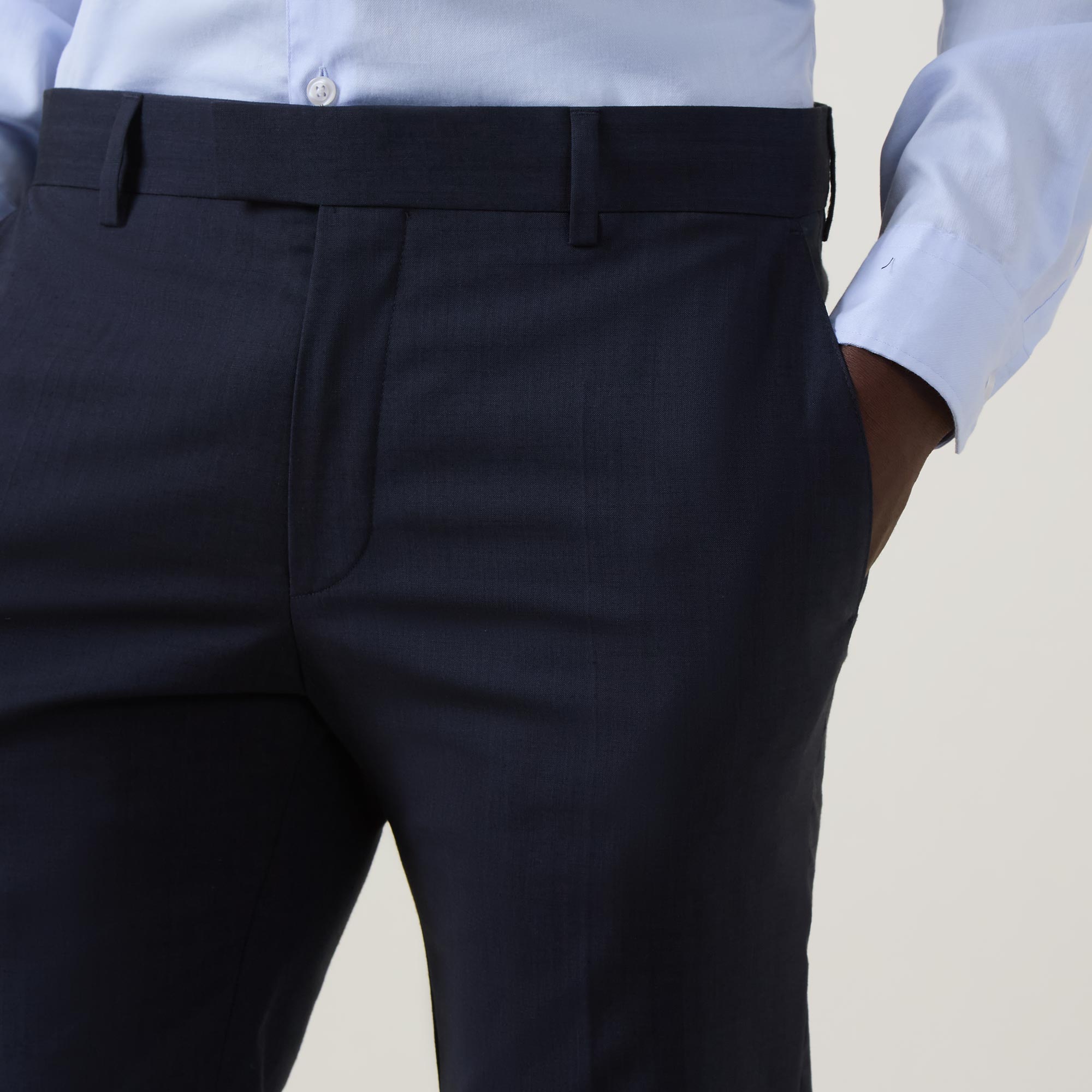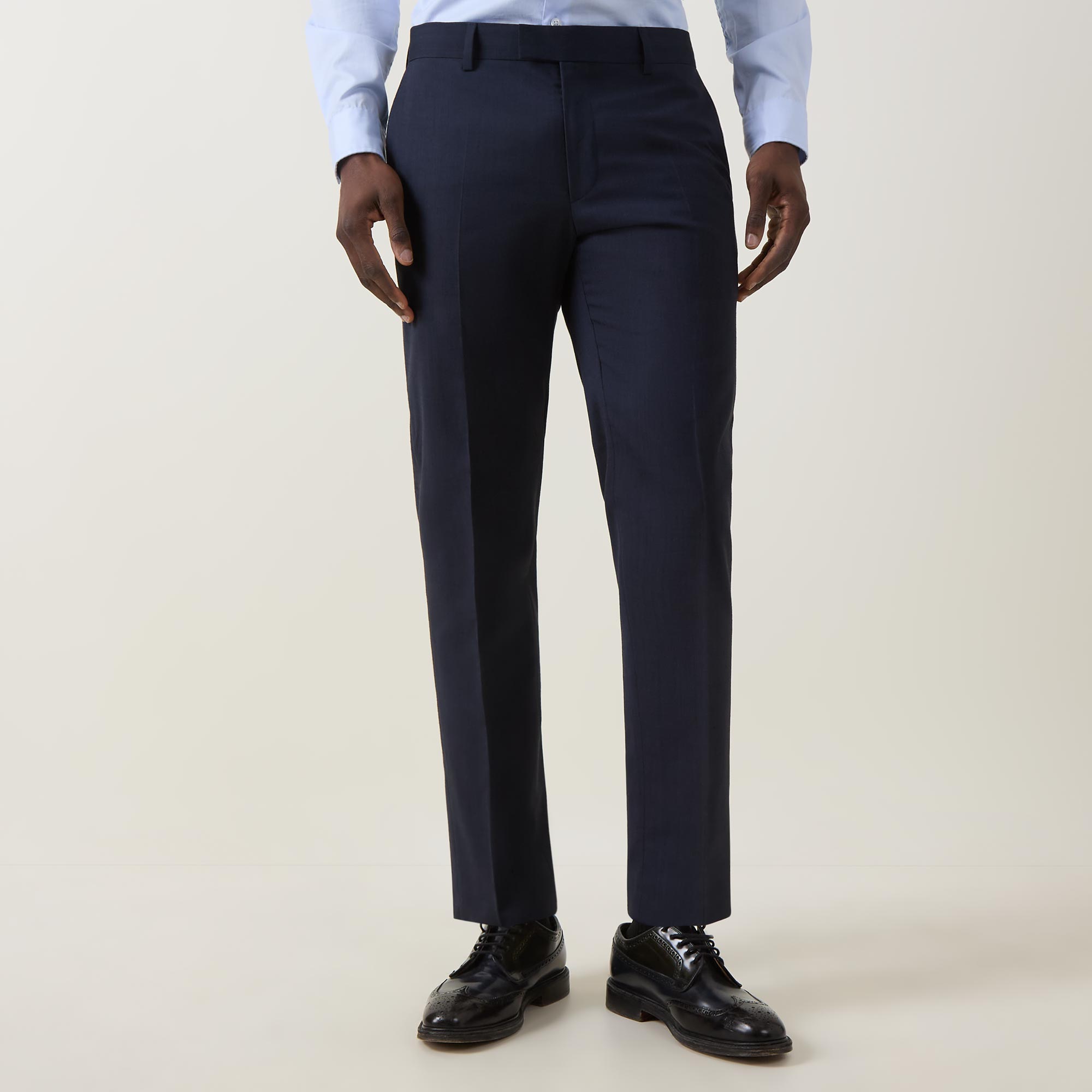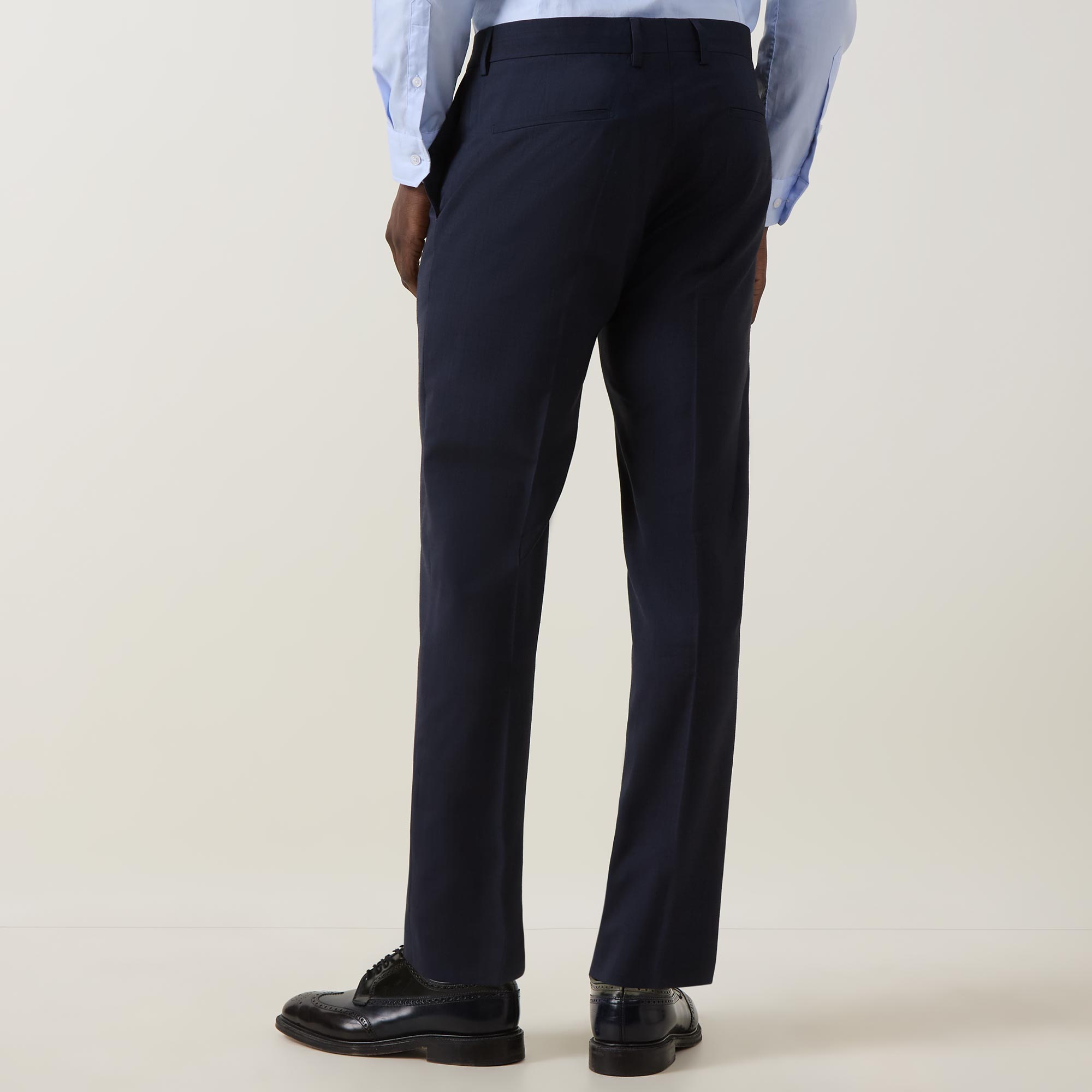 - Tab and fly zip fastening, belt loops, side entry pockets, rear jet pockets, straight-cut legs, pressed creases