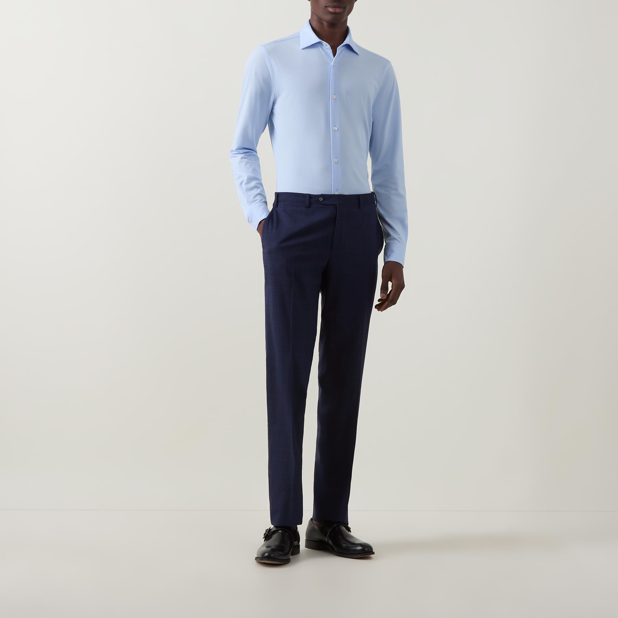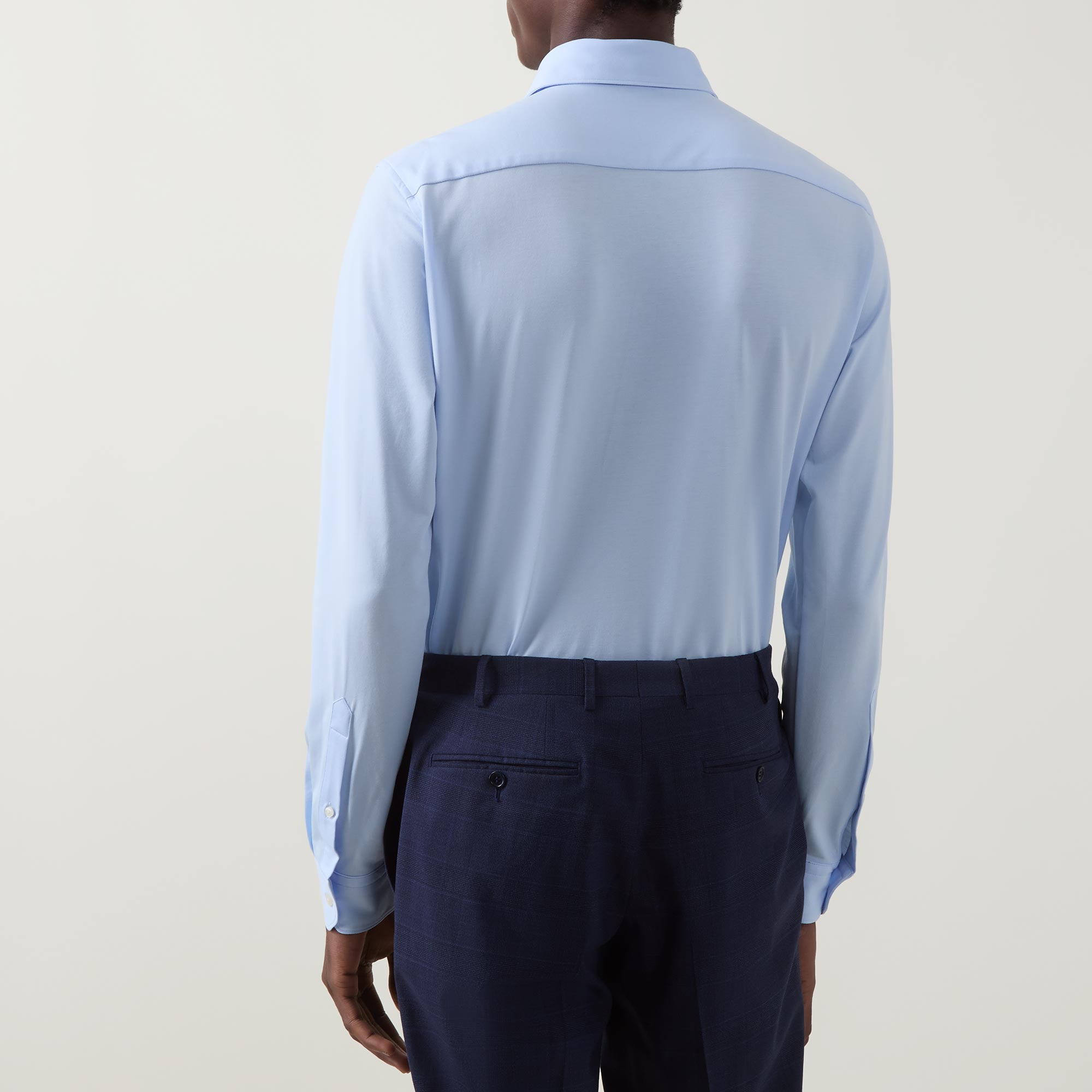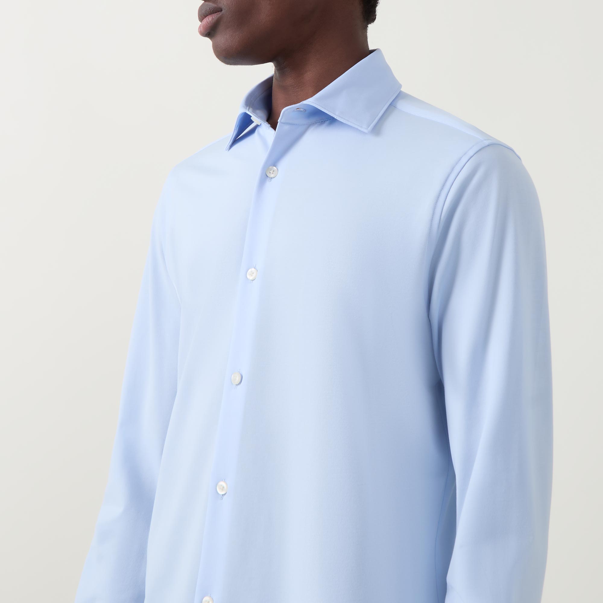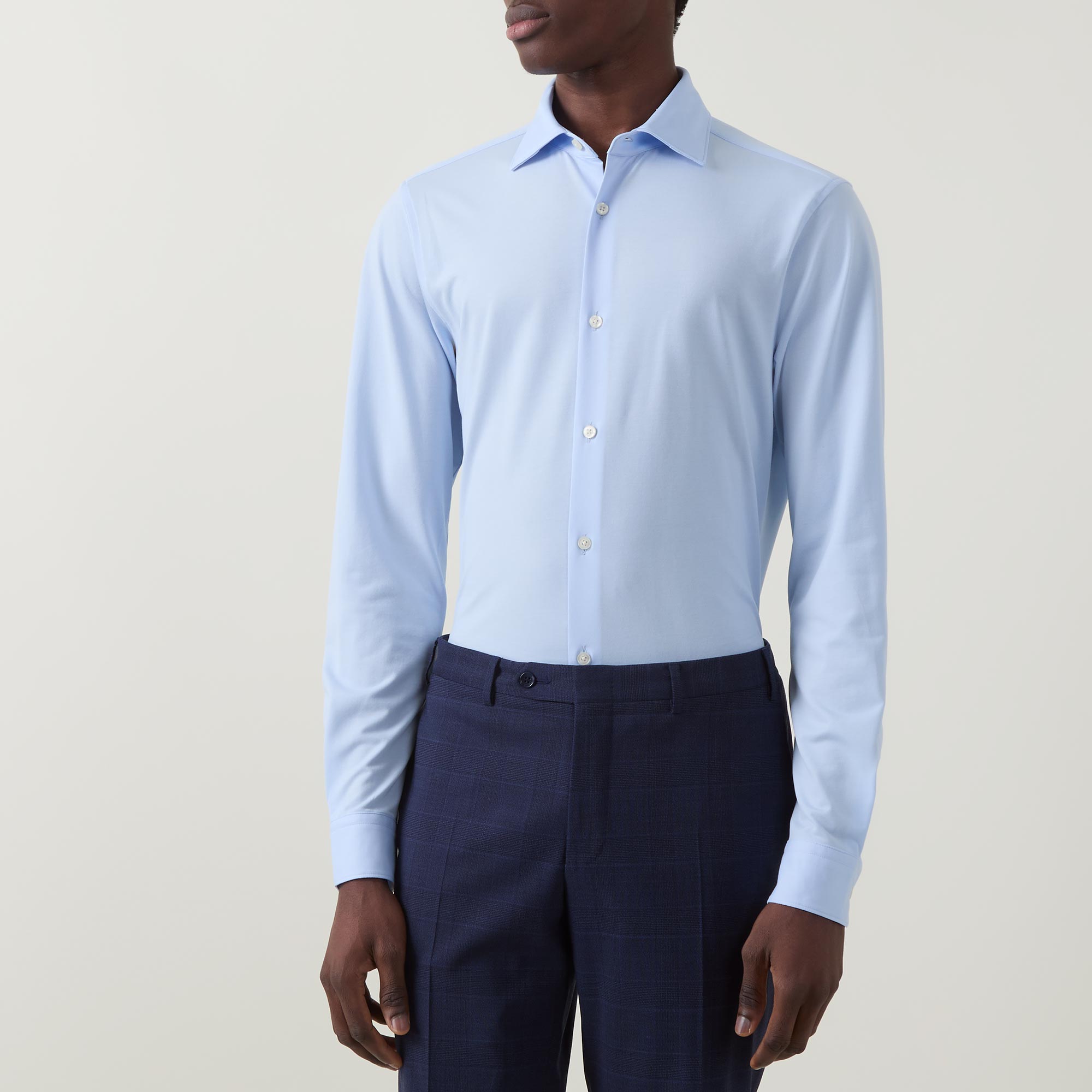 - Kent collar, long sleeves, buttoned cuffs, front button placket, curved hem, tonal stitching, soft jersey finish