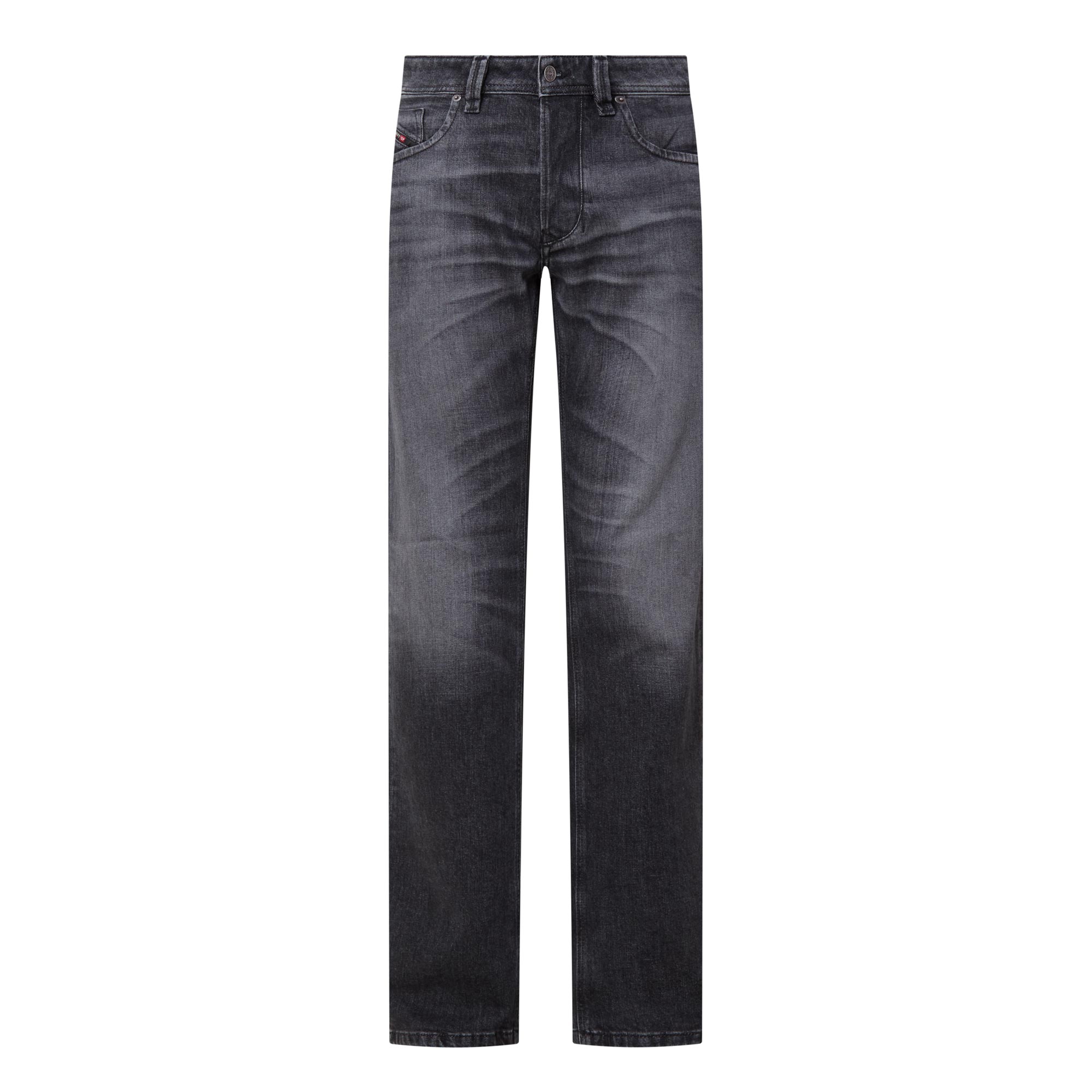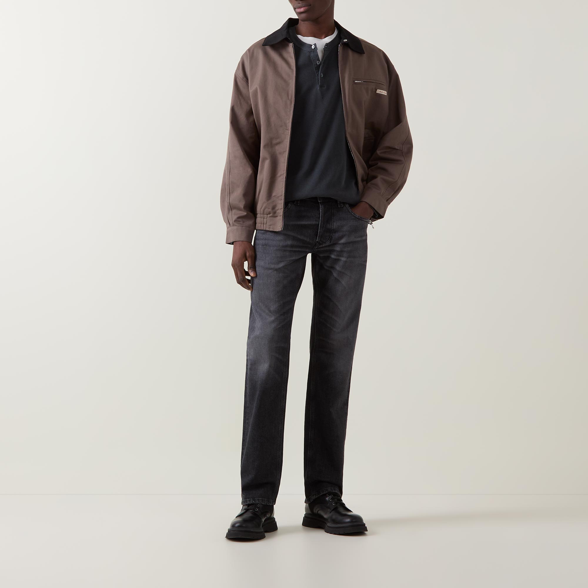 • Relaxed waist, straight leg, five pockets, belt loops, zip and button fastening, logo patch, stitched seams, faded and whiskering details