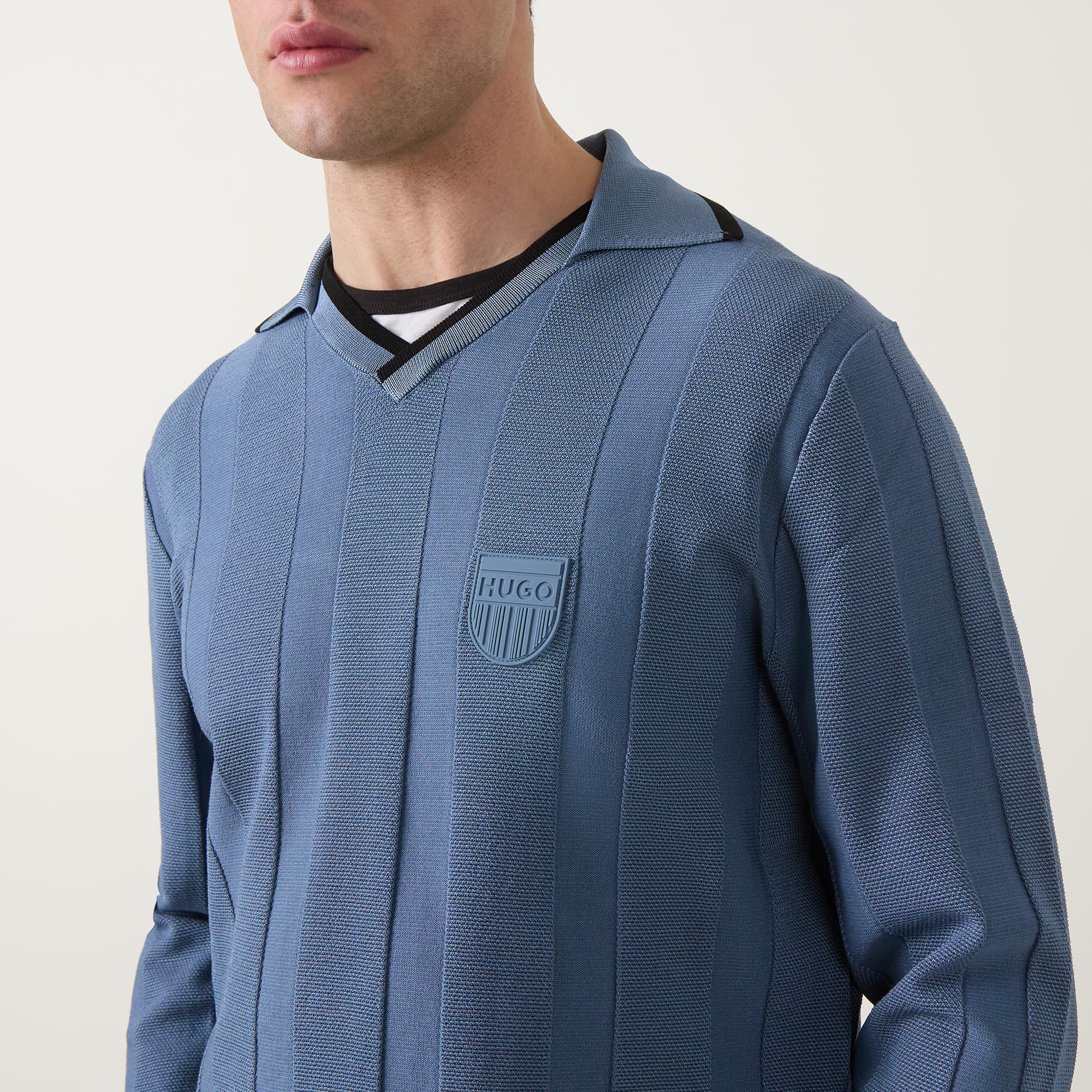 - Open placket, polo collar, long sleeves, tonal stripes, logo detail, straight hemline