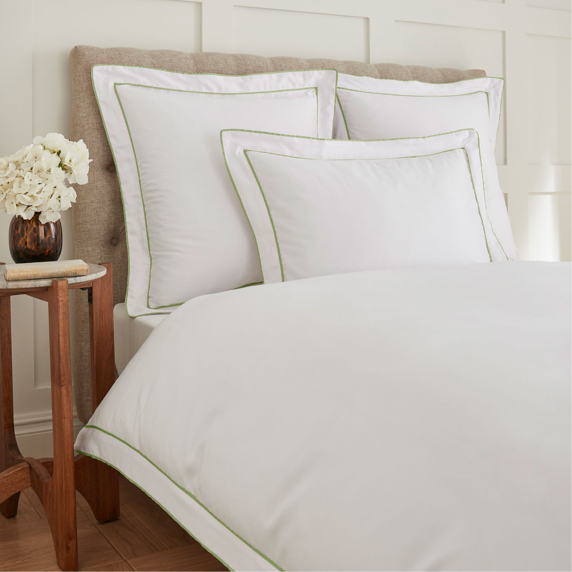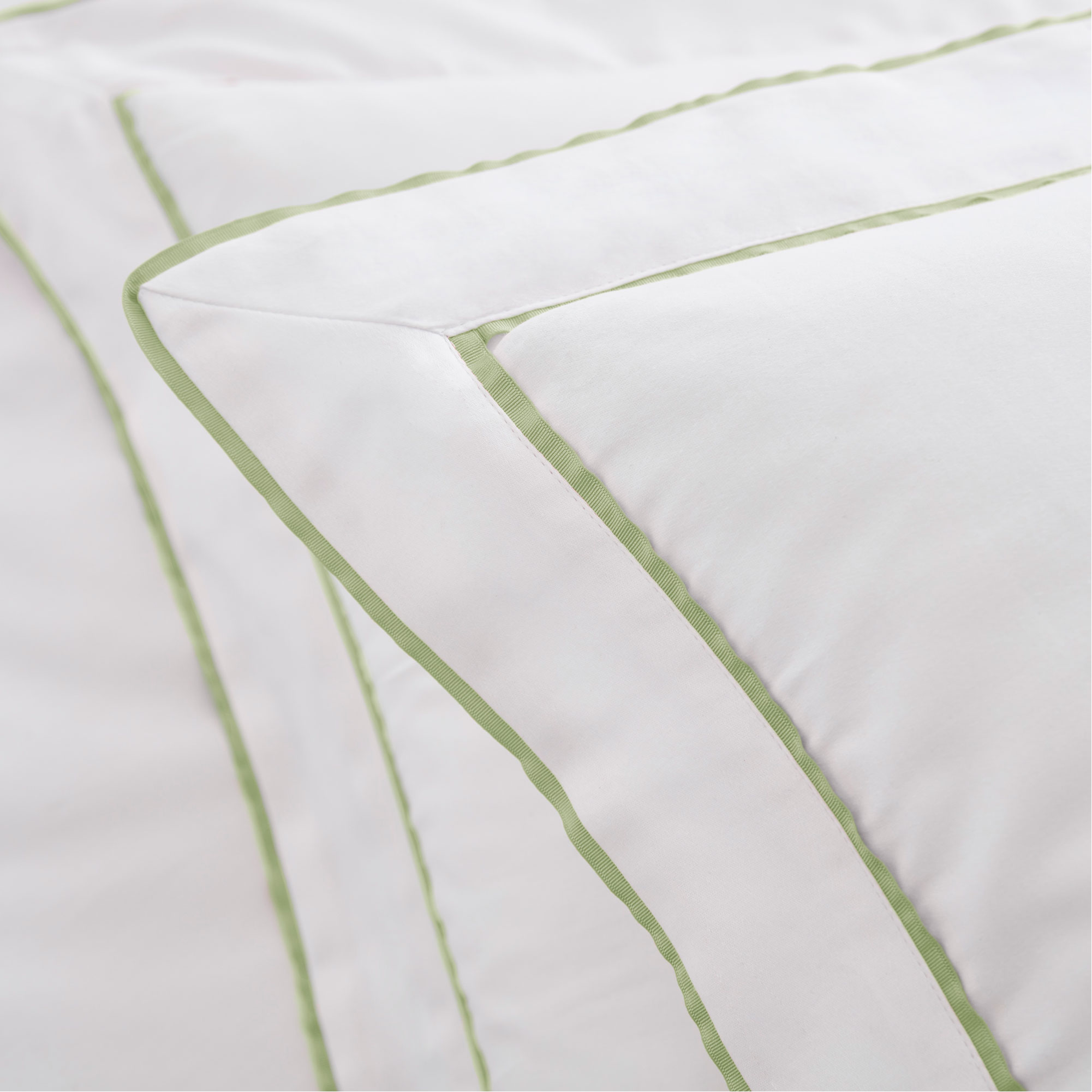 Beautifully created with contemporary styling and classic design in soft yet densely woven 400 Thread Count cotton. In white with embellished oxford edges with two rows of tape in on trend Sage colour. Available in a selection of Colourways.