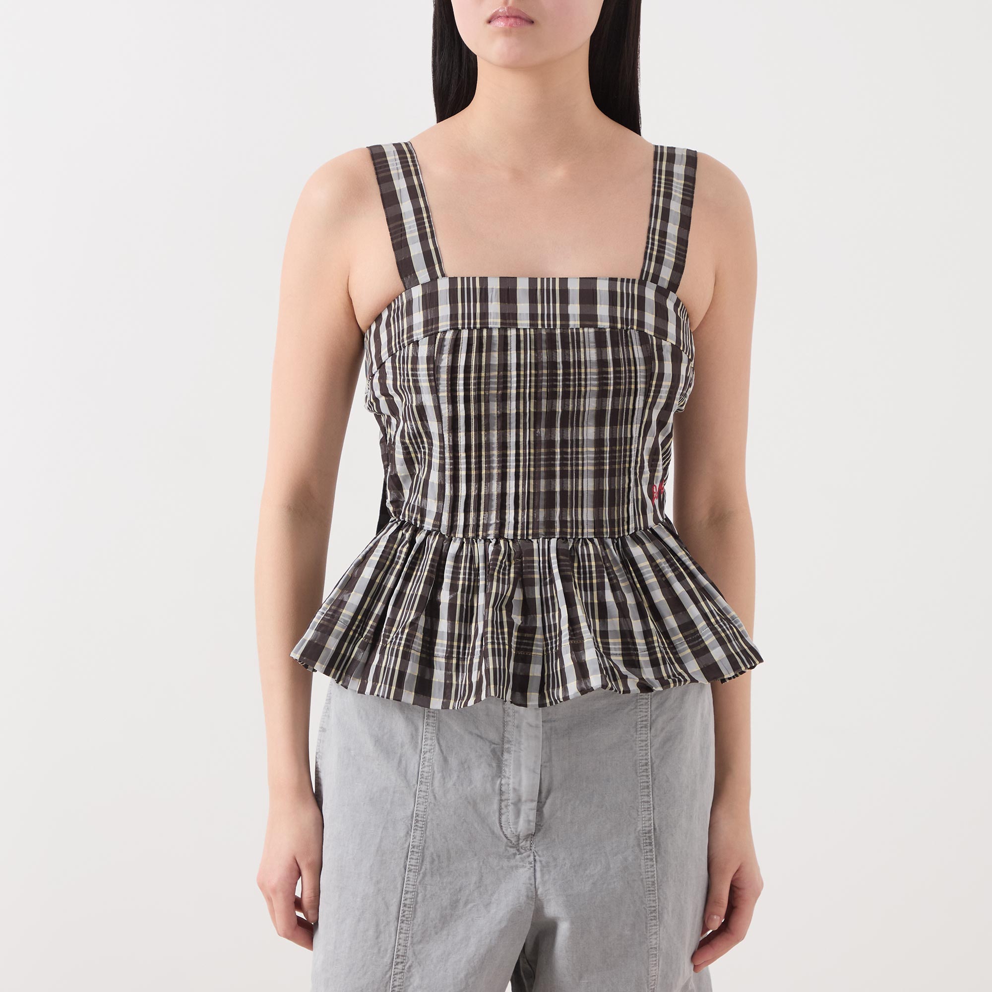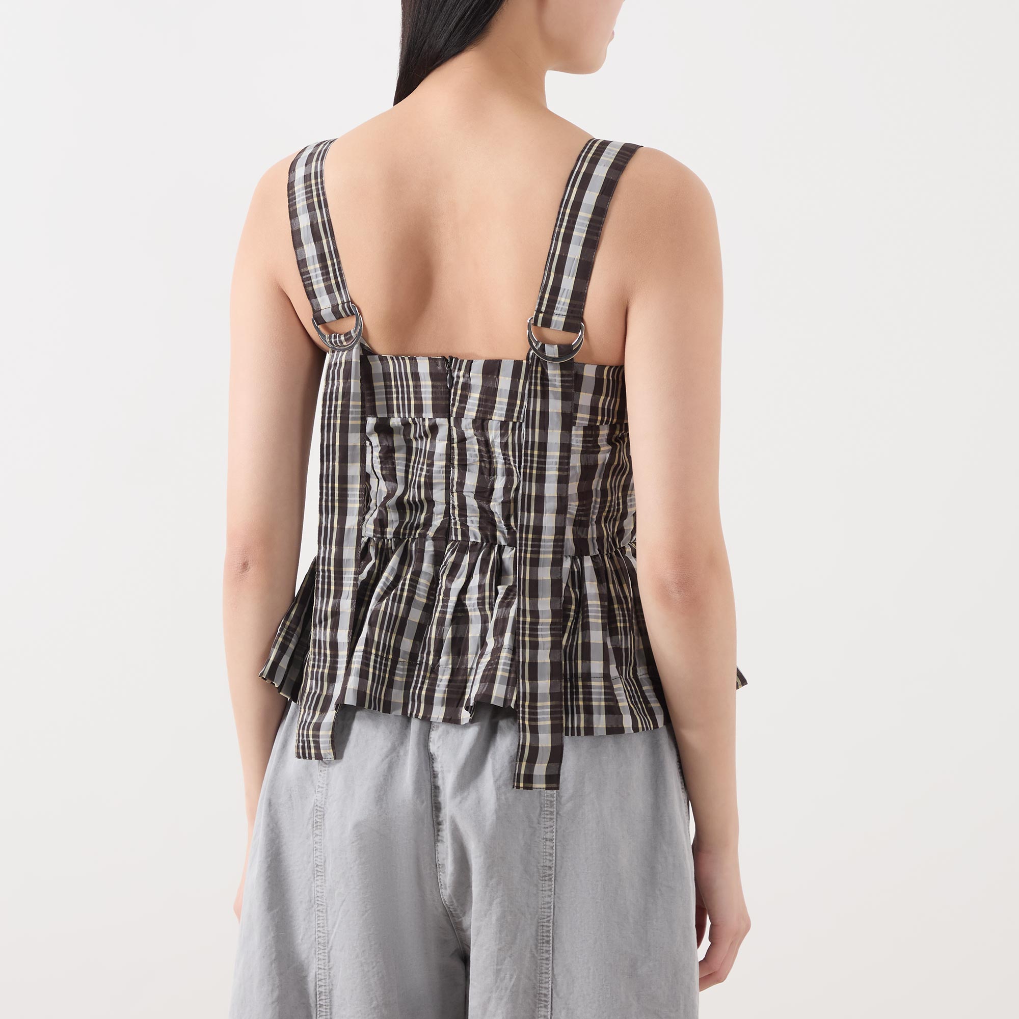 • Straight neckline, wide adjustable straps, rear zip fastening, peplum hem, check print, taffeta fabric