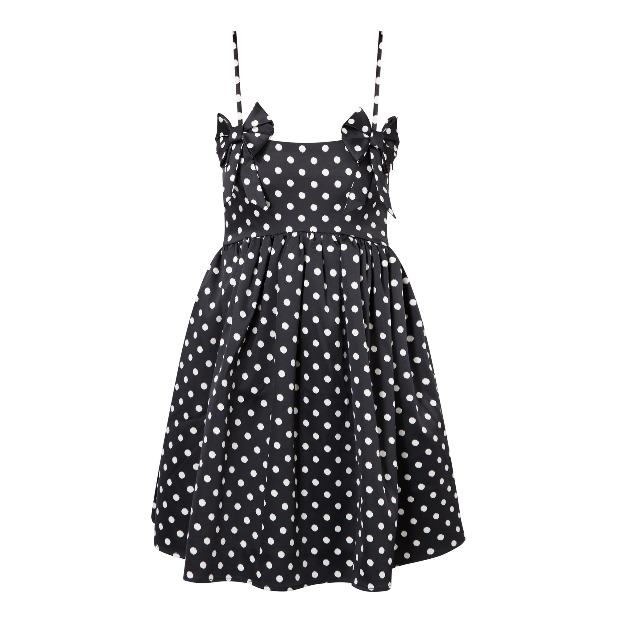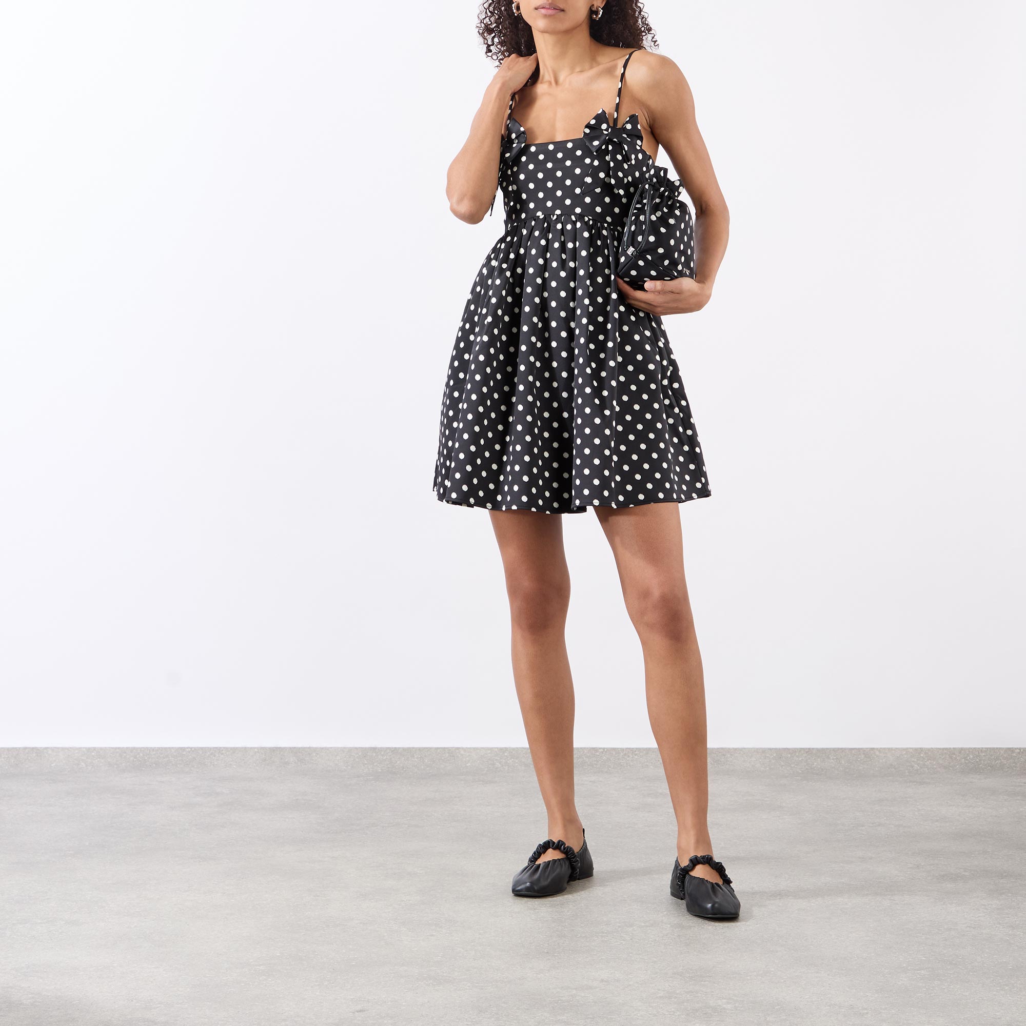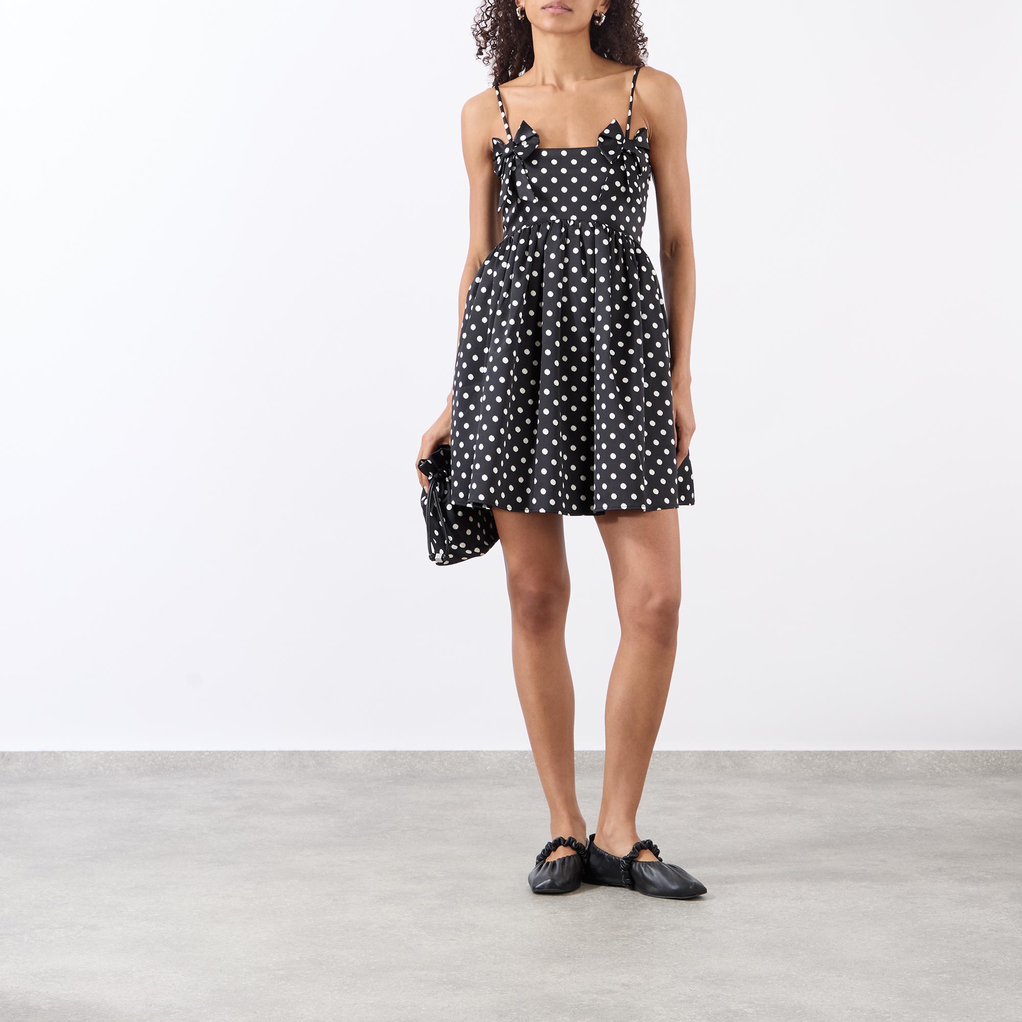 • Straight neckline, fine fixed straps, bow detailing, shirred back, full flared skirt, polka dot pattern, mini length, lined