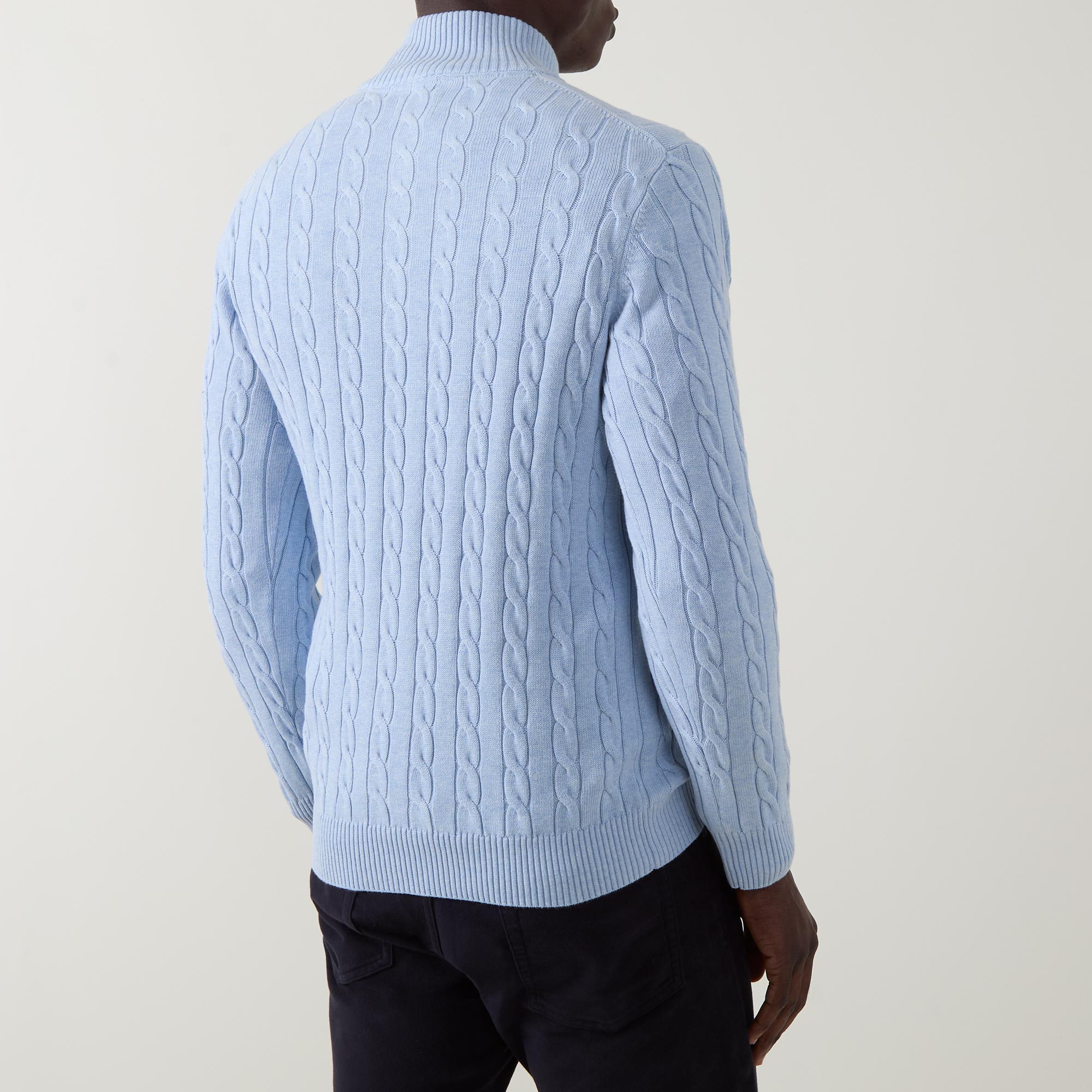 - Stand-up collar, long sleeves, half zip-fastening placket, shield logo embroidery, ribbed trims, cable-knit finish