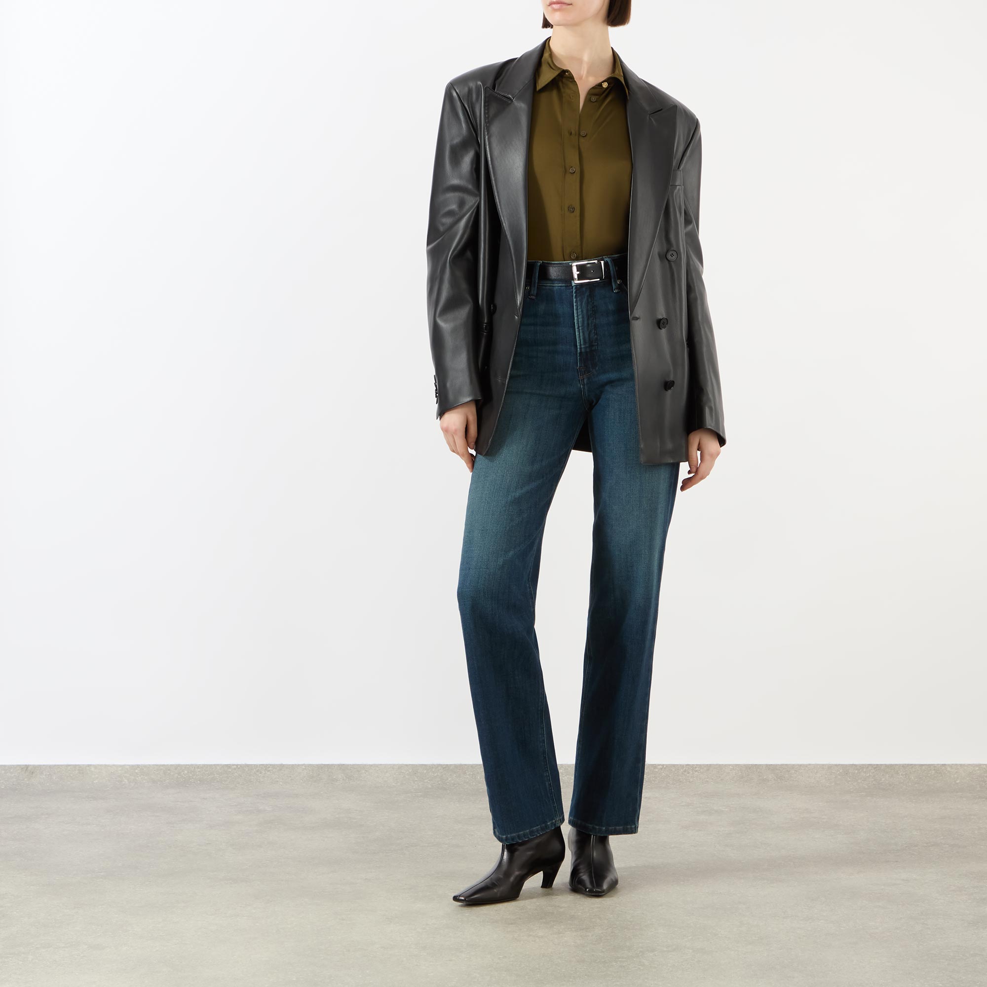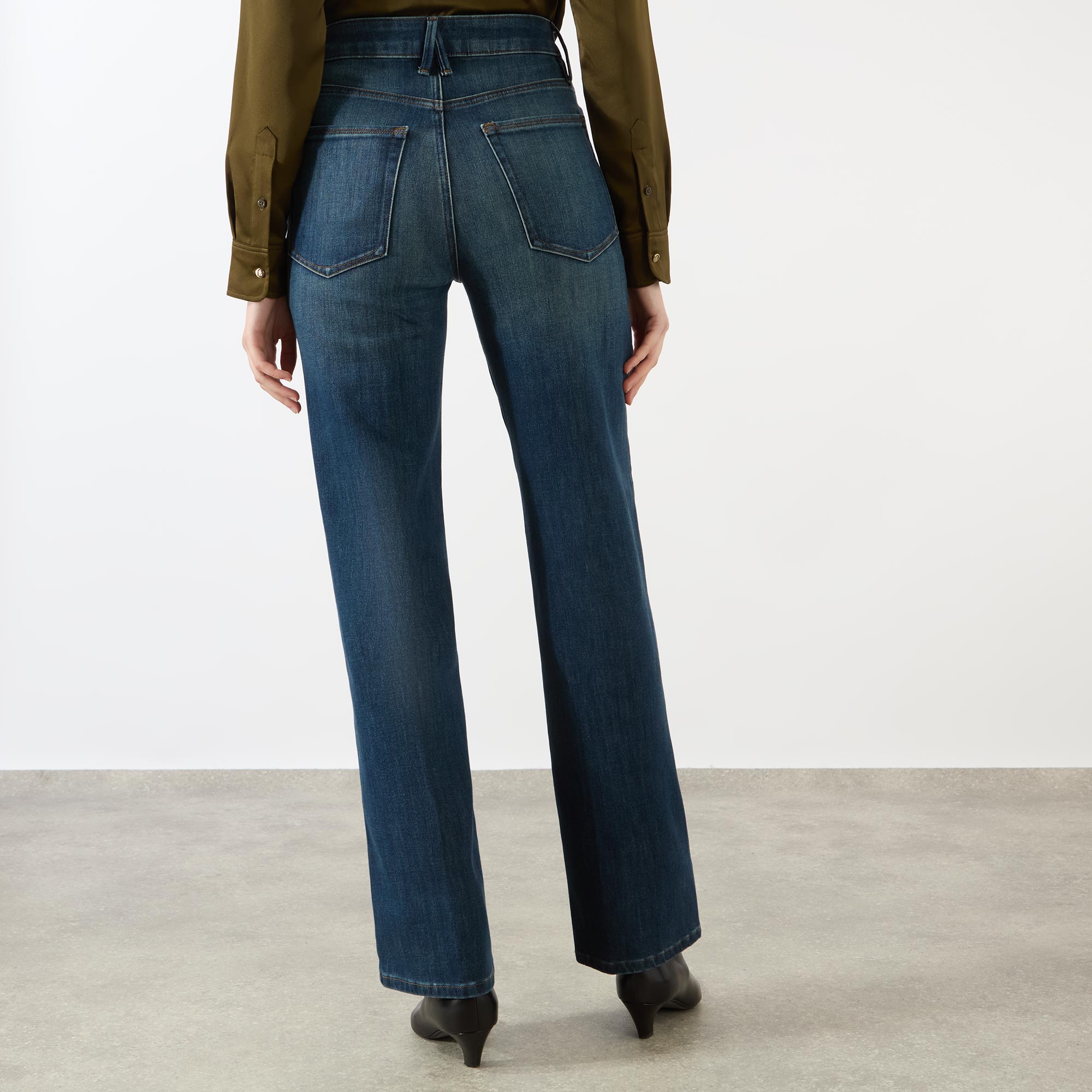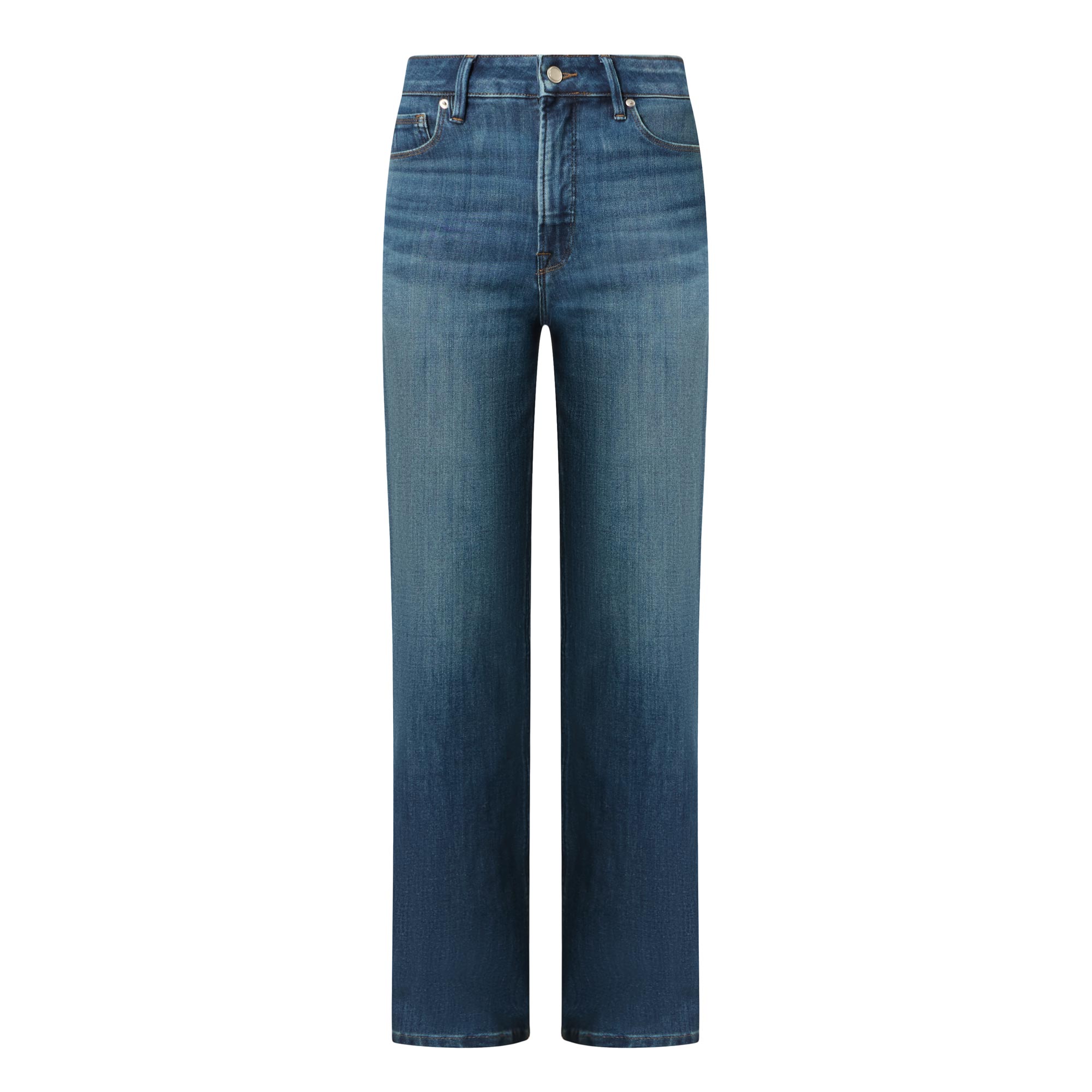 - High rise, straight leg, full length, reinforced belt loops, zip and button fastenings, five-pocket styling, clean hems, tonal stitching, SoftTech denim with subtle stretch, gap-proof waistband, tummy smoothing technology, dark wash finish