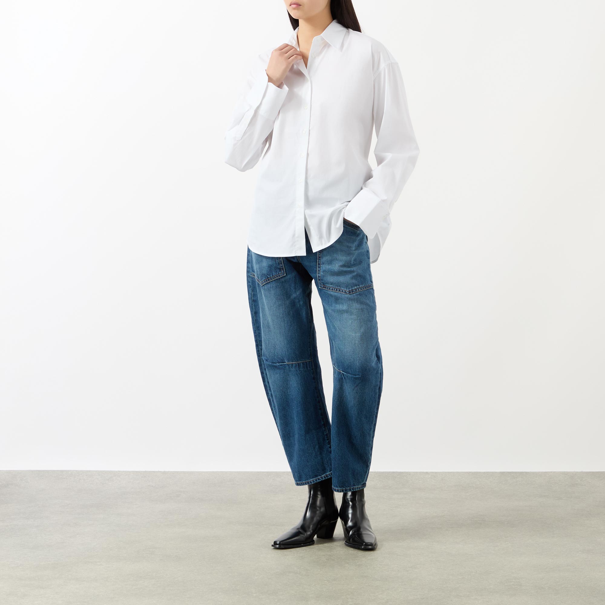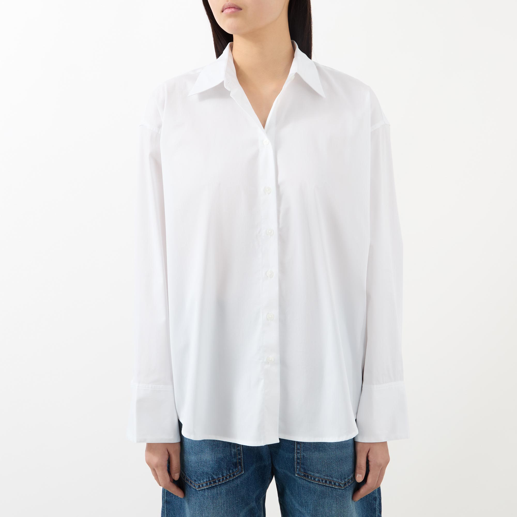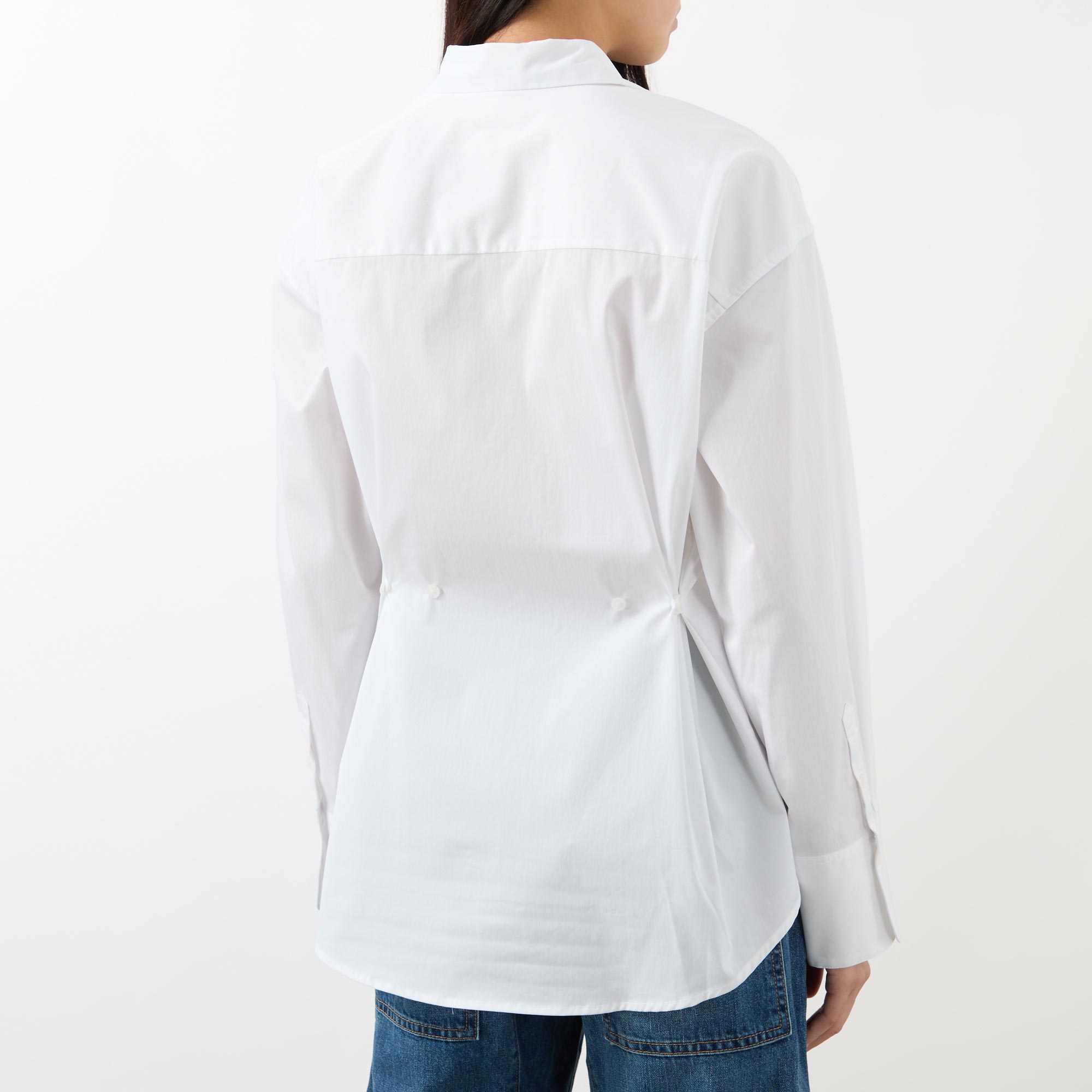 • Point collar, long sleeves with dart detailing, extended cuffs, front button fastening, functional back tie, rear cut out