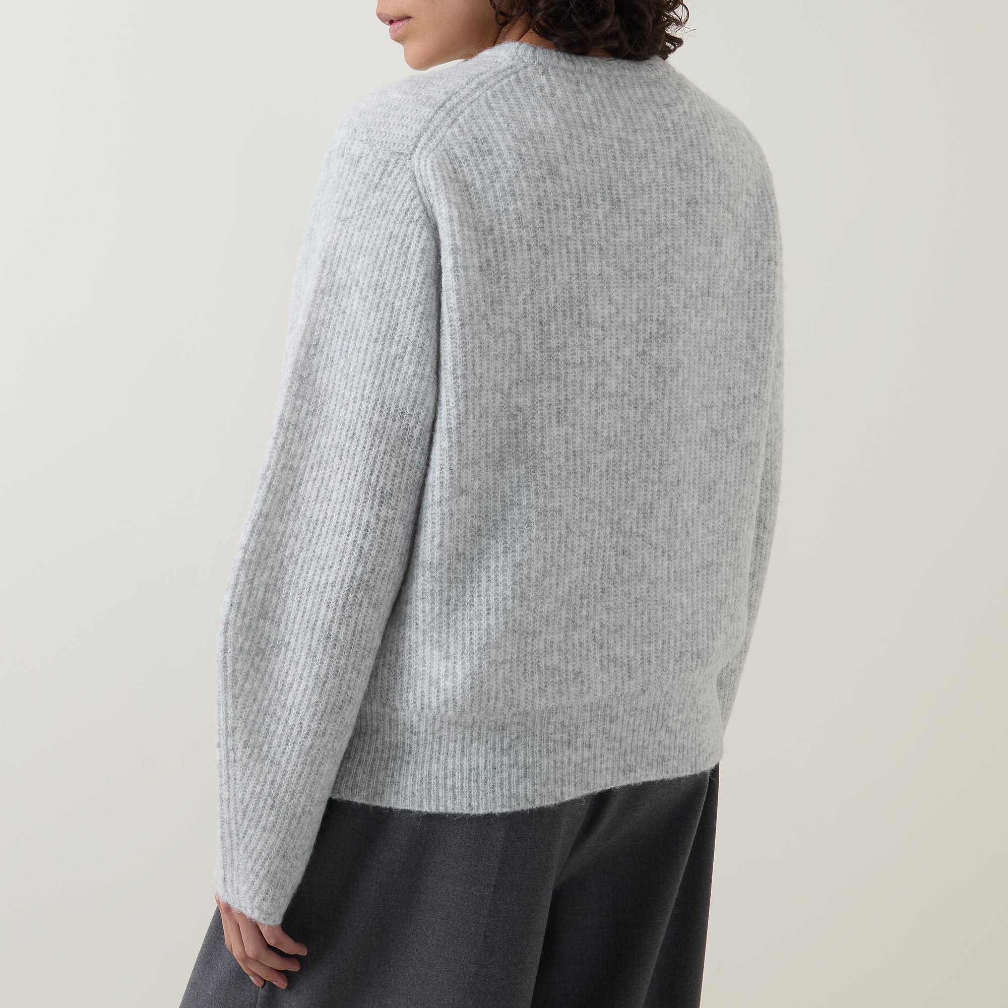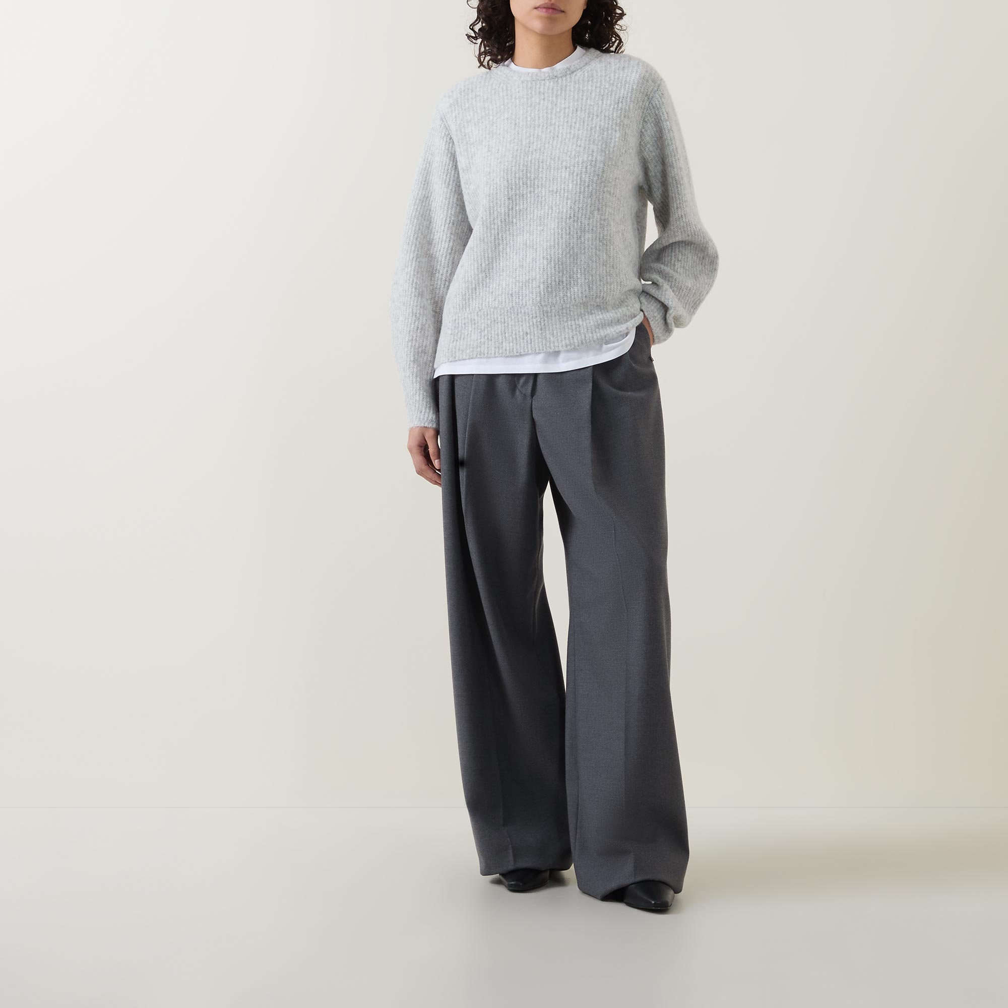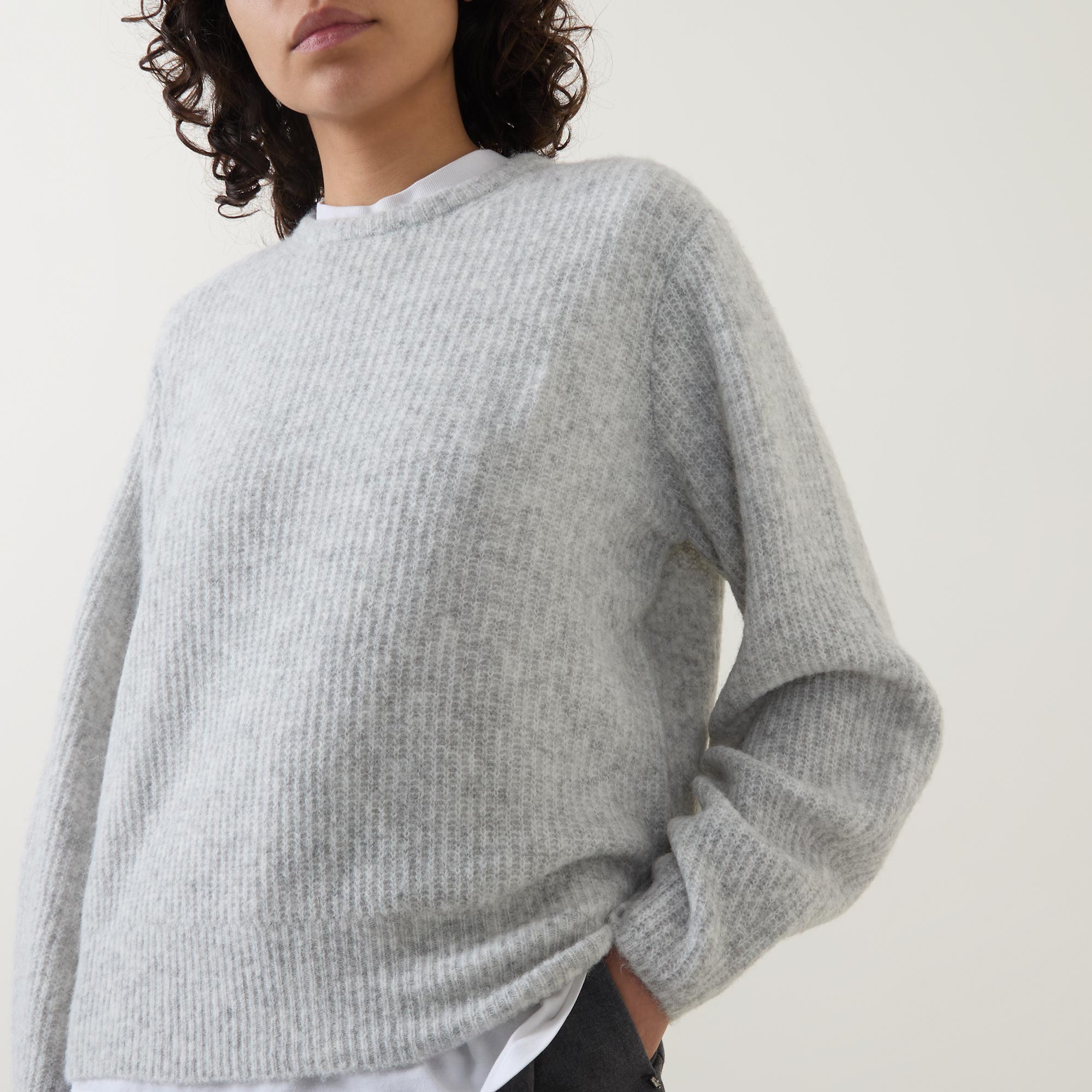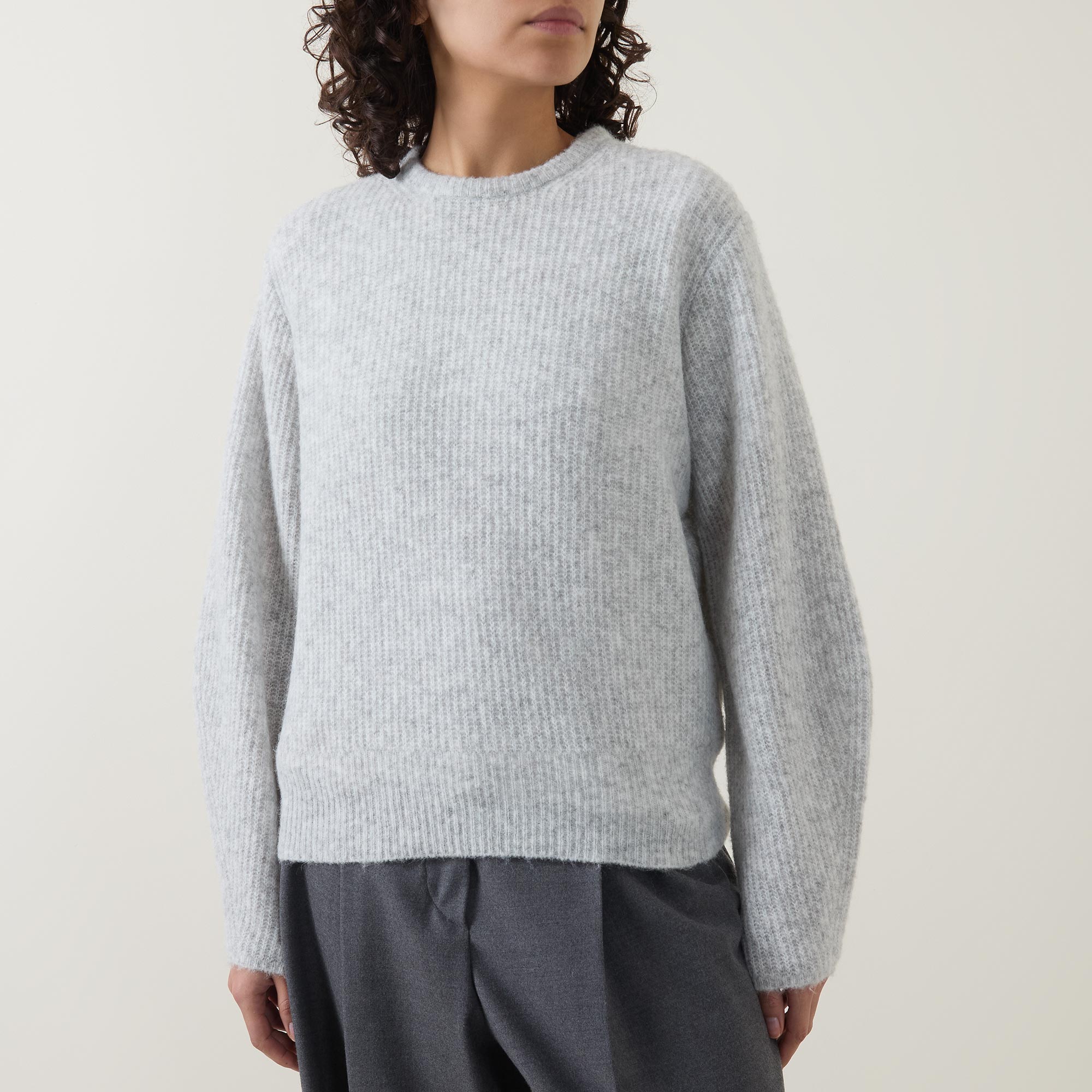 - Crew neckline, long sleeves, ribbed trims, straight hemline, rib knit