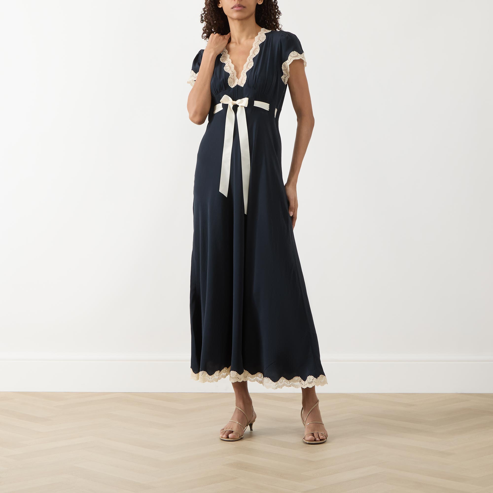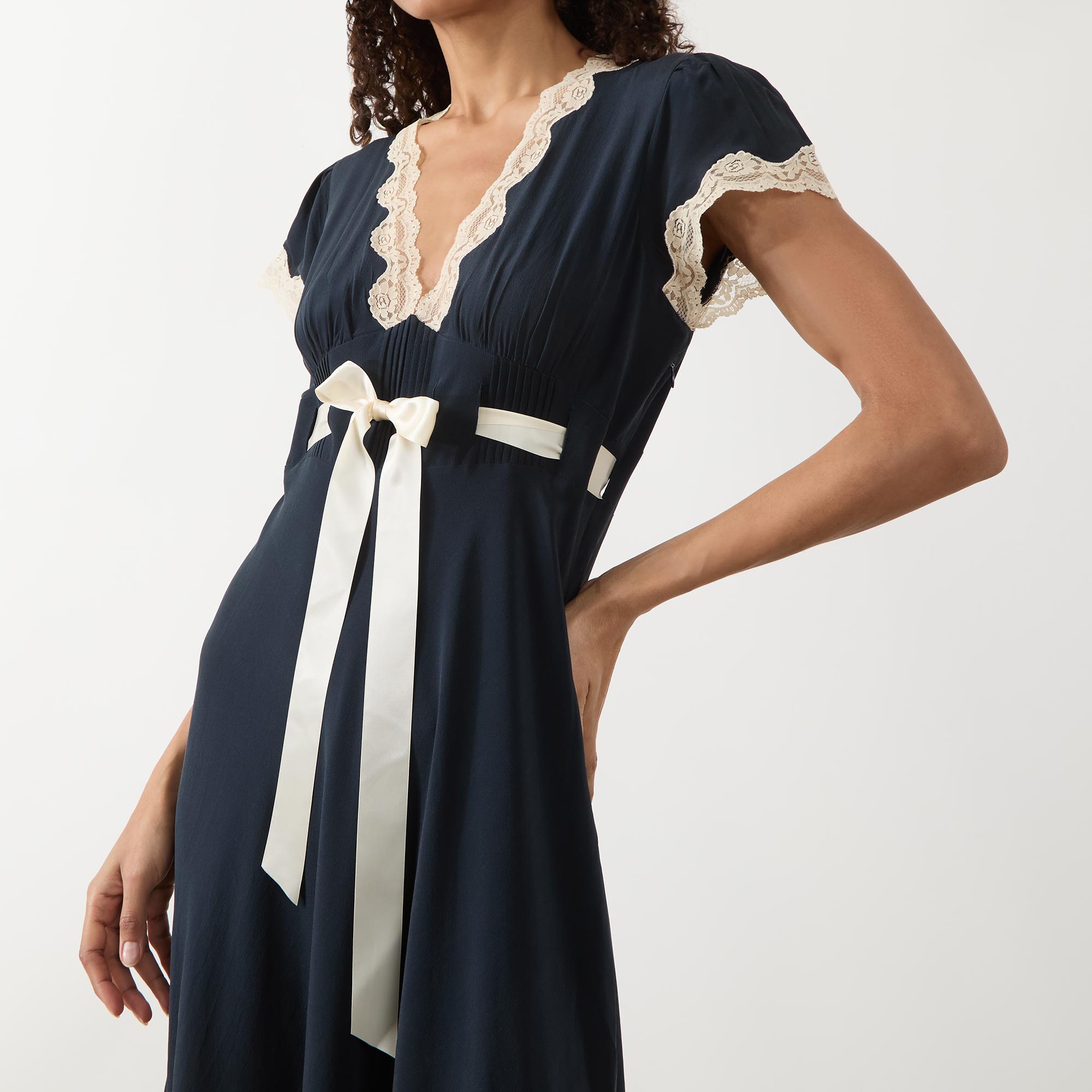 - Short sleeves, V-neckline, delicate lace trim, sash bow, flared silhouette, midi length, smooth fabric