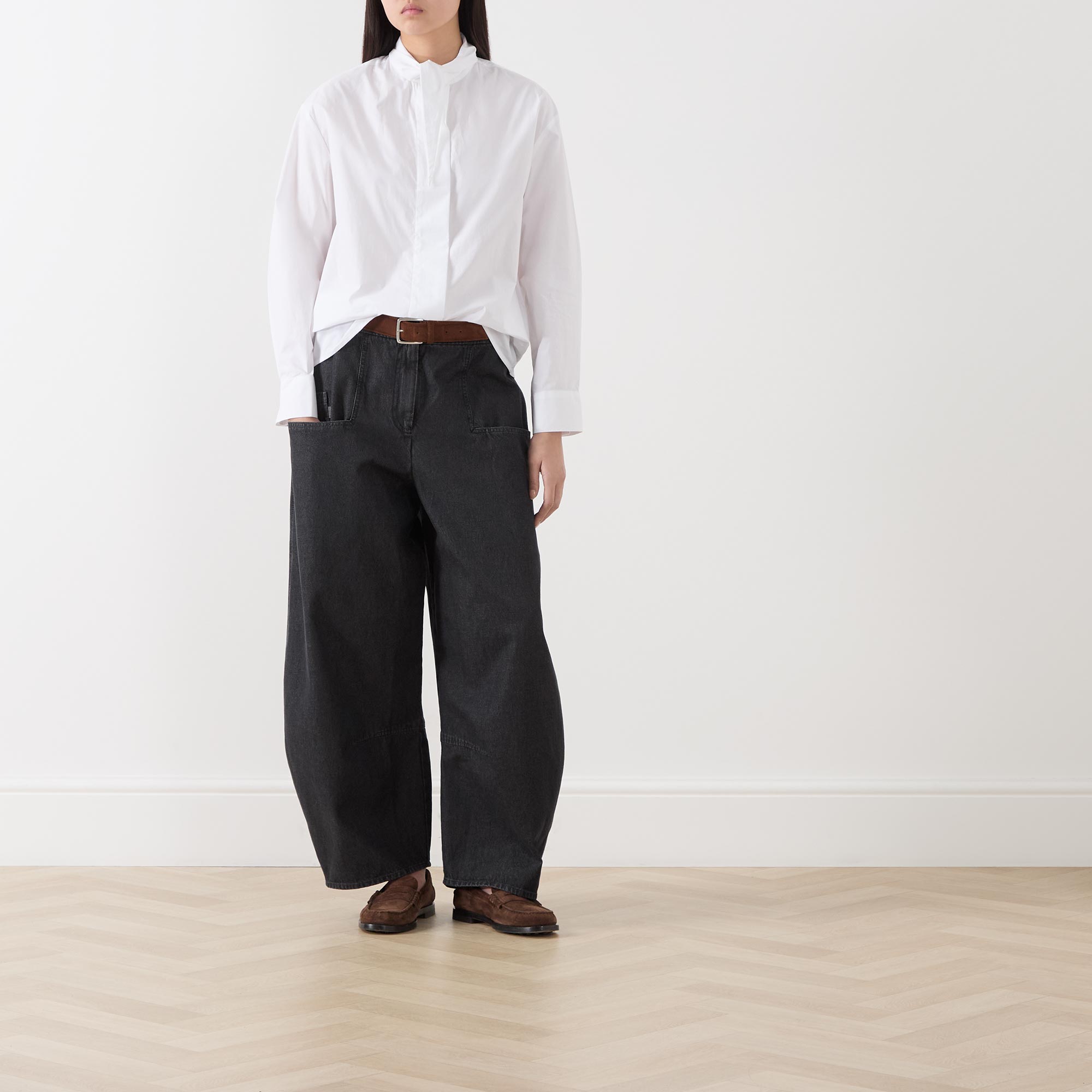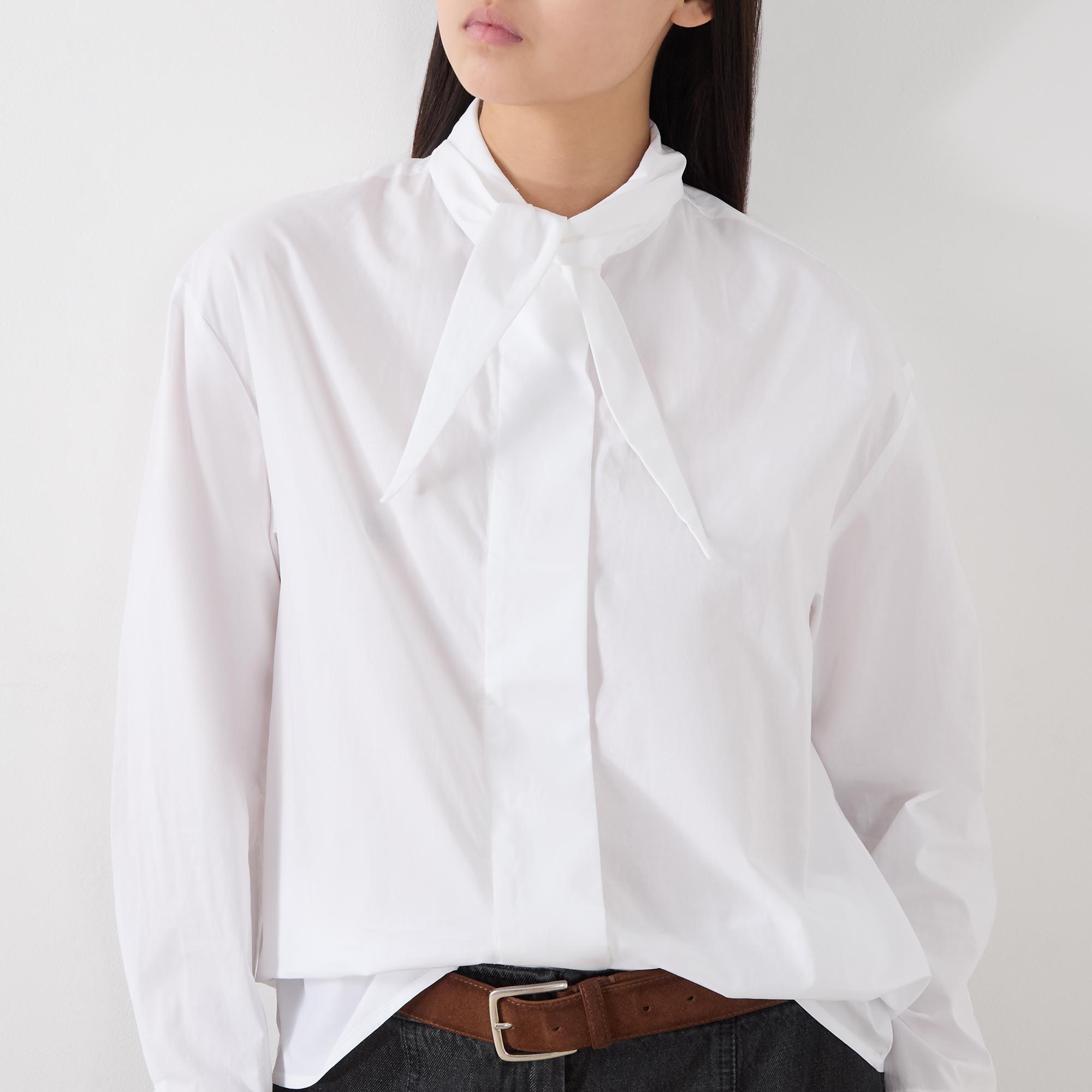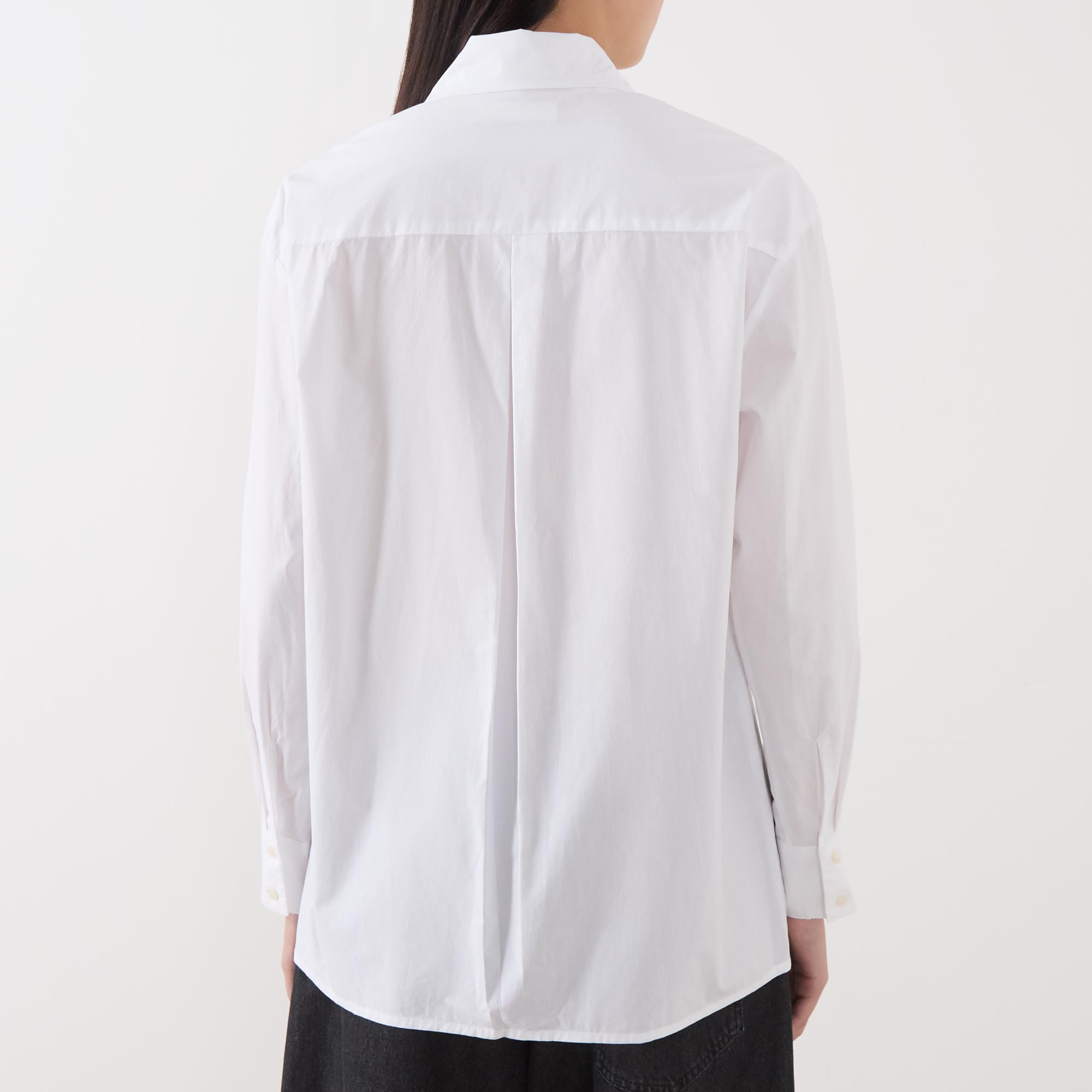 - Elongated point collar, dropped shoulders, long sleeves, buttoned cuffs, concealed front placket, curved hem, rear knife pleat, crisp finish