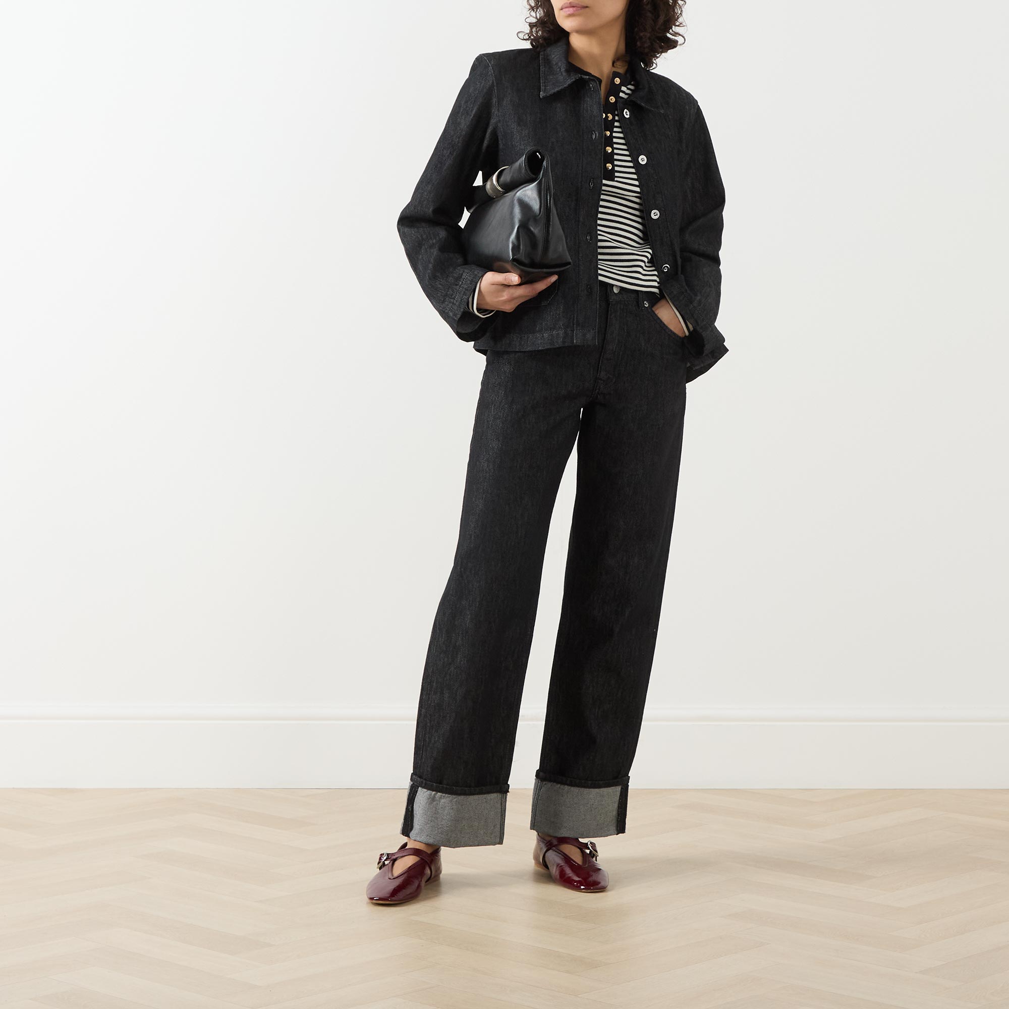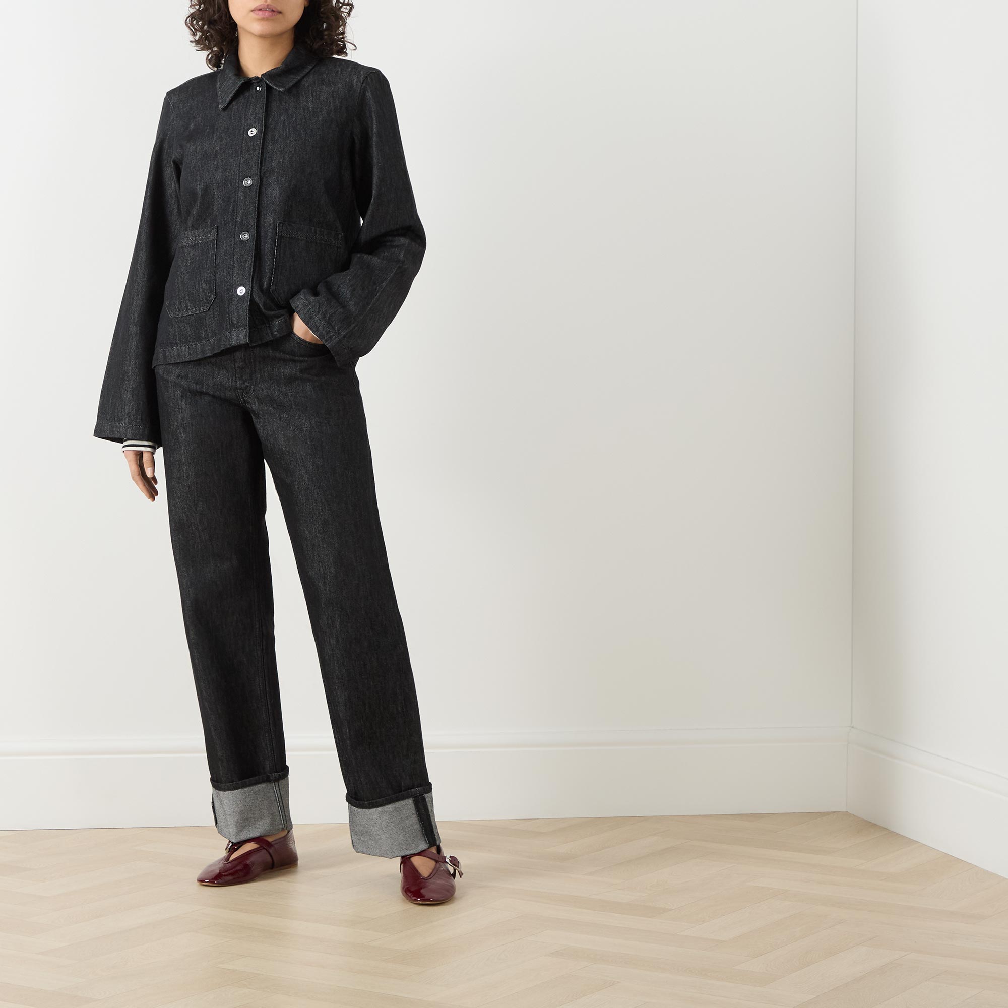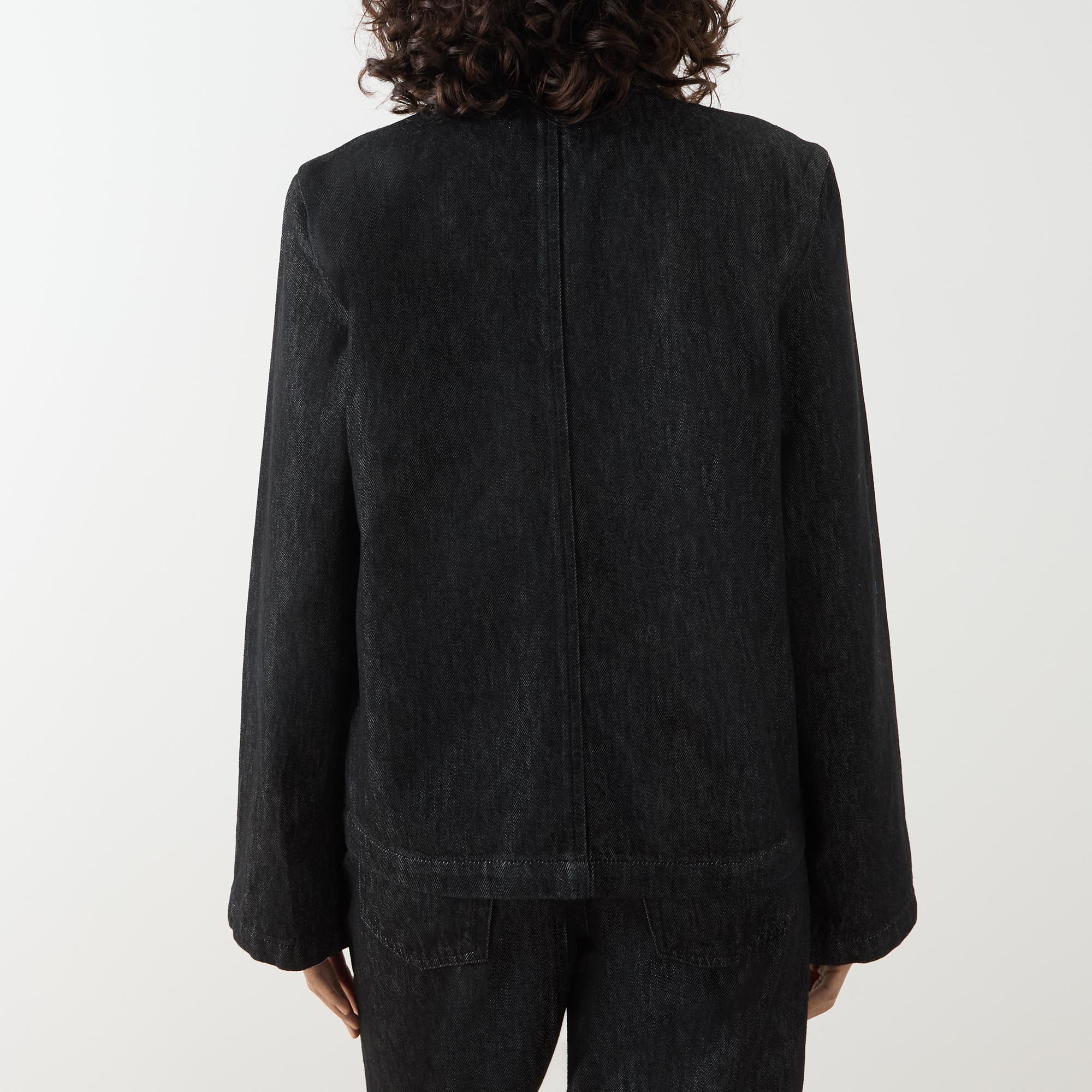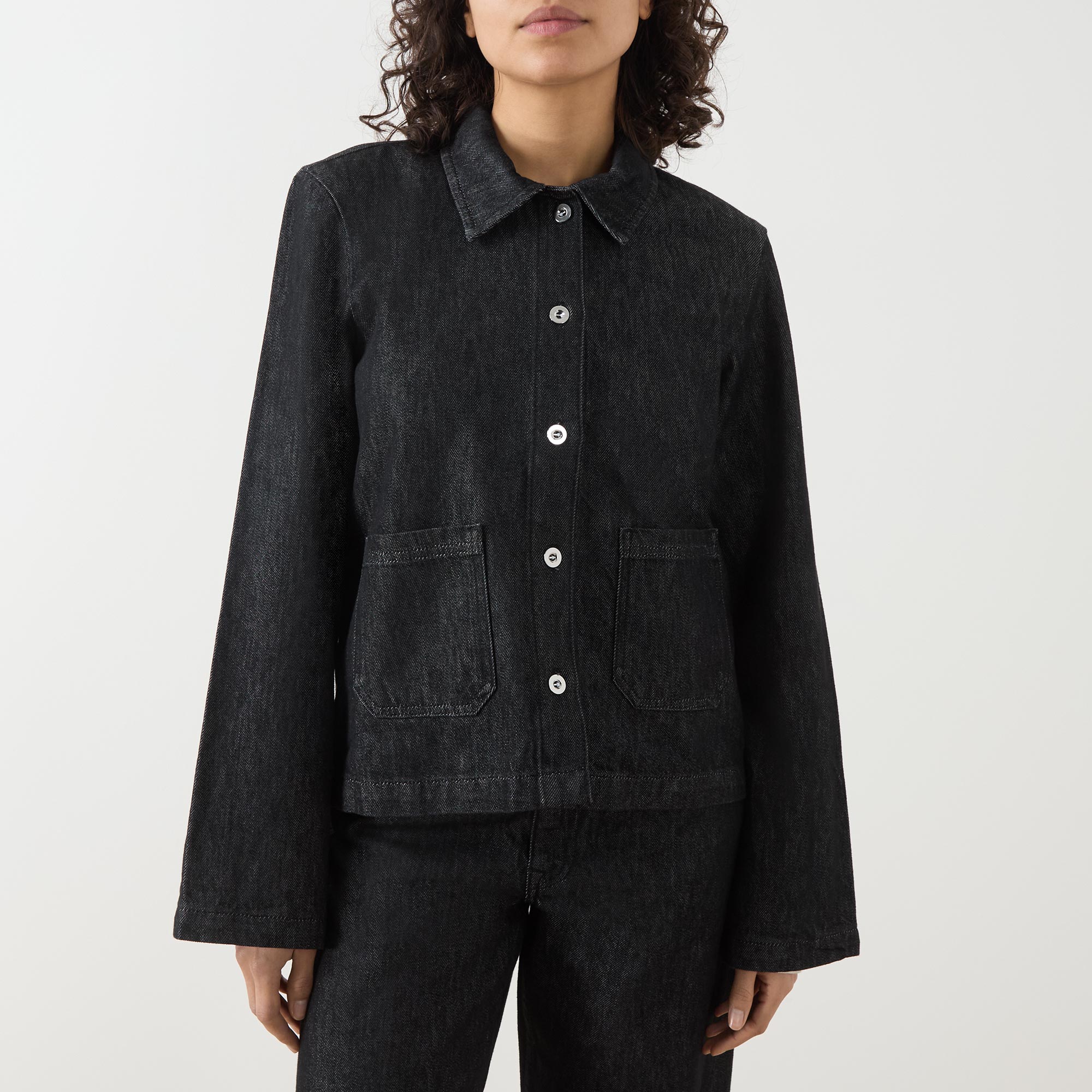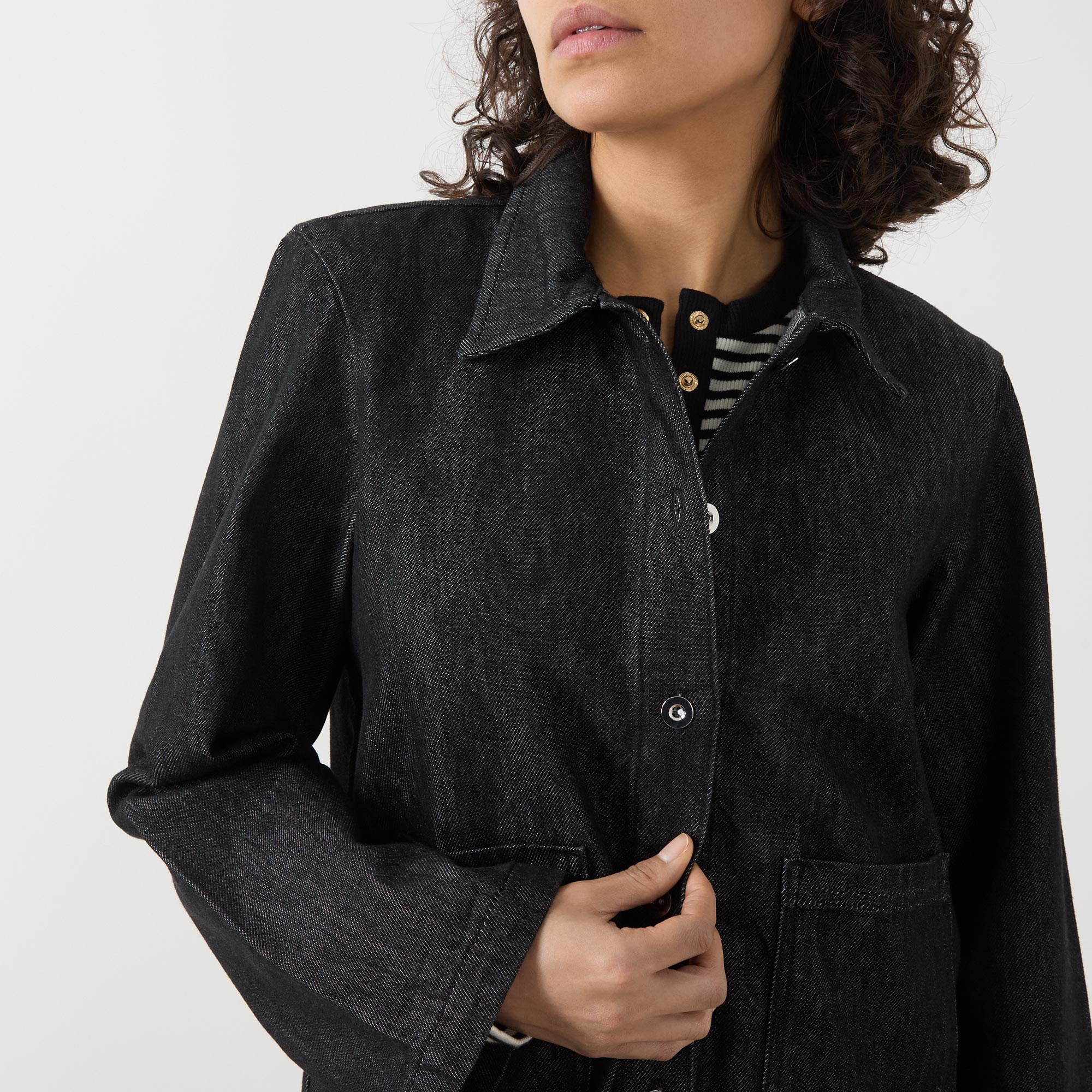 - Point collar, long sleeves, front button placket, two side patch pockets, tonal stitching, straight hemline, smooth denim finish