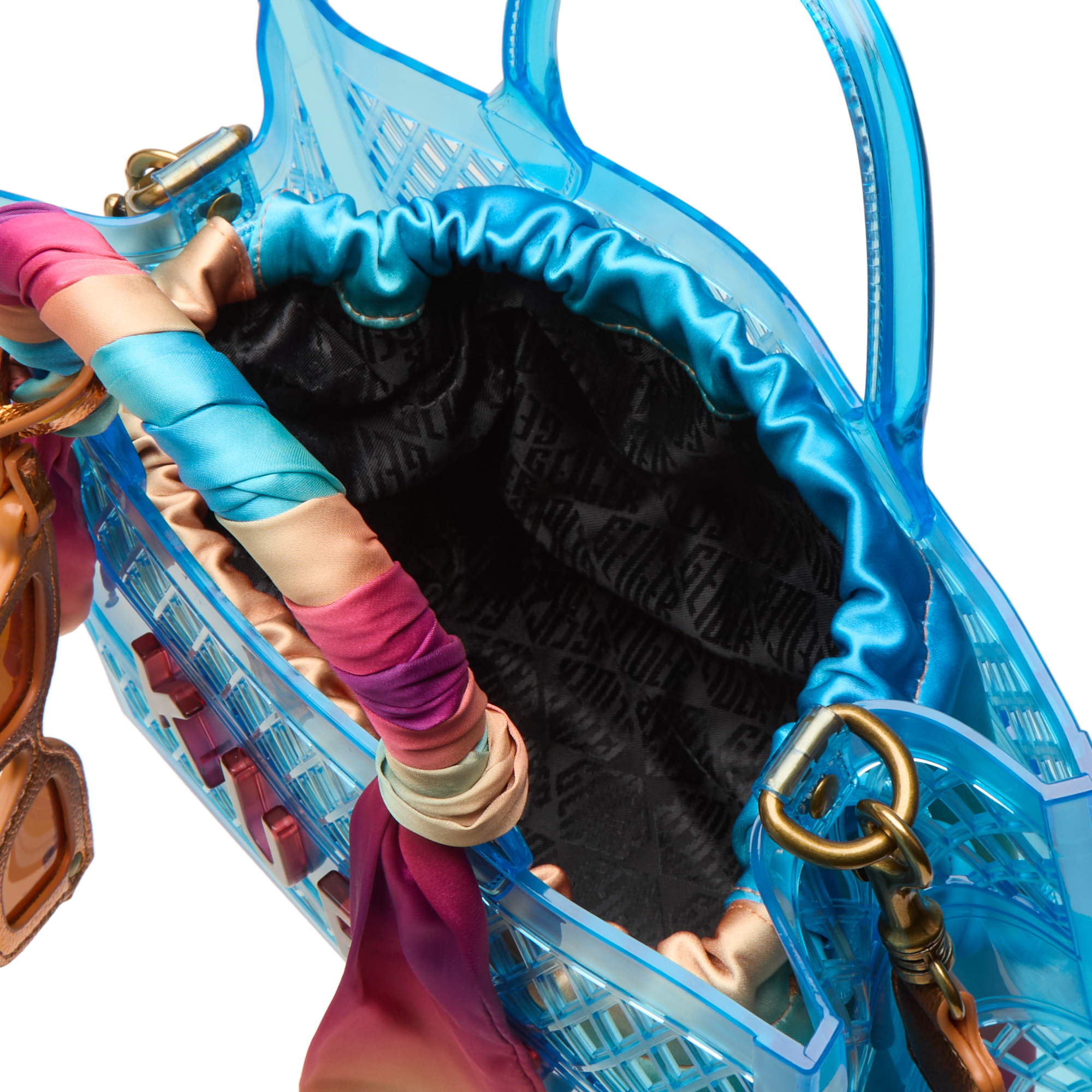 - Top carry handle, detachable and adjustable branded crossbody strap, laser-cut jelly outer, drawstring fastening pouch on interior: logo details, sunglasses keyring, scarf embellishment