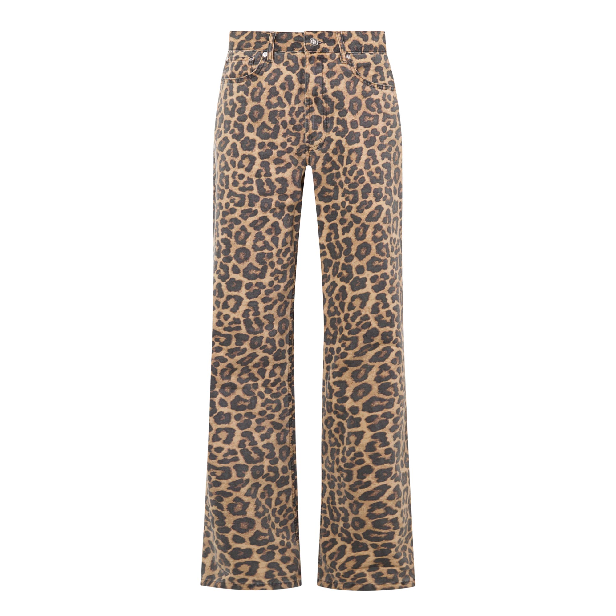 • Mid rise, straight leg, full length, belt loops, five-pocket styling, clean hems, logo badge, leopard print pattern