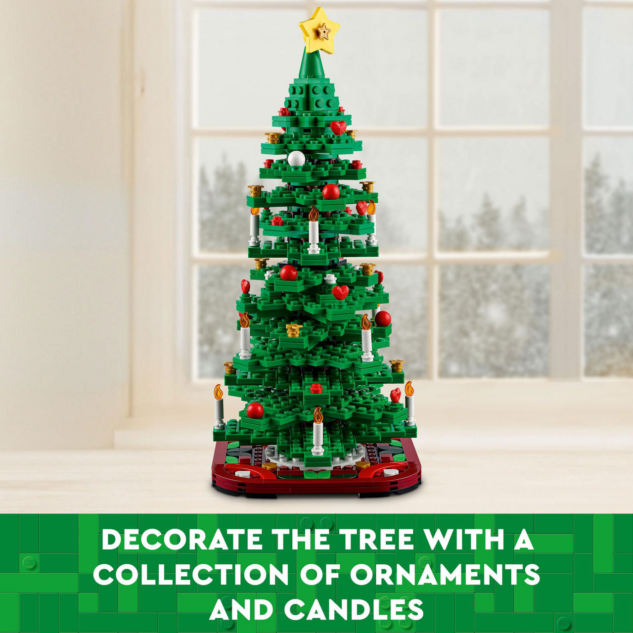 Create an eye-catching festive display with this beautiful LEGO® Christmas Tree building kit. A perfect gift this holiday season, you can choose between building one tree or two smaller tree models. Decorate your very own miniature Christmas tree with colourful ornaments and candles. Add the yellow star to the top for the perfect finishing touch. Display your finished build on the red tree skirt for a beautiful holiday centrepiece or table top decoration.