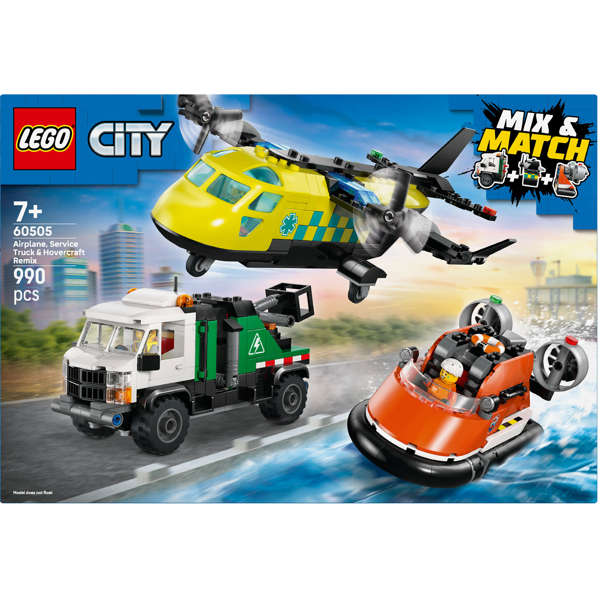 • Set includes: 990 pieces, Toy airplane, service truck and hovercraft playset, 3 mix-and-match rescue vehicles, medic, coast guard and mountain rescuer minifigures, modular design