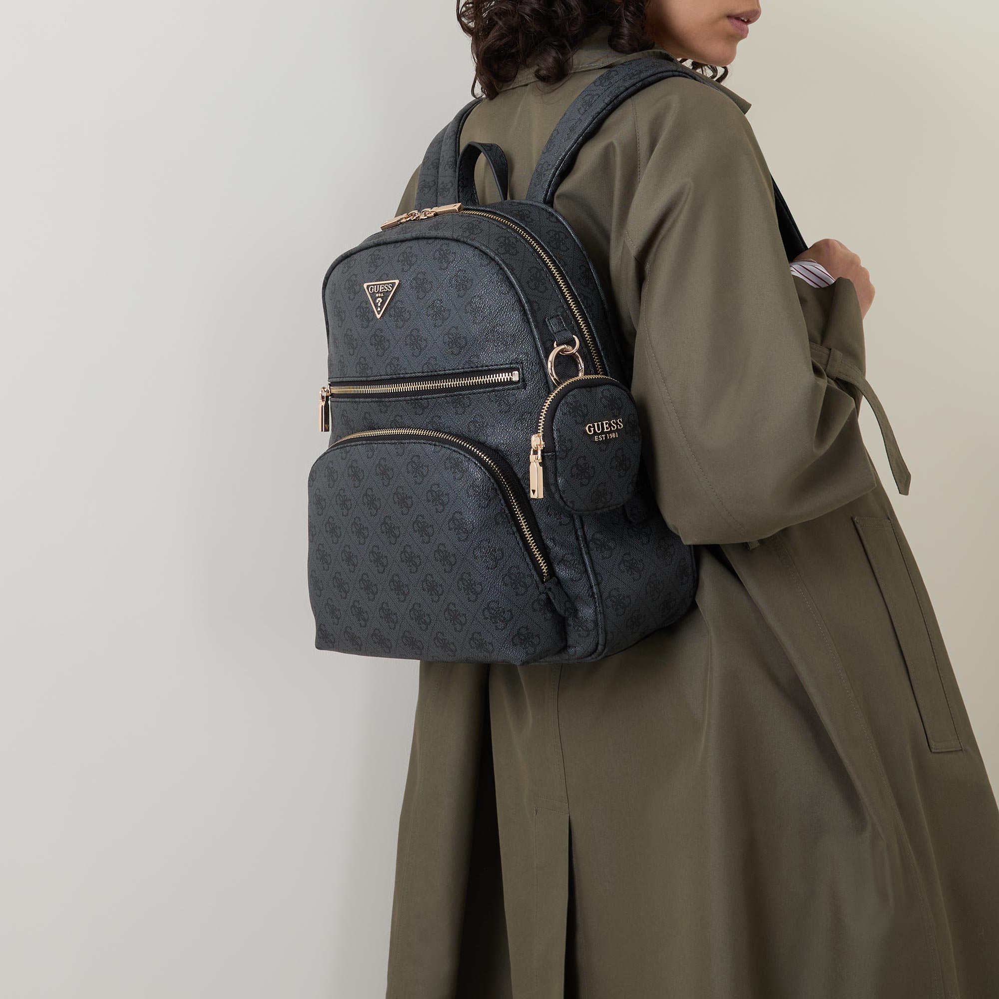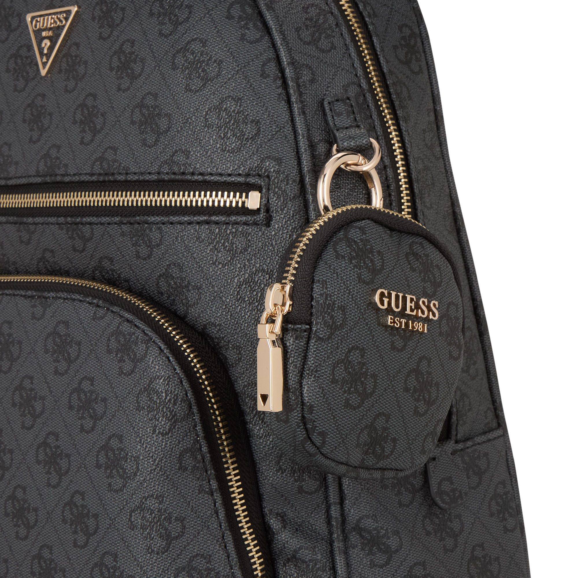 - Carry handle, dual zip fastening, one front pocket with zip fastening, one front compartment, adjustable straps, triangle logo hardware, gold-tone finishes, tonal stitching, 4G logo design, textured finish, detachable pouch