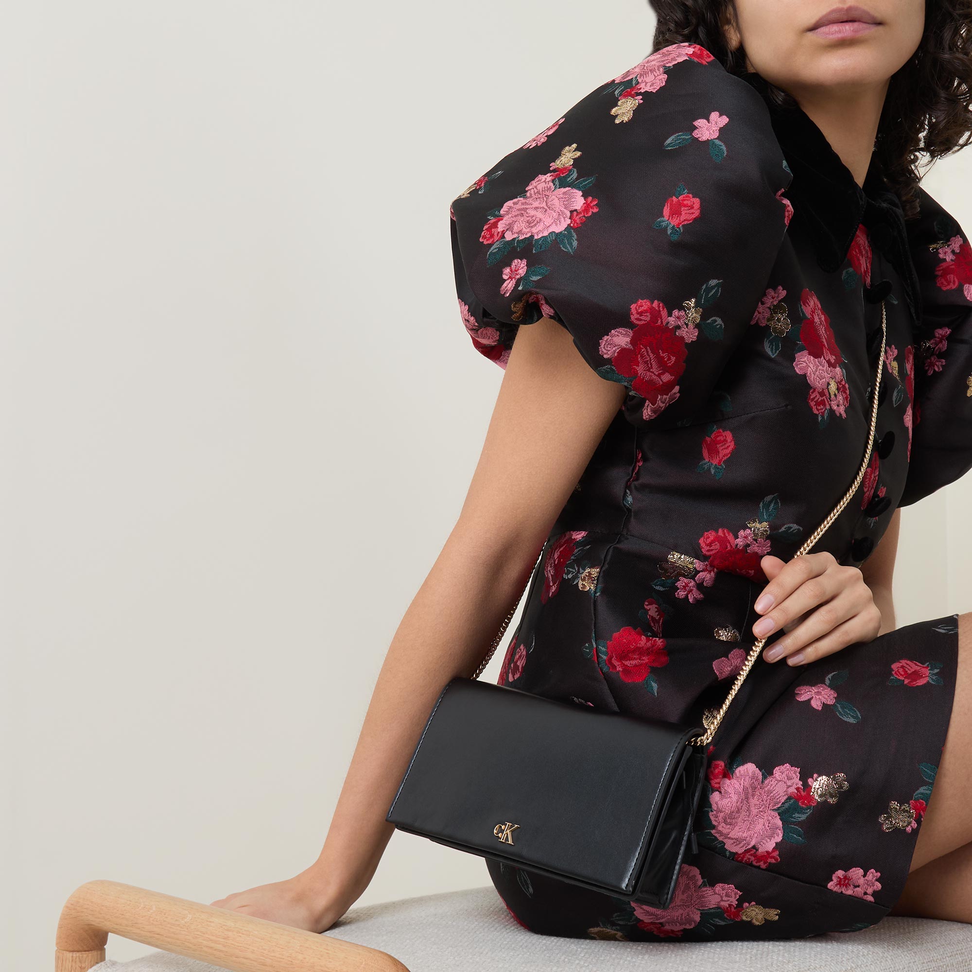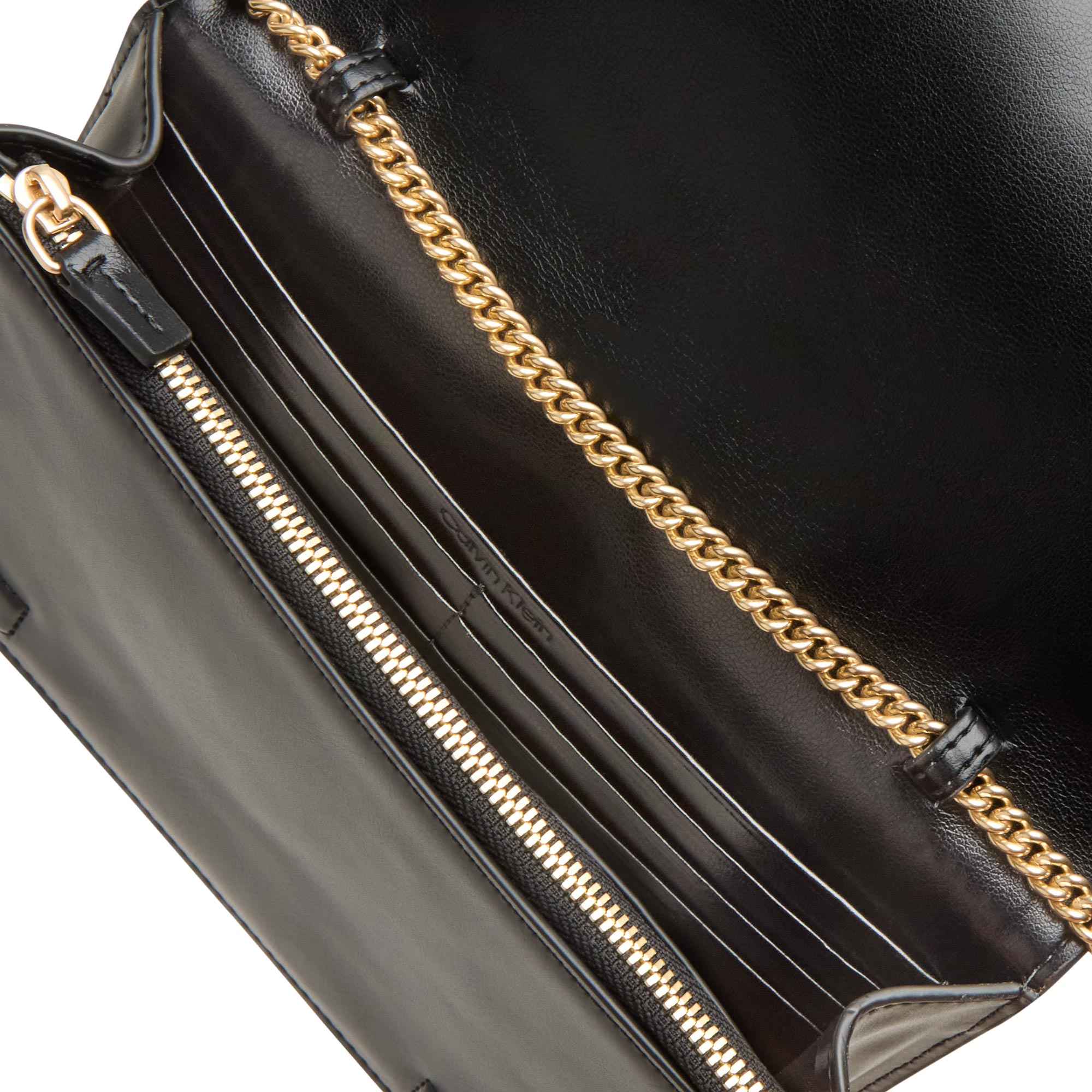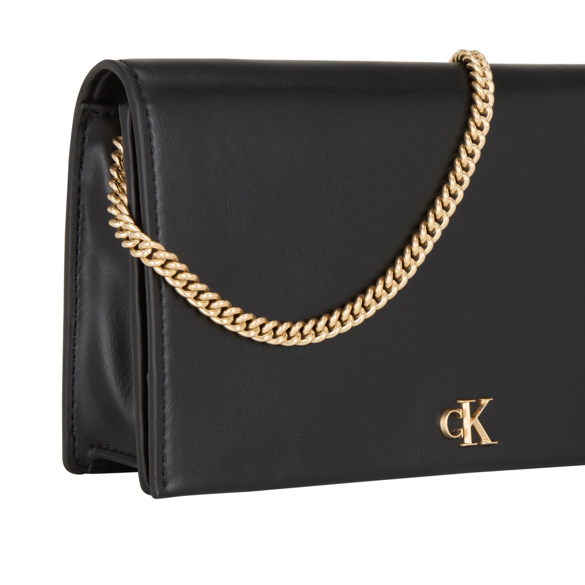- Fold over flap closure, magnetic fastening, detachable chain strap, CK logo hardware to the front, gold-tone finishes, tonal stitching, smooth leather finish