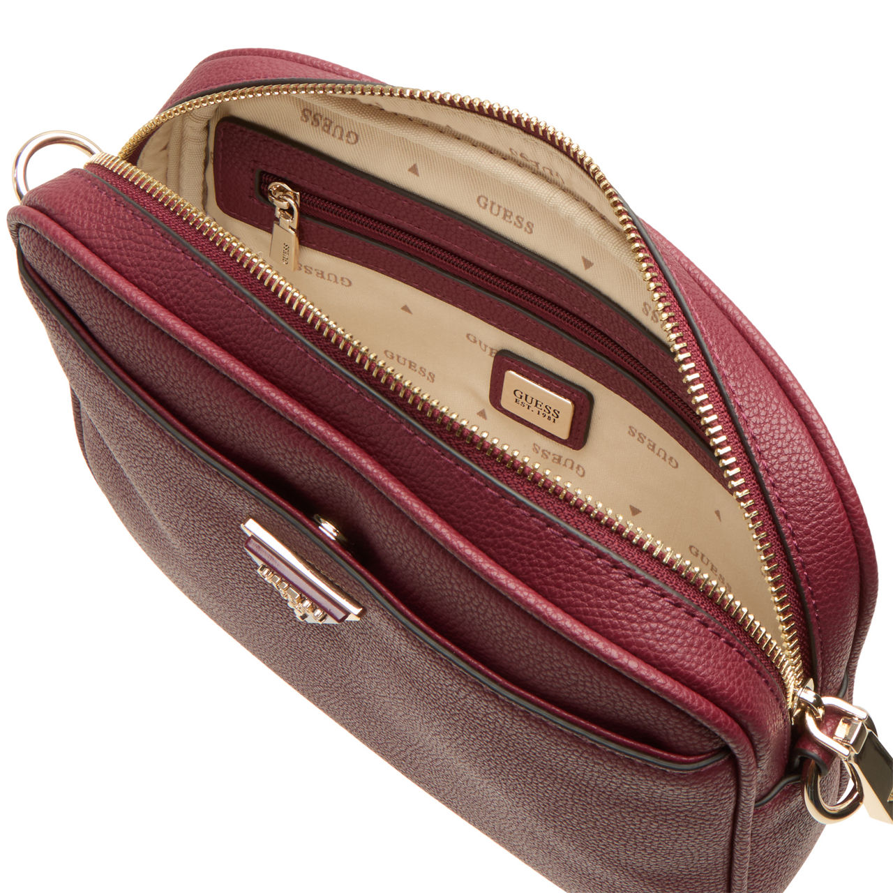 - Top zip fastening, gold-toned hardware, adjustable crossbody strap, logo details. Interior: One main compartment, one zipped slip pocket. Exterior: One slip pocket, one zipped slip pocket to the rear