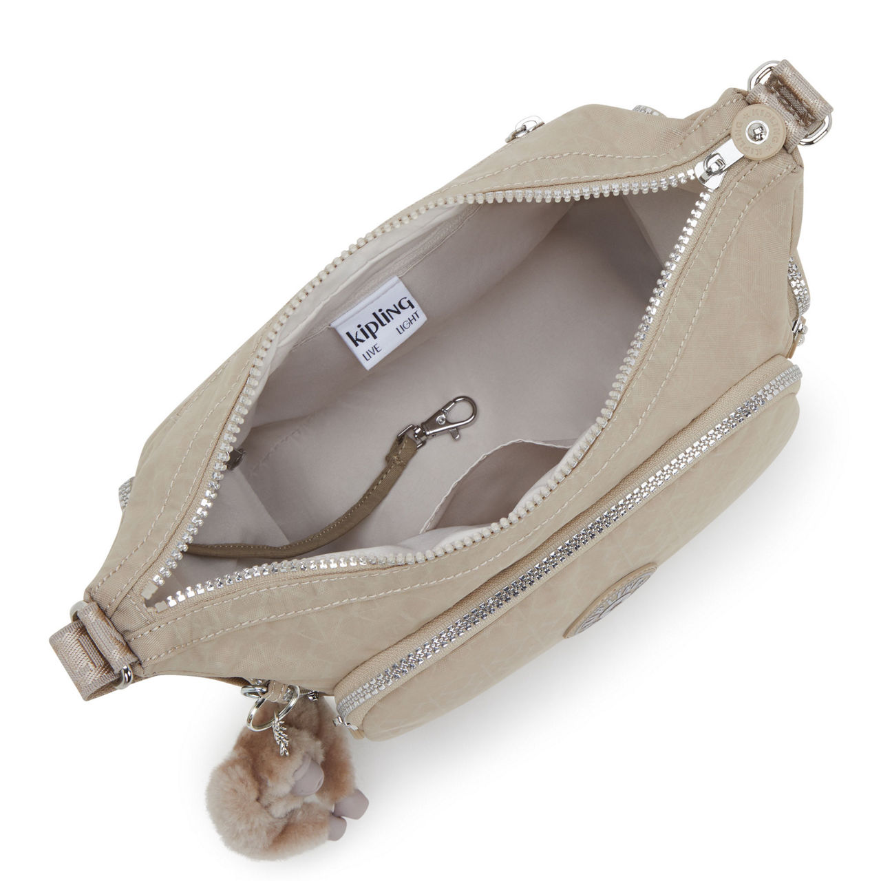 - Top zip-fastening closure, adjustable strap, one zipped outside front pocket, one zipped outside back pocket, two zipped outside side pockets, smaller version of Gabb, rubberised logo to the front, hanging Monkey keycharm